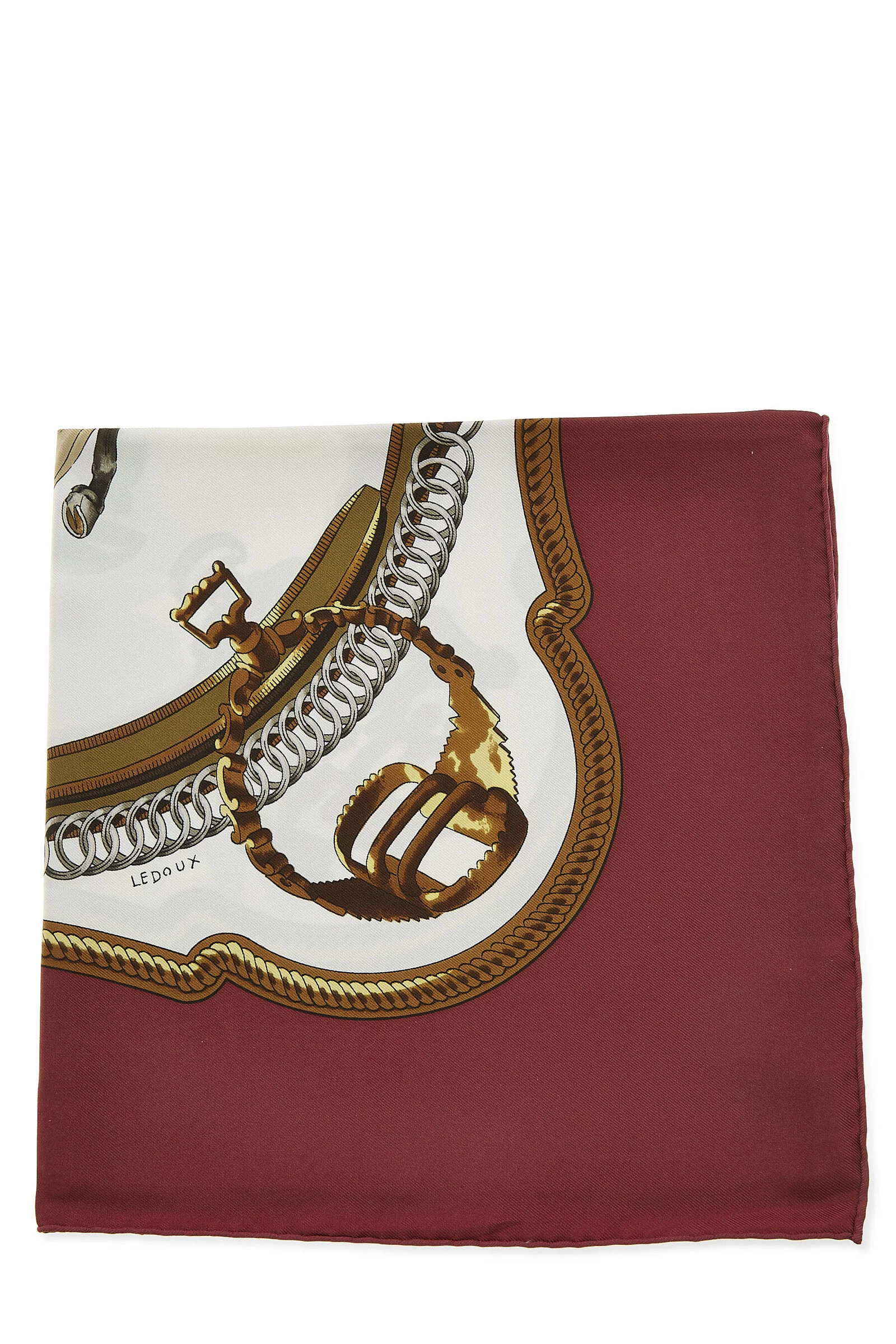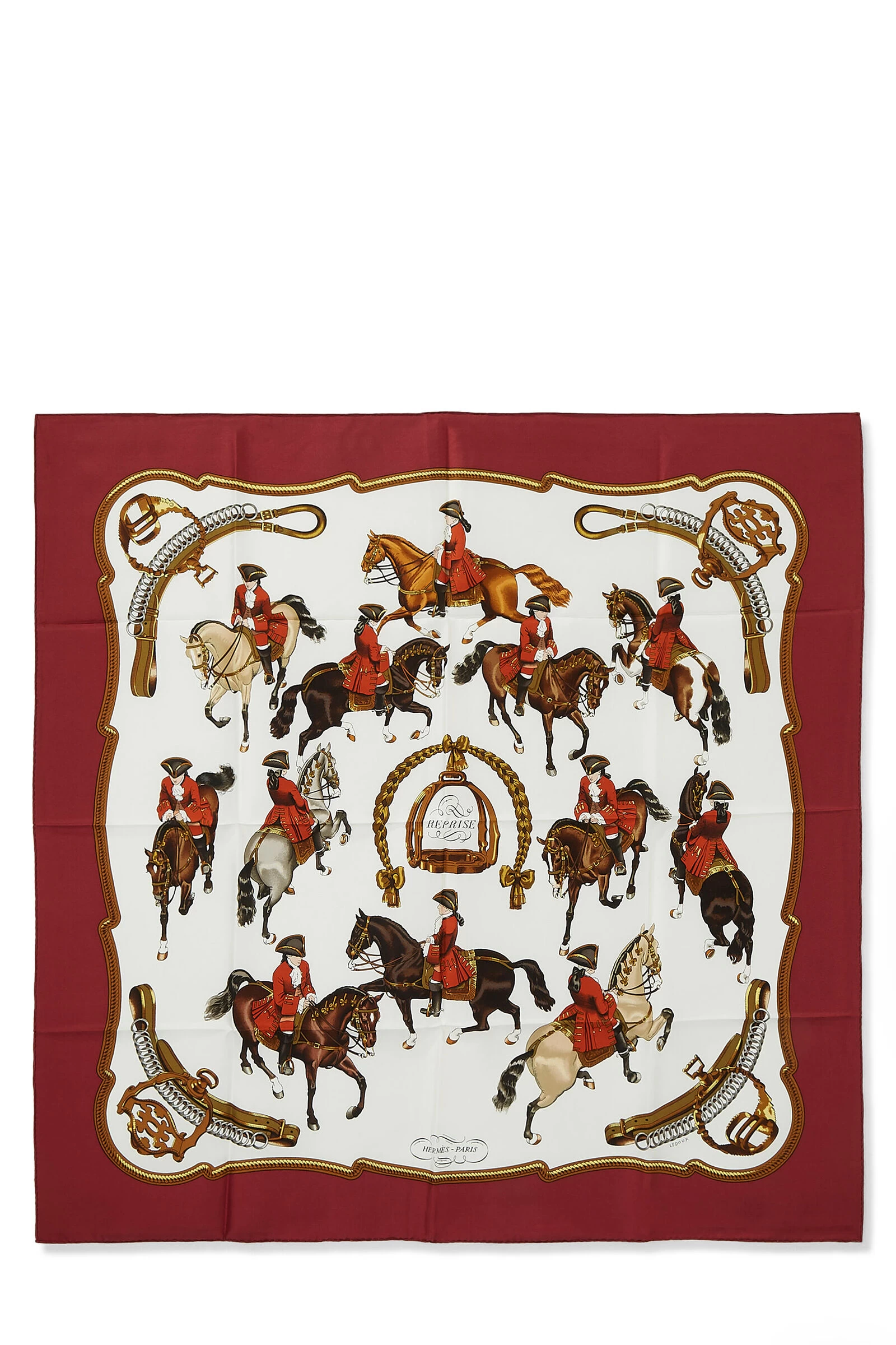 Classic Hermès silk scarf featuring burgundy and multicolor ‘Reprise’ horseback motif, finished with hand-rolled edges. 100% Silk. Artist Philippe Ledoux.