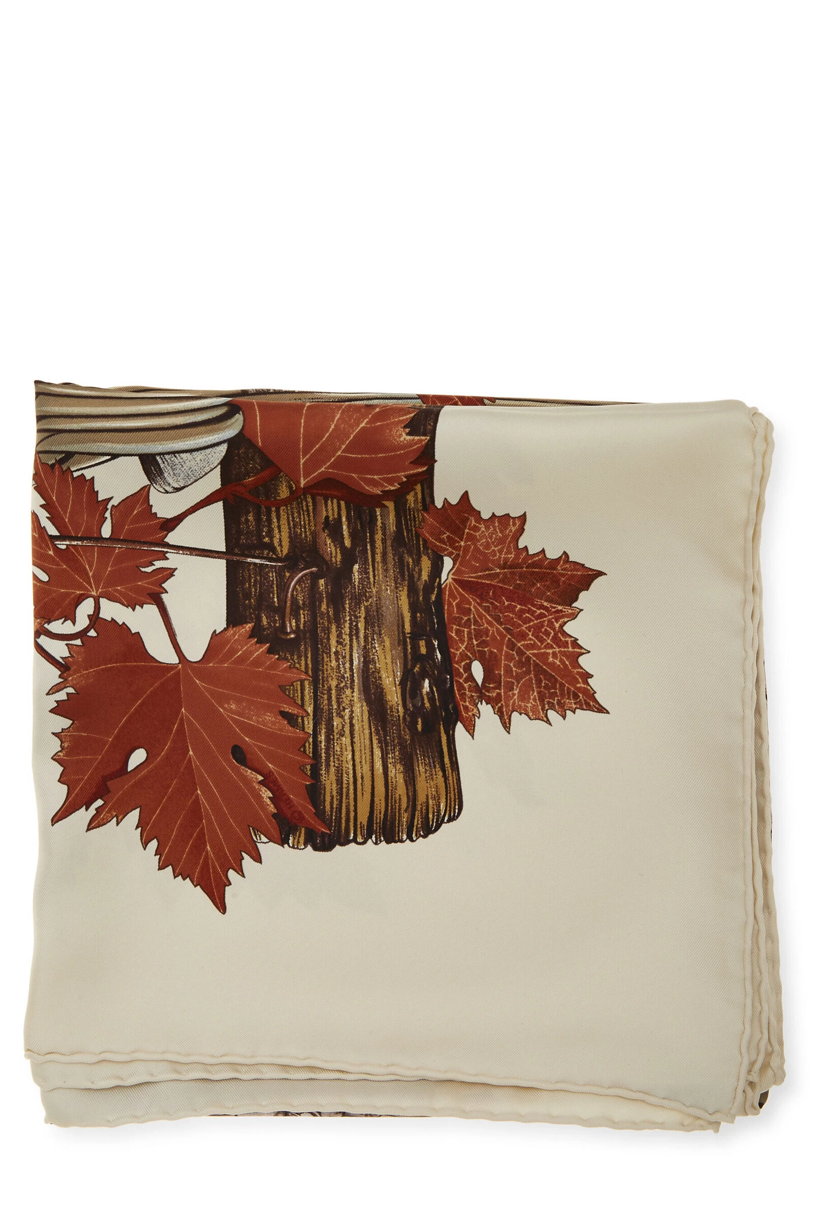 Classic Hermès silk scarf featuring cream and multicolor ‘Vendages’ grape harvest motif, finished with hand-rolled edges. The perfect scarf to wear at your favorite winery. 100% Silk. Artist Valerie Dawlat-Dumoulin.