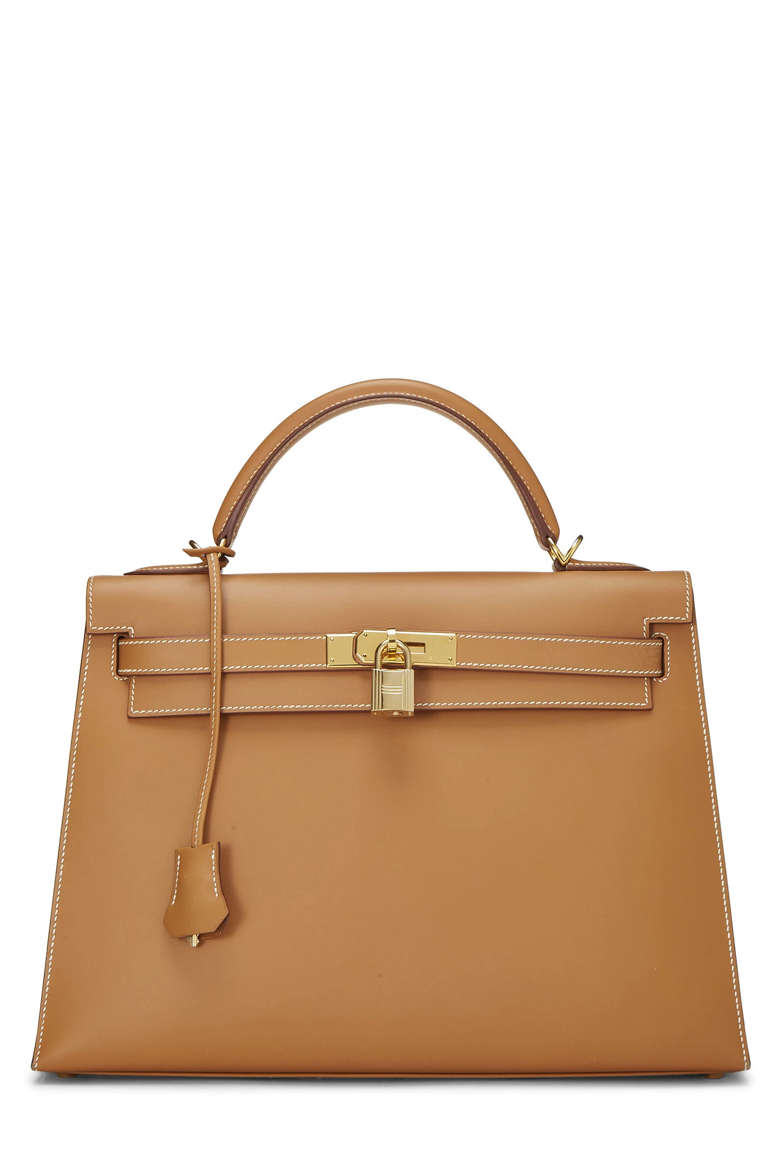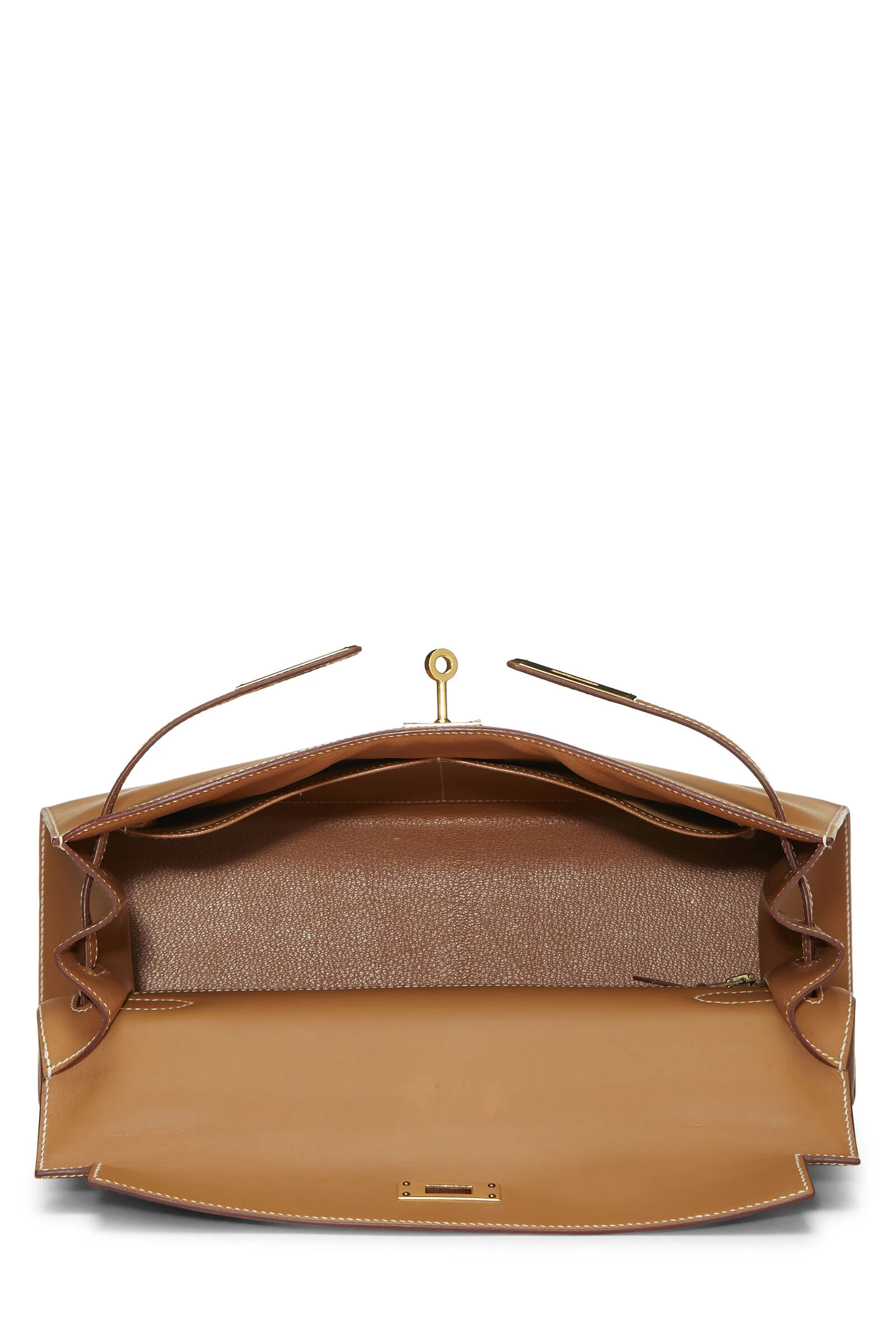 Classic Hermès Kelly Sellier in Gold Chamonix leather, finished with gold-plated hardware. Chamonix leather is a matte smooth calf leather similar to Box Calf. Includes shoulder strap, two keys, lock and clochette.
