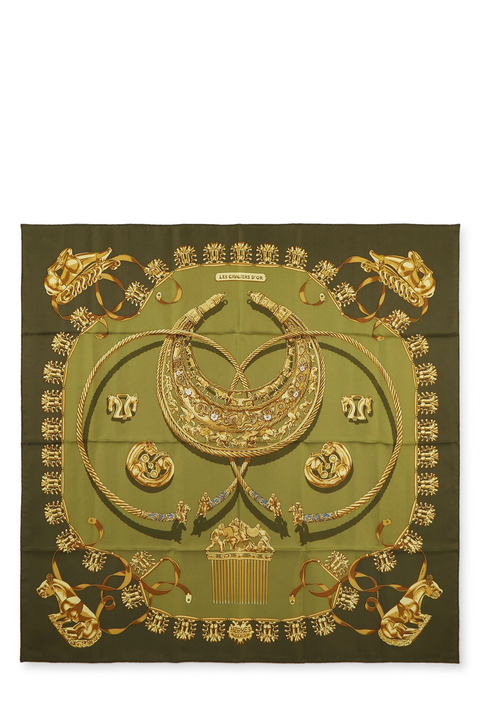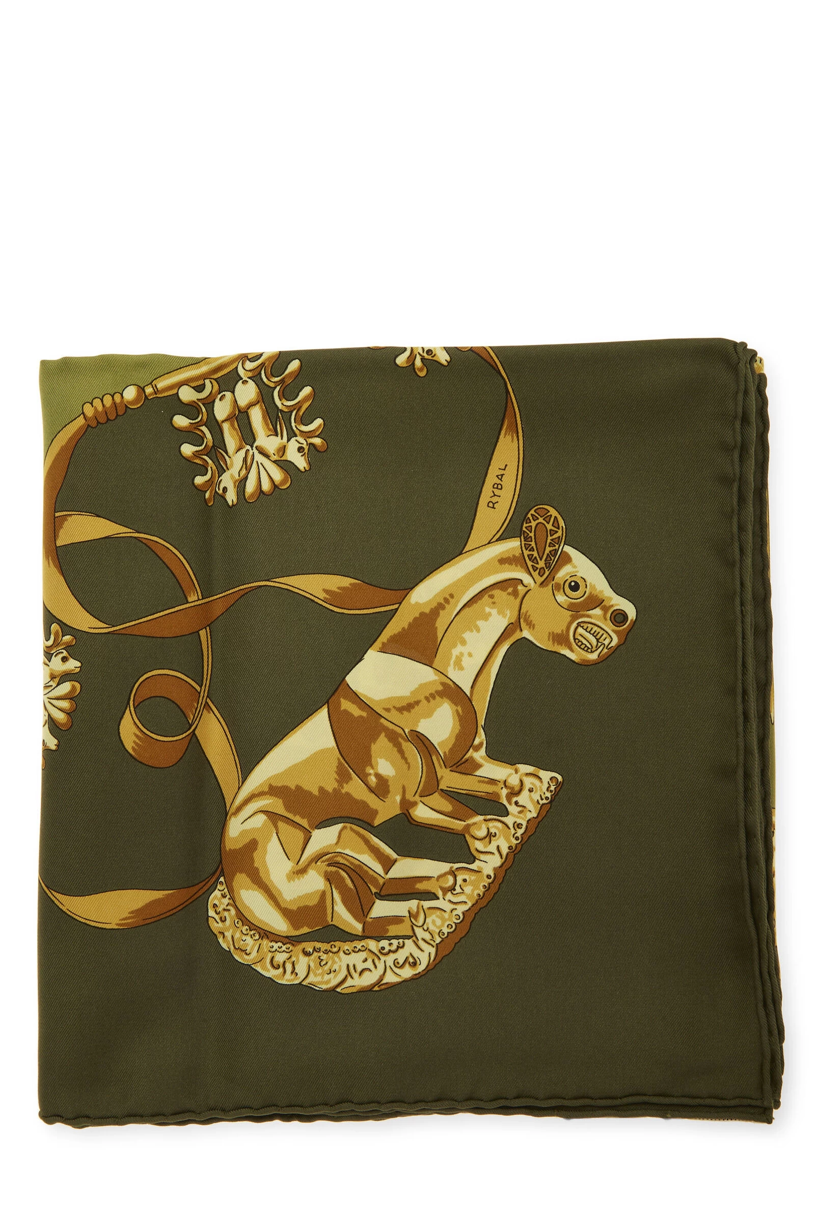 Classic Hermès silk scarf featuring green and multicolor ‘Les Cavaliers D’Or’ ornate motif, finished with hand-rolled edges. 100% Silk. Artist Vladimir Rybaltchenko.