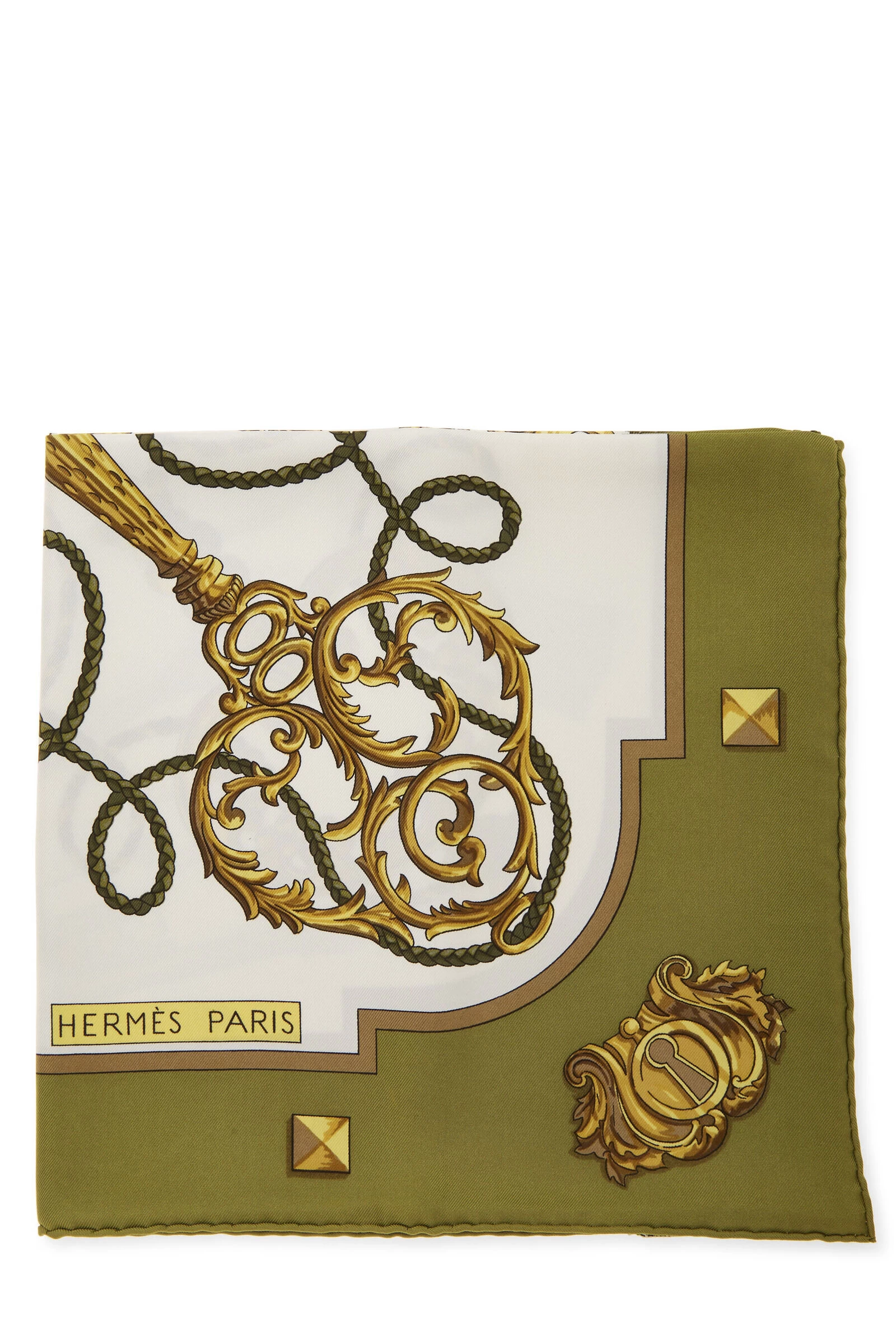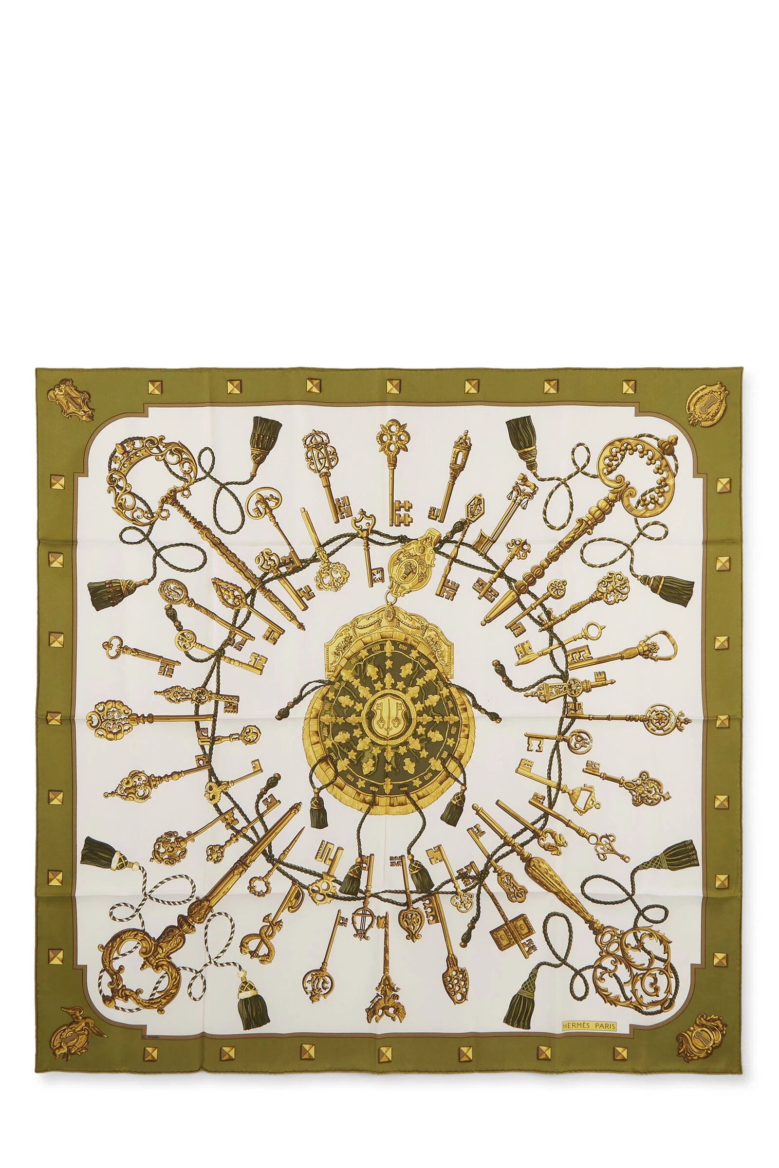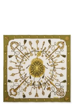 Classic Hermès silk scarf featuring green and multicolor ‘Les Clés’ key motif, finished with hand-rolled edges. 100% Silk. Artist Caty Latham.