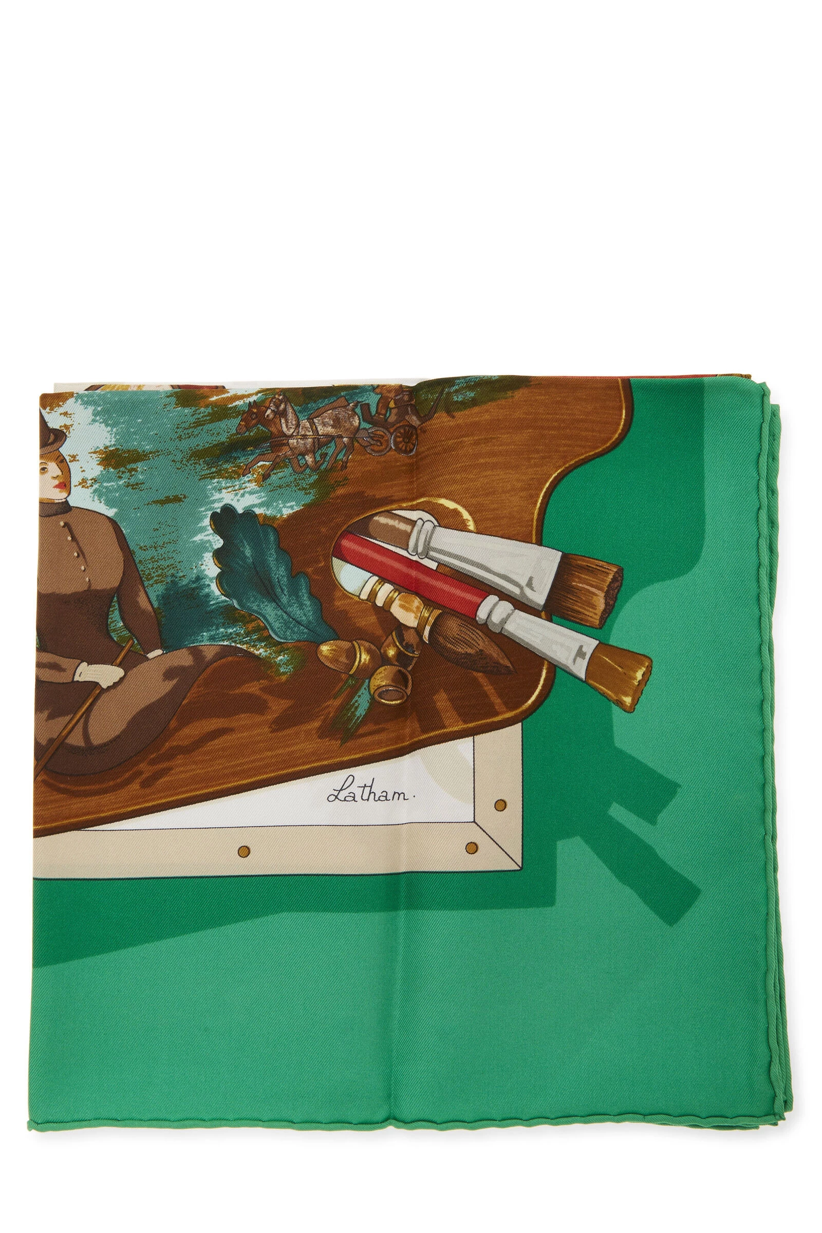 Classic Hermès silk scarf featuring green and multicolor ‘Memoire d’Hermes’ house signatures motif, finished with hand-rolled edges. 100% Silk. Artist Caty Latham.