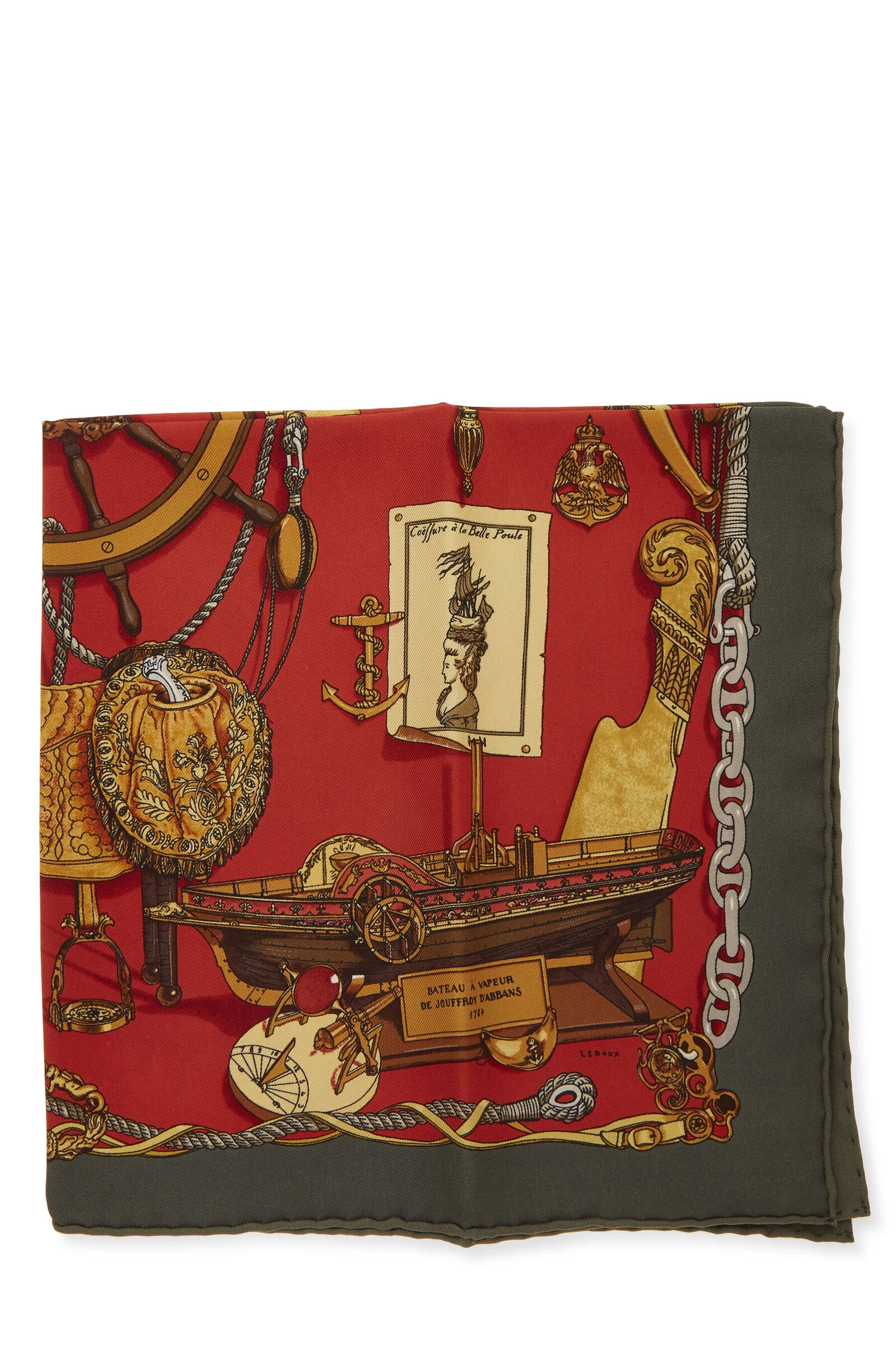 Classic Hermès silk pocket square featuring green and multicolor ‘Musée’ ornate nautical motif, finished with hand-rolled edges. 100% Silk. Artist Philippe Ledoux.