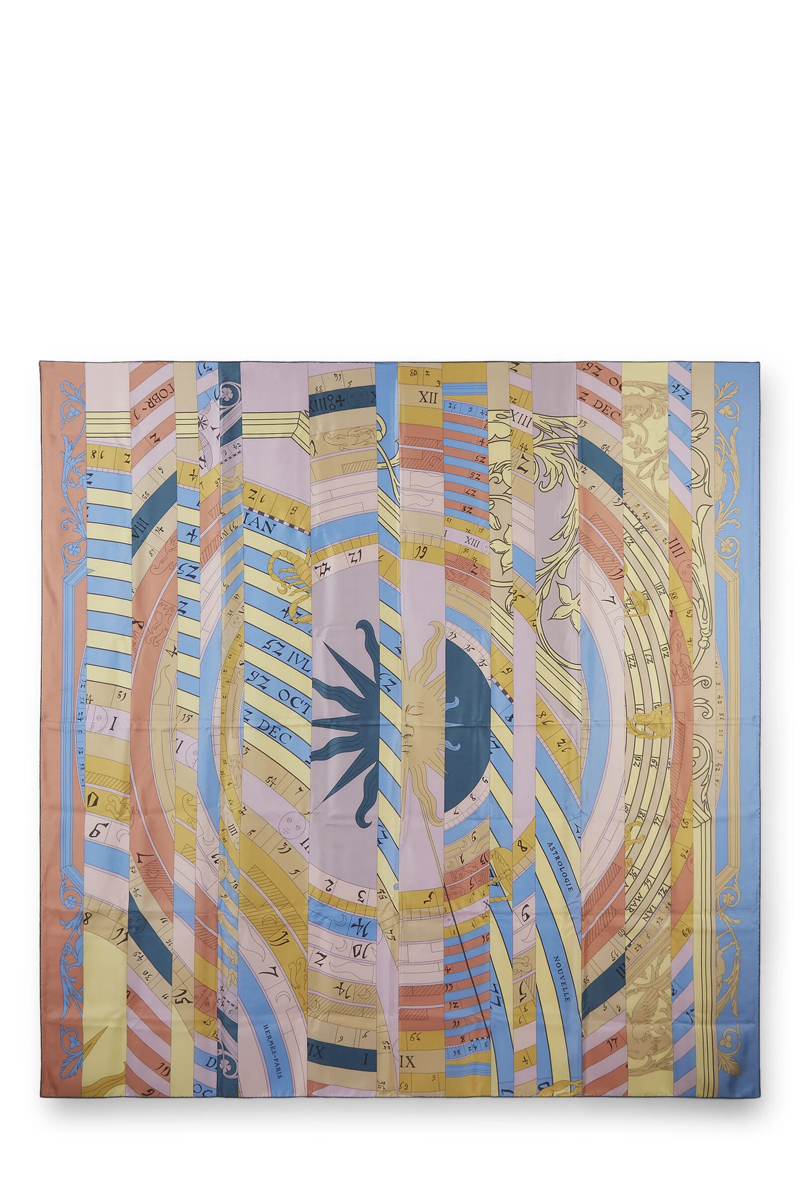 Classic Hermès silk scarf featuring multicolor pastel ‘Astrologie Nouvelle’ astrology motif, finished with hand-rolled edges. 100% Silk. Artist Francoise Faconnet.