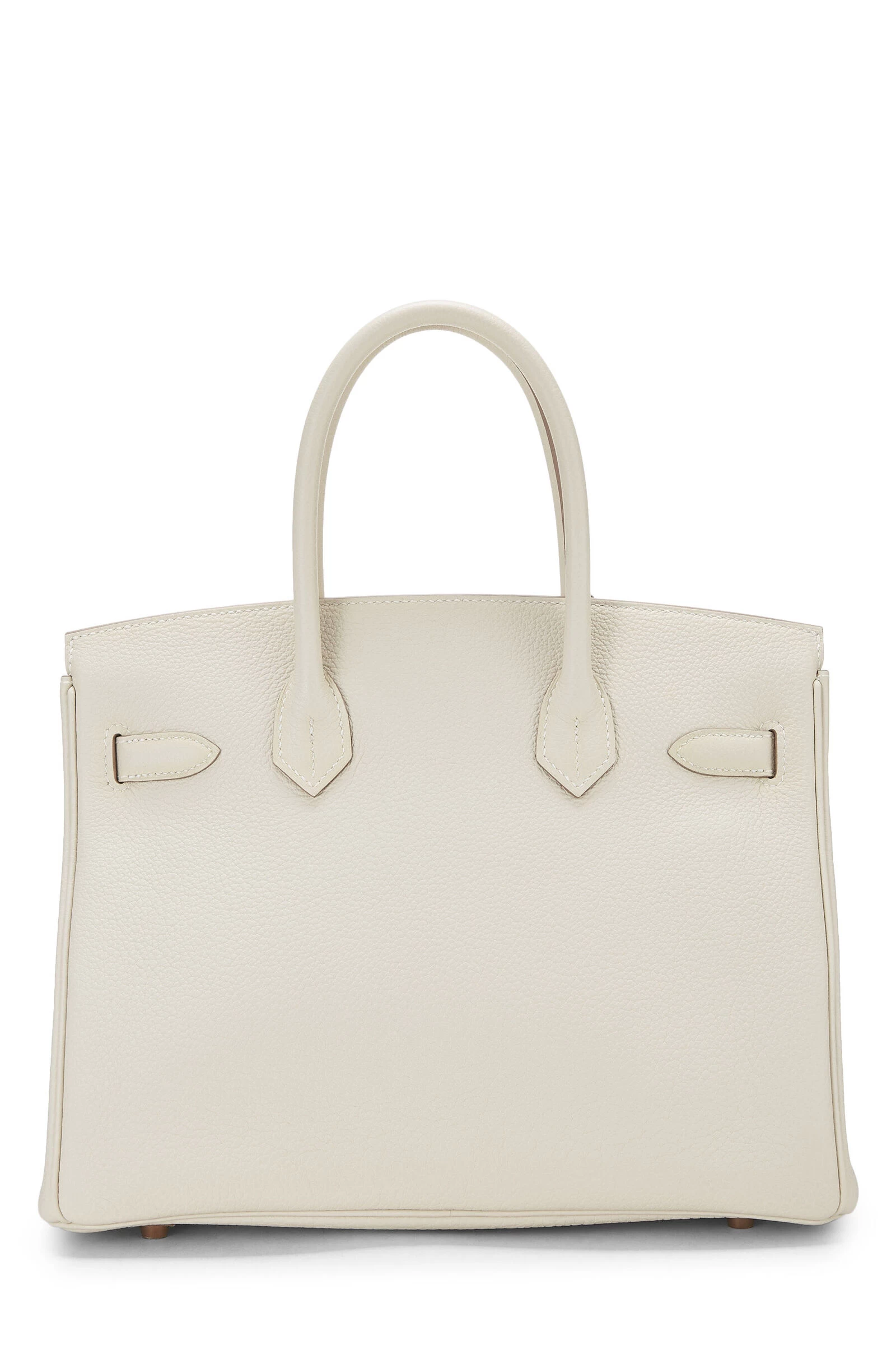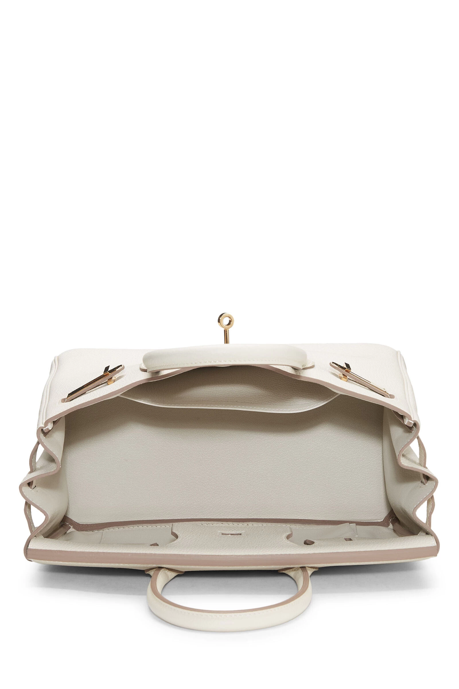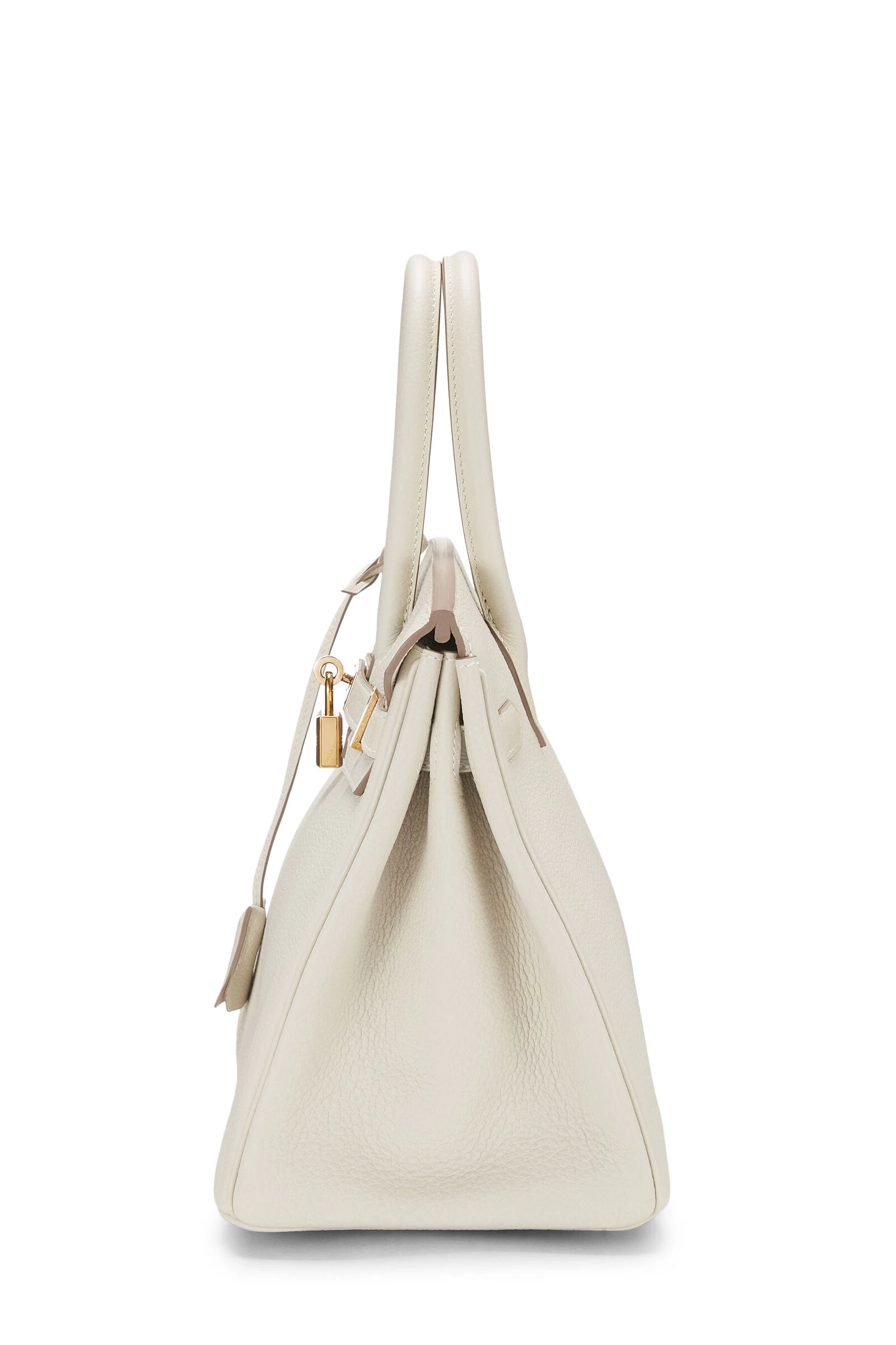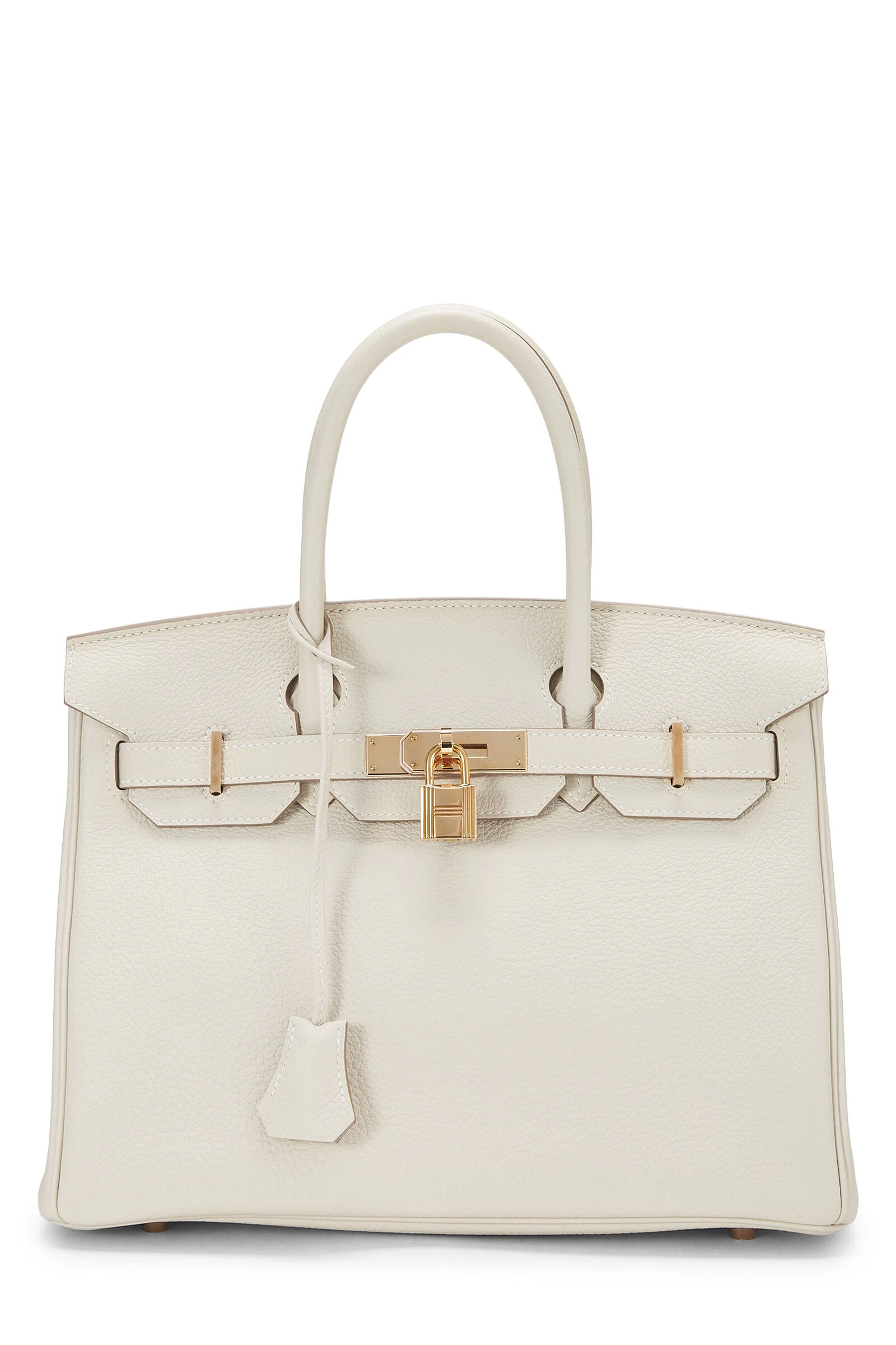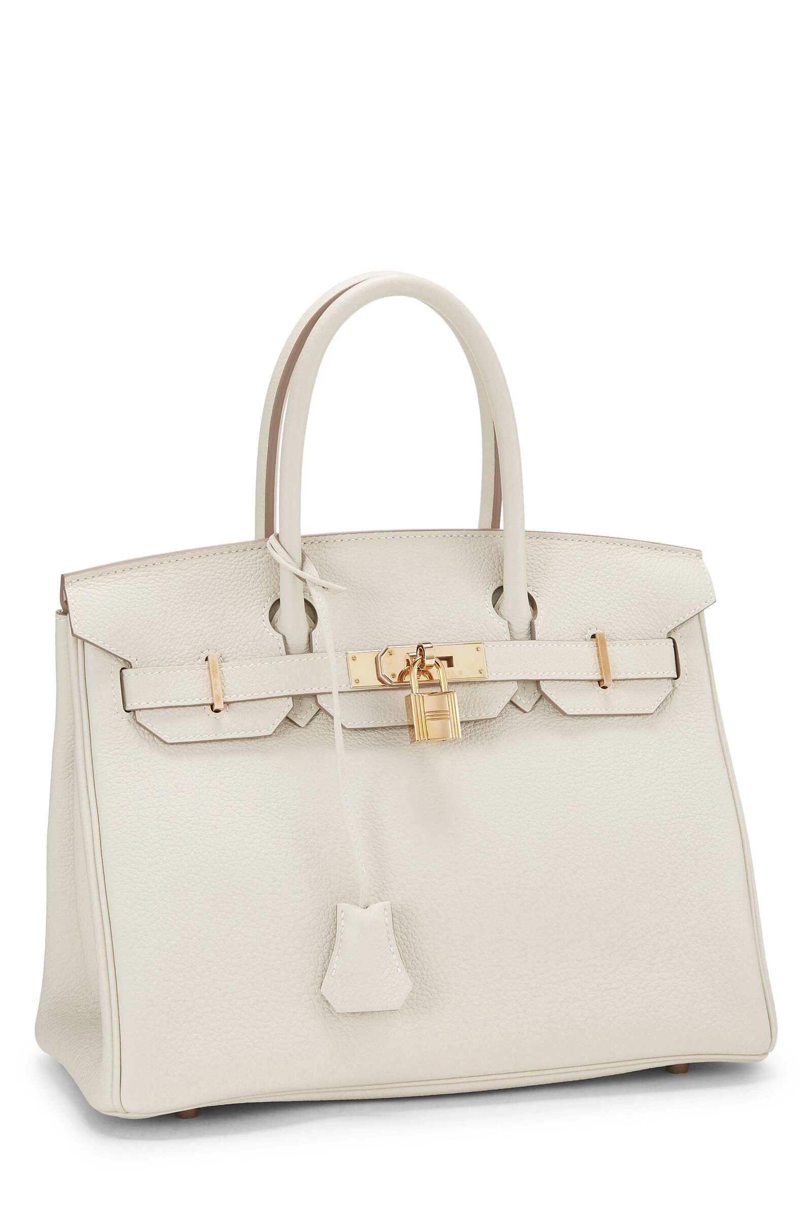 Classic Birkin rendered in Nata Togo leather and accented with gold-plated hardware. Togo leather is a durable calfskin with a medium grain known for its resilience to scratches and ability to be repaired easily. Includes lock, two keys and clochette.