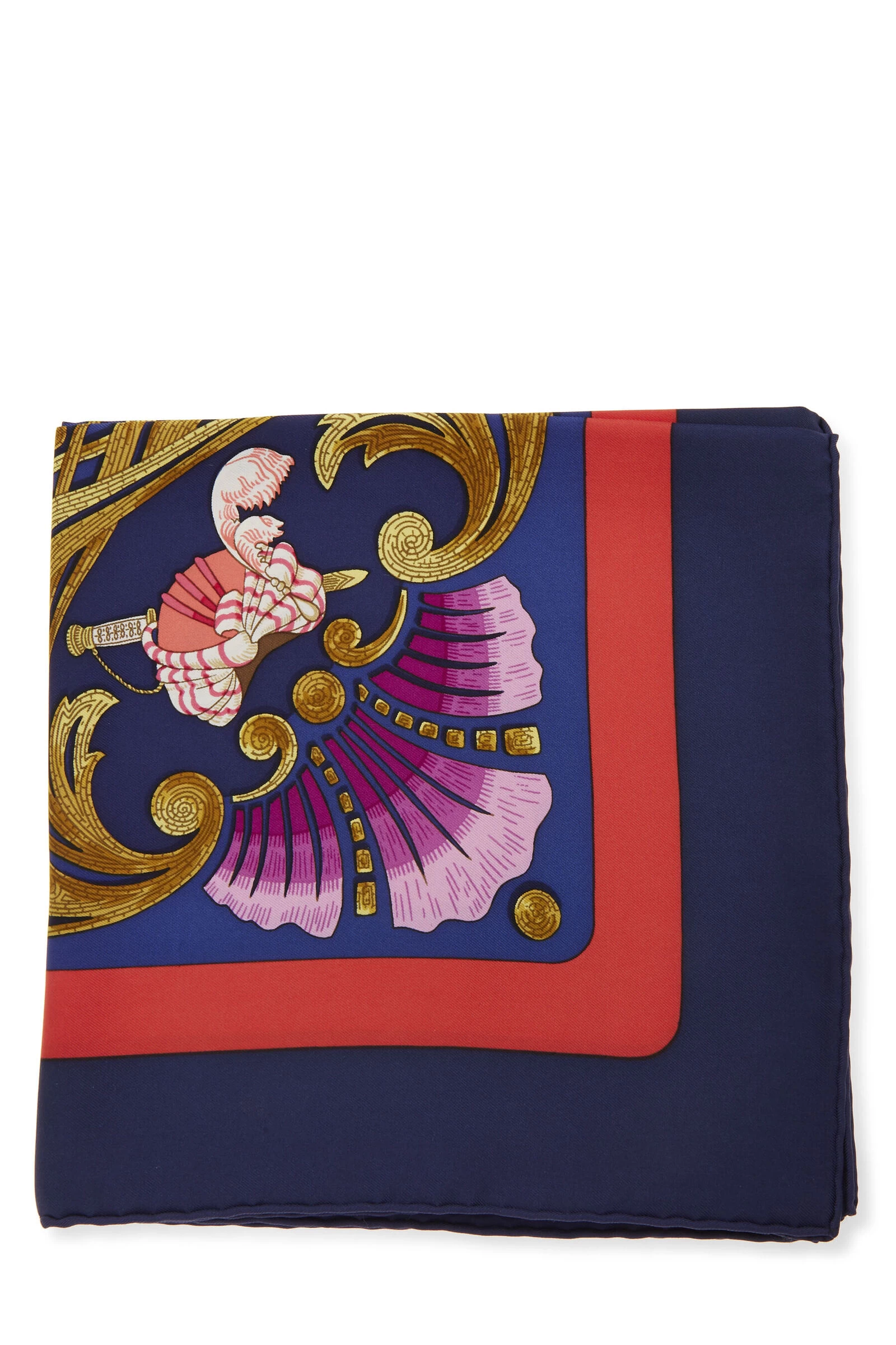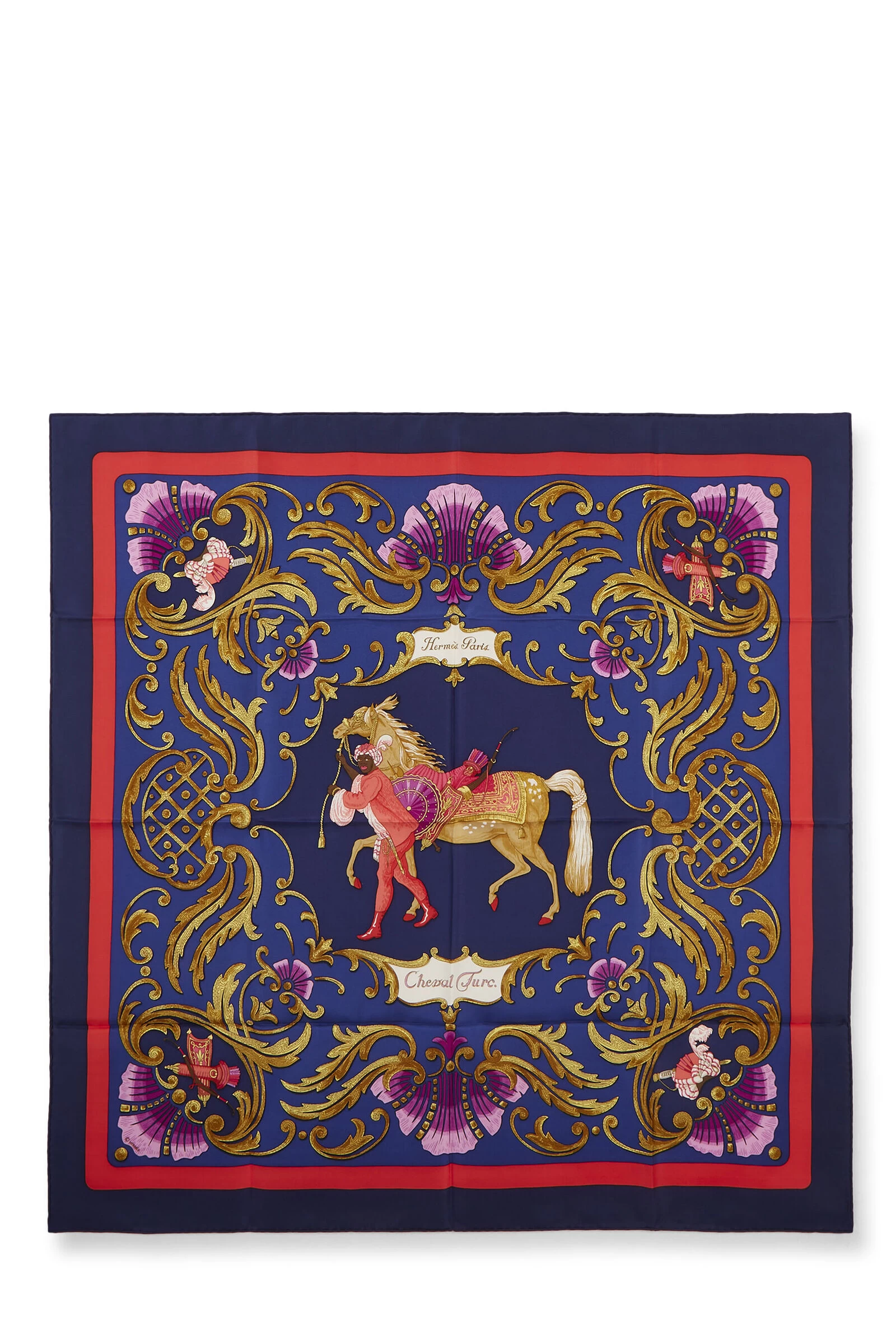 Classic Hermès silk scarf featuring navy ‘Cheval Turc’ motif, finished with hand-rolled edges. 100% Silk. Artist Christiane Vauzelles.