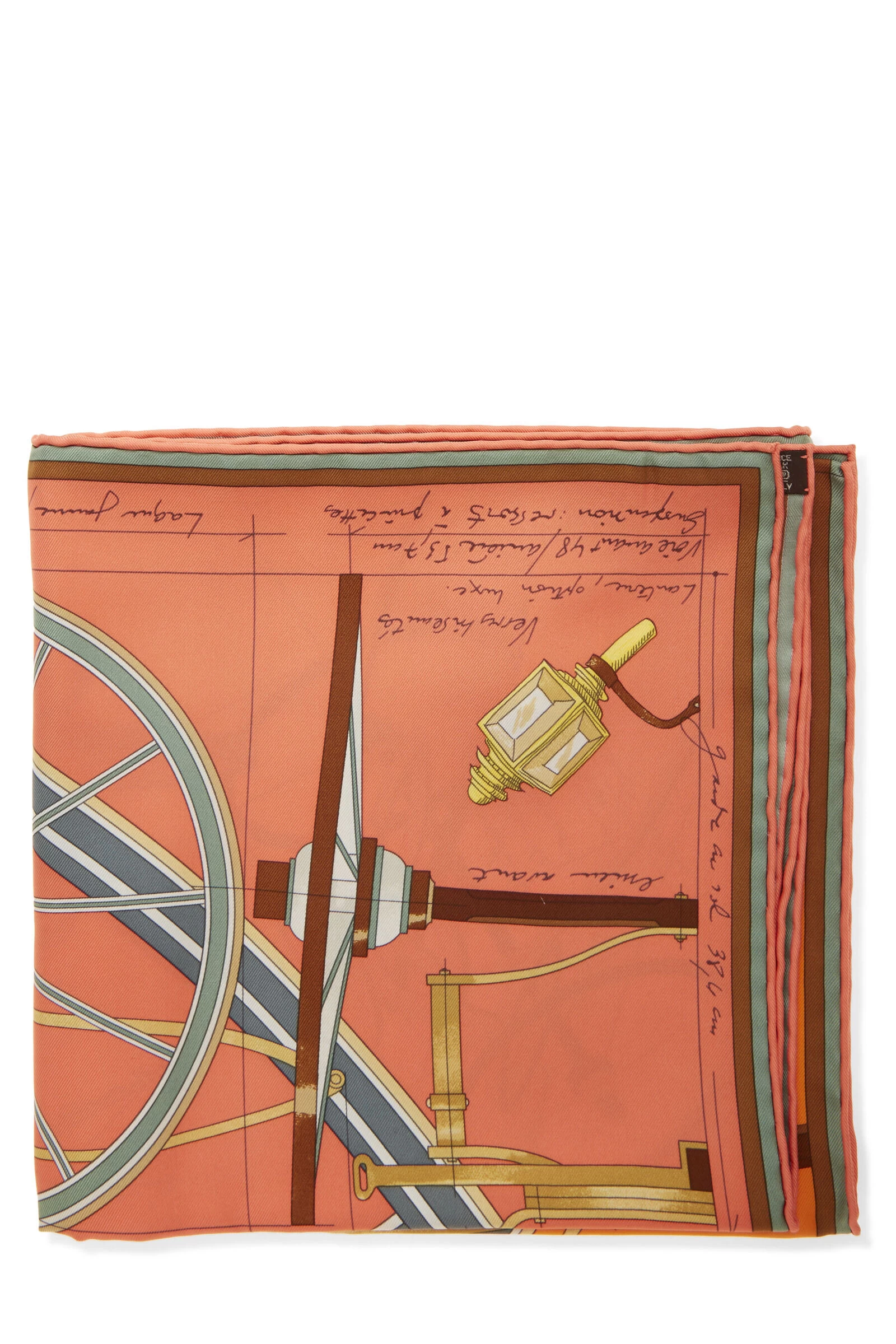 Classic Hermès silk scarf featuring orange and multicolor ‘Projet de Voiture Petit’ carriage motif, finished with hand-rolled edges. 100% Silk. Artist Christian Renonciat.