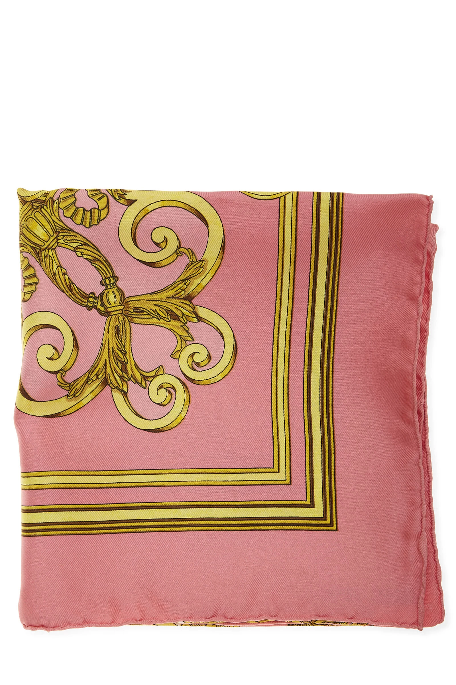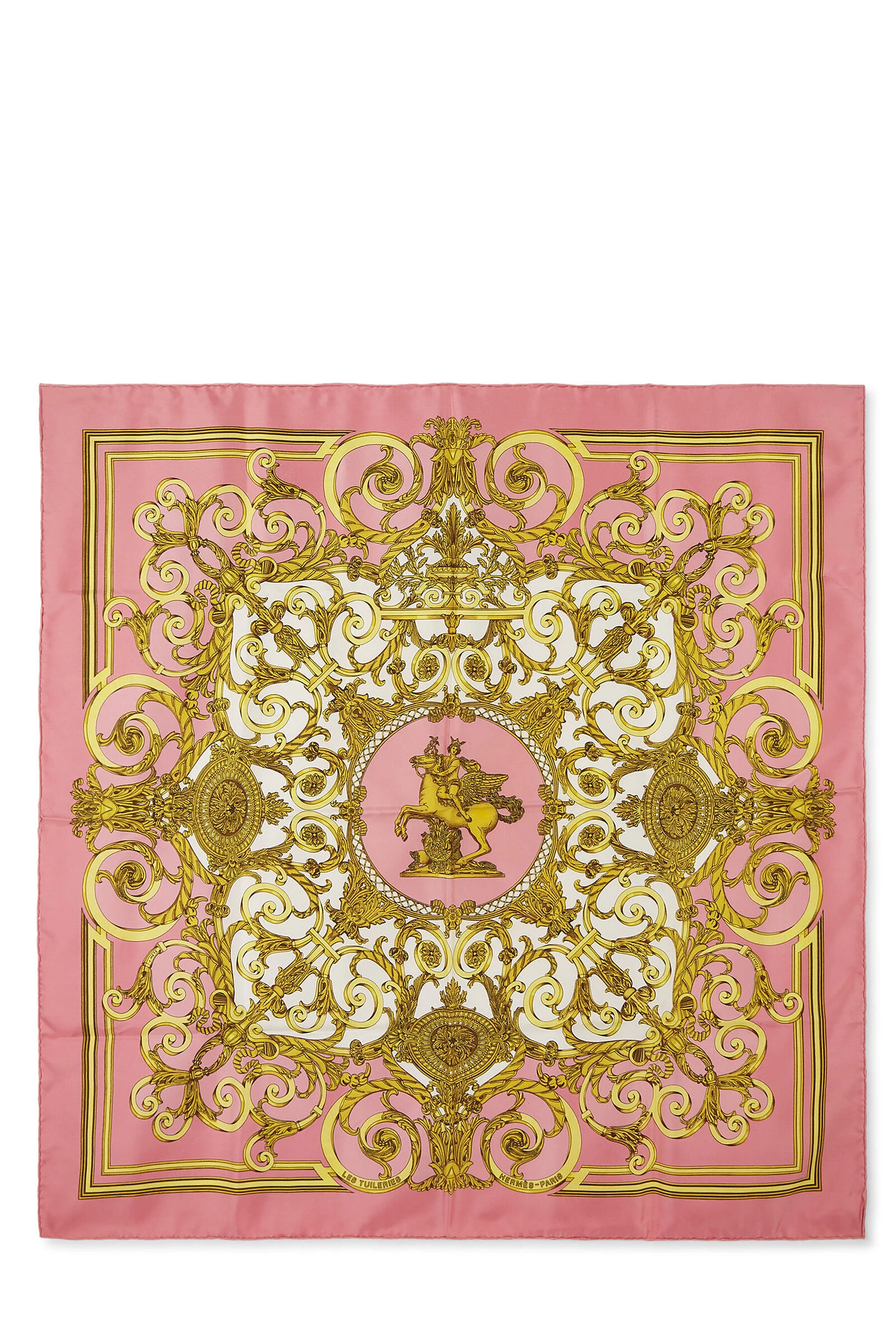 Classic Hermès silk scarf featuring pink and multicolor ‘Les Tuileries’ equestrian motif, finished with hand-rolled edges. 100% Silk. Artist Joachim Metz.