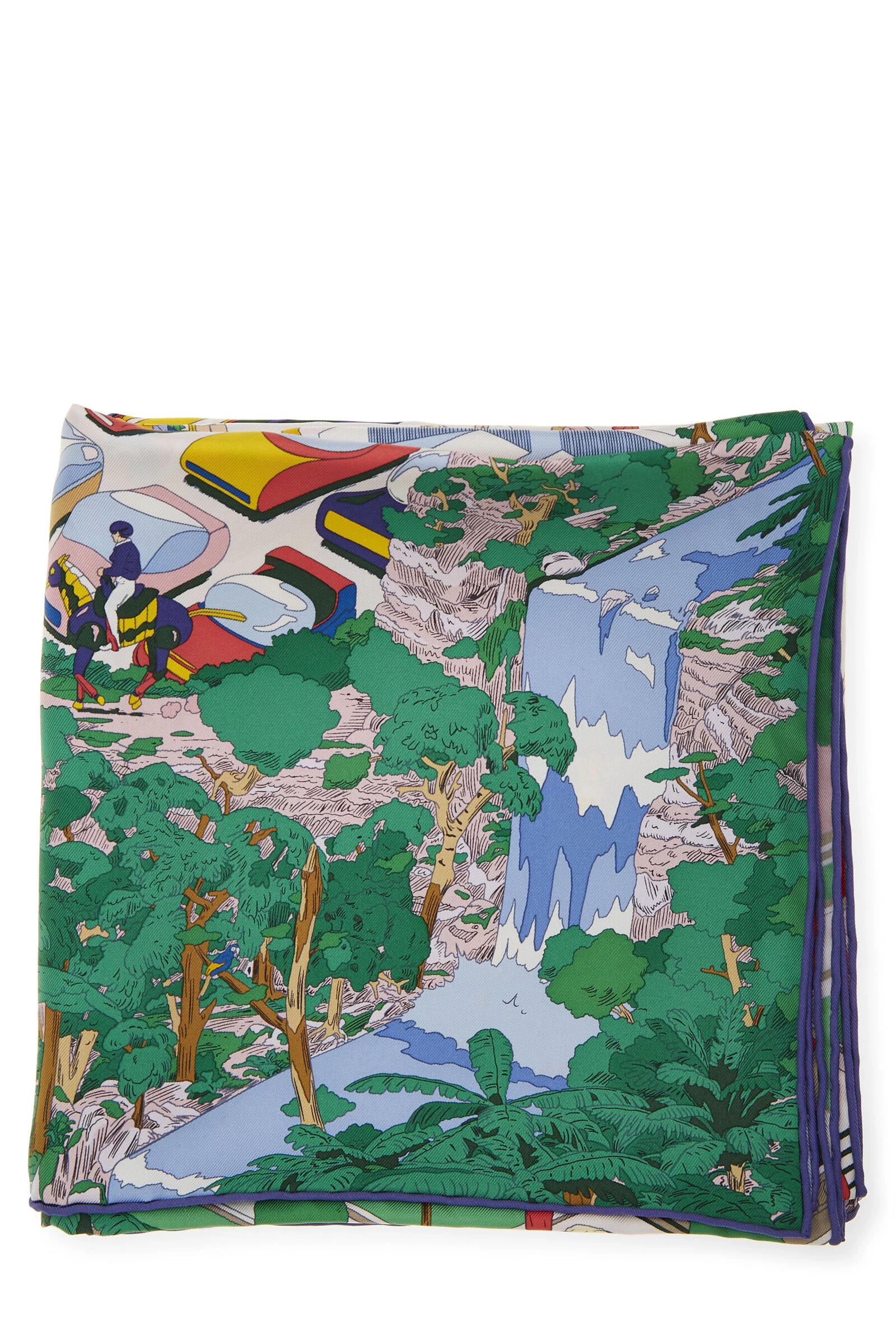 Classic Hermès silk scarf featuring pink and multicolor ‘On The Beach’ oceanside motif, finished with hand-rolled edges. 100% Silk. Artist Ugo Bienvenu.