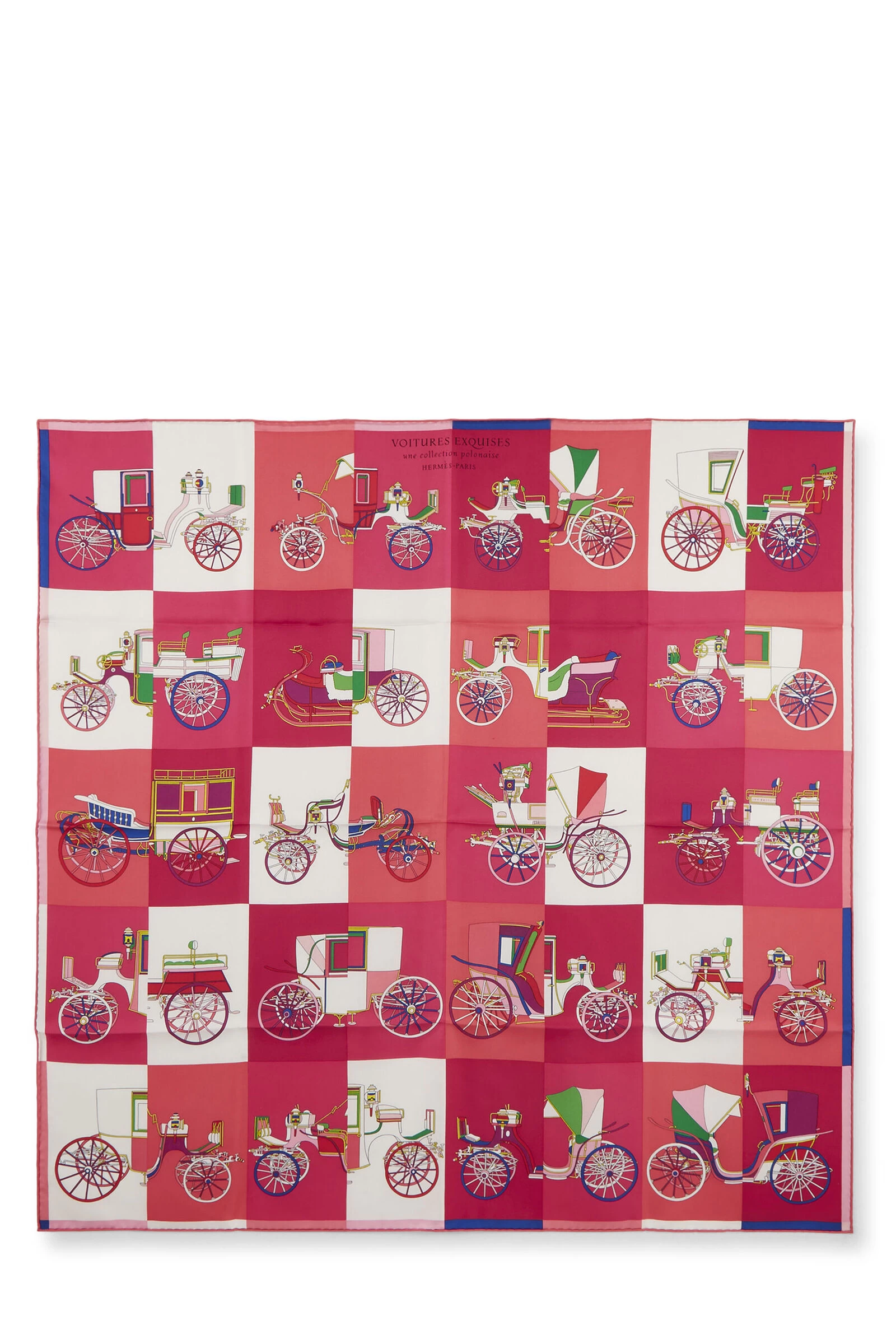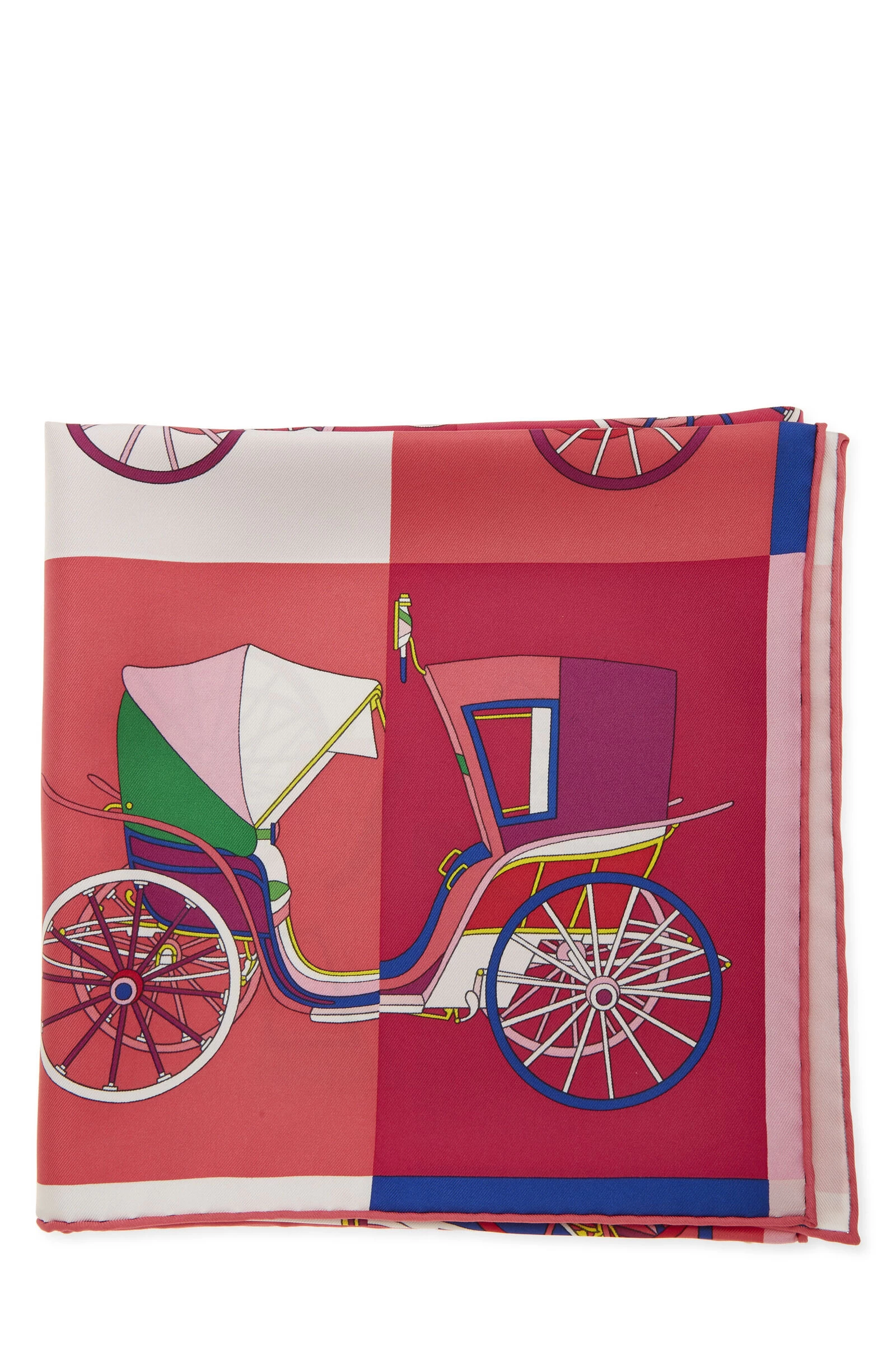 Classic Hermès silk scarf featuring pink and multicolor ‘Voitures Exquises’ carriage motif, finished with hand-rolled edges. 100% Silk. Artist Jan Bajtlik.