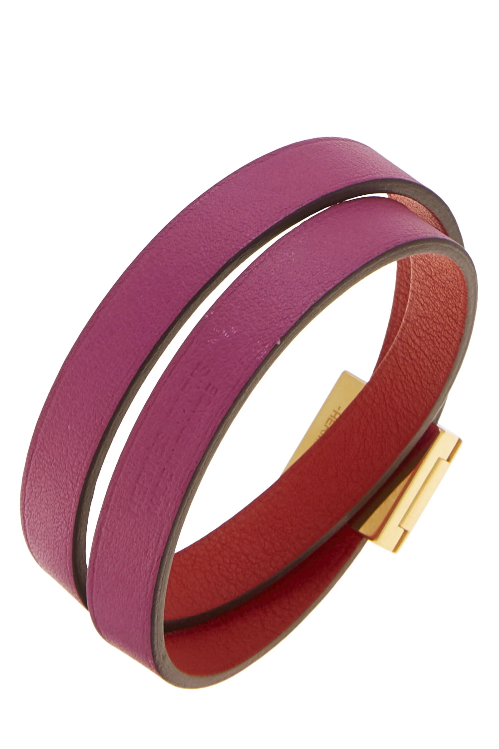 Chic Hermès leather bracelet crafted in purple and orange with gold-tone hardware that features a pyramid stud fascinator. The collectible Medor style exudes subtle luxury and sophistication in a way only the house of Hermès has mastered.