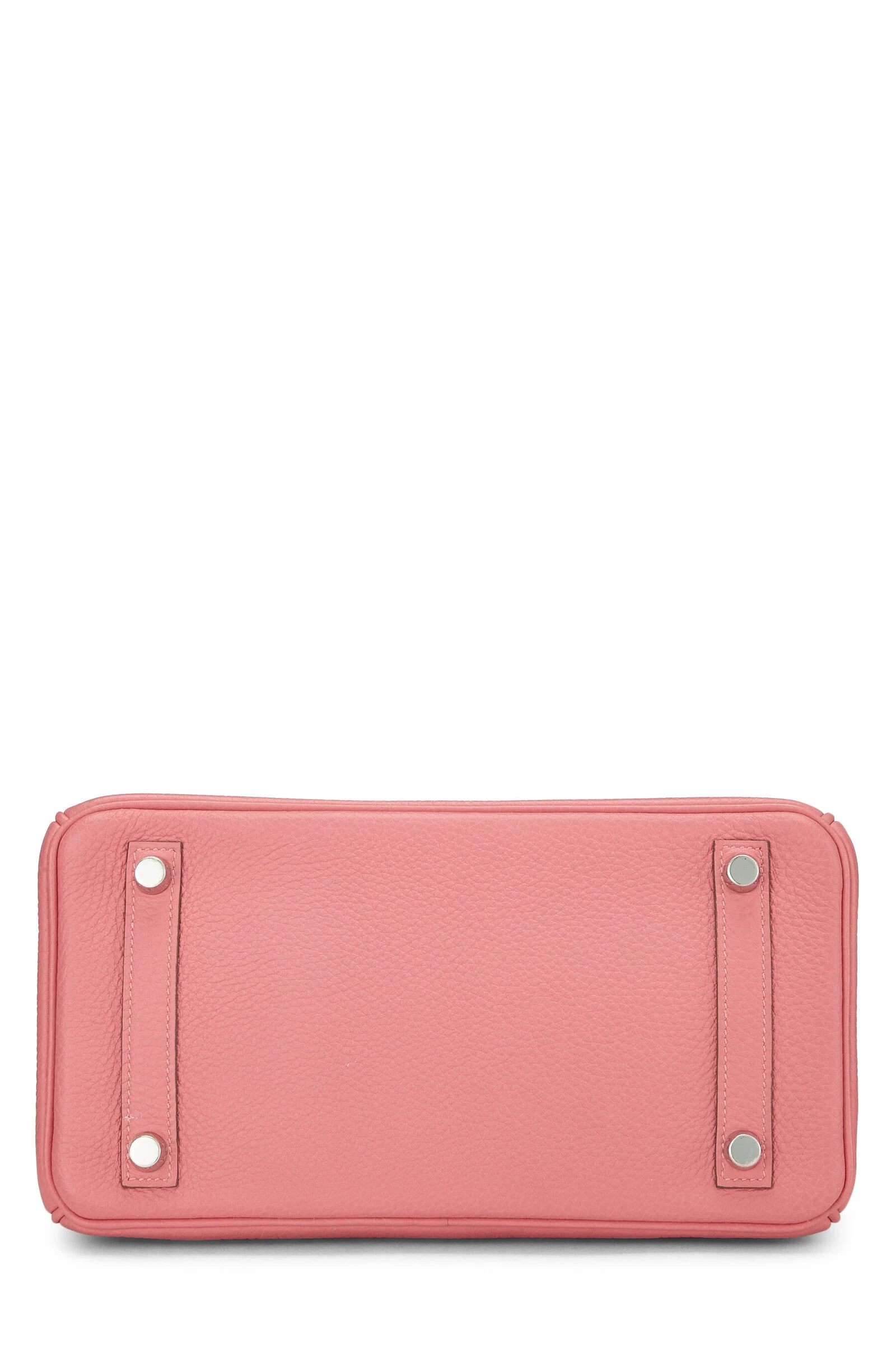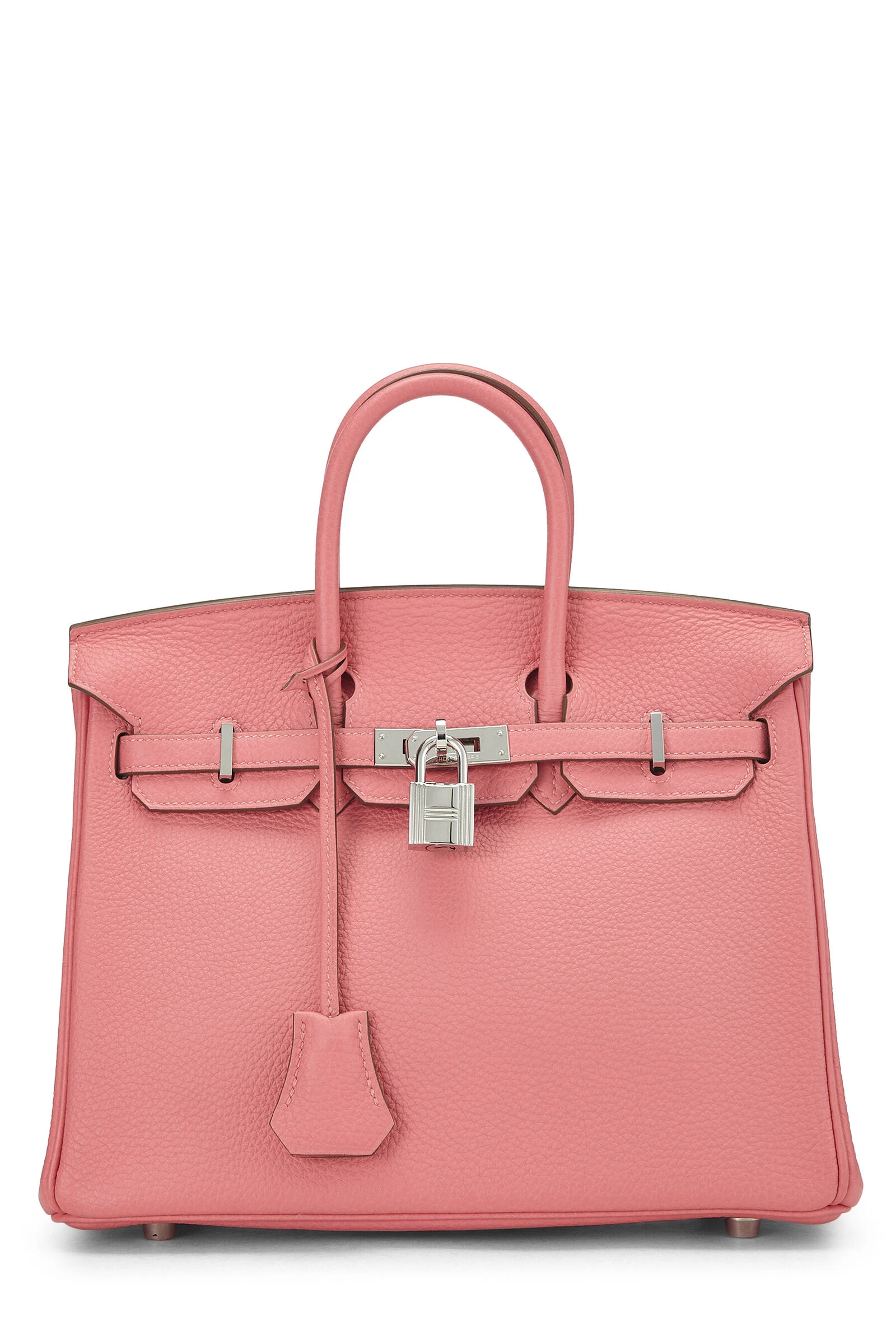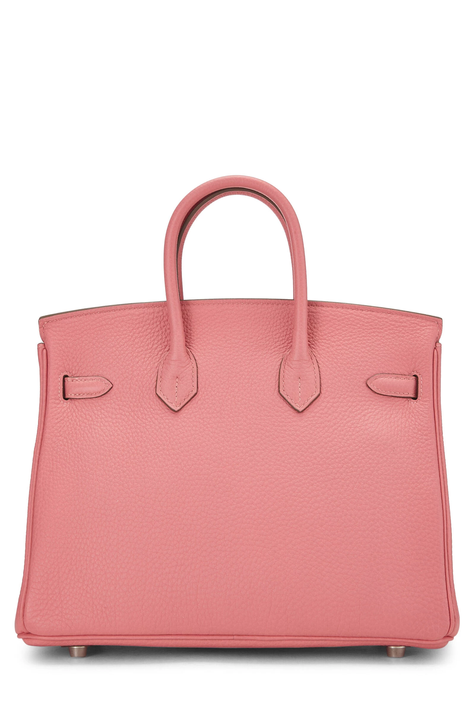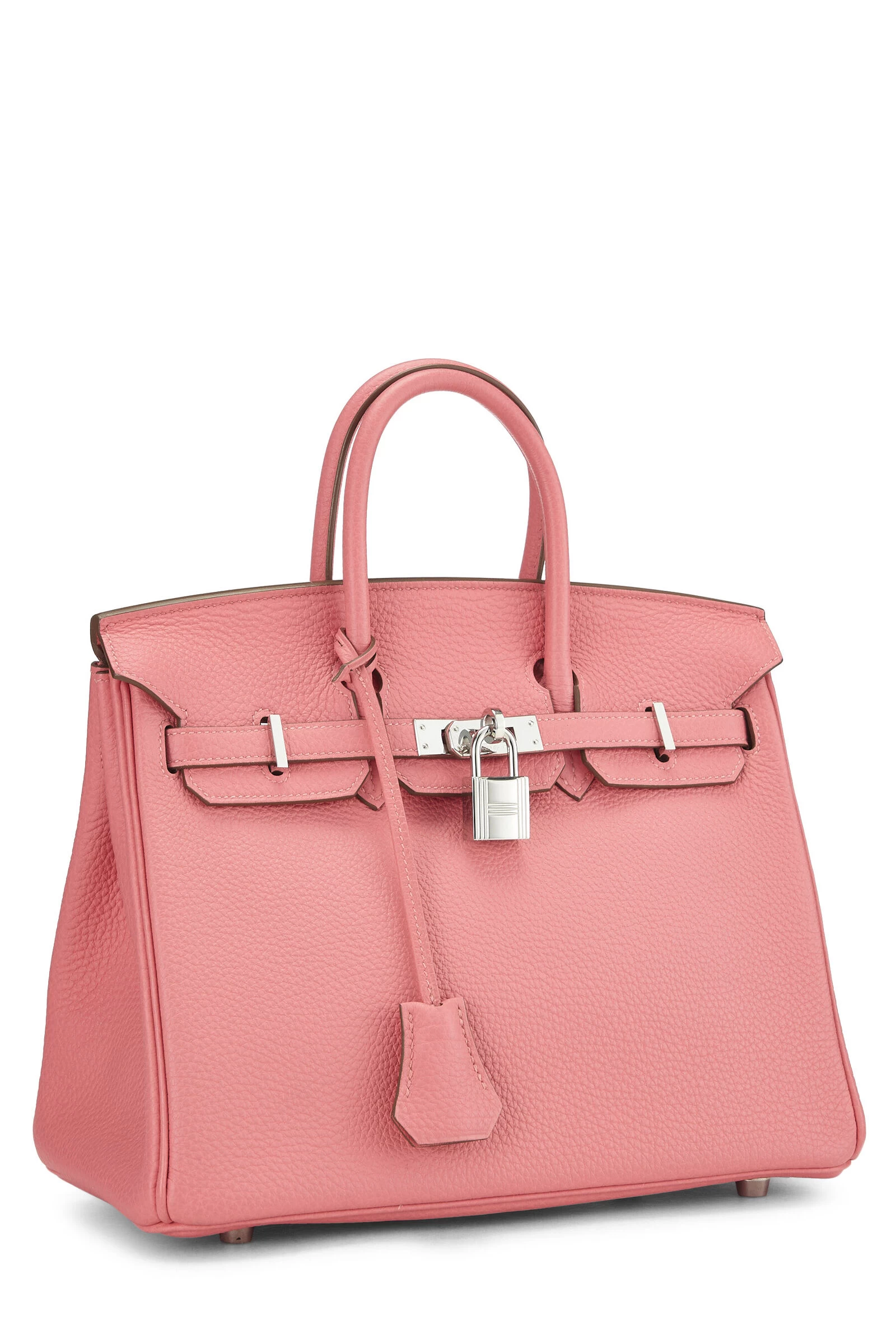 Classic Birkin 25cm rendered in pink Rose lipstick Togo leather and accented with Palladium-plated hardware. Togo leather is a thick and durable calfskin with a medium grain known for its resilience to scratches and ability to be repaired easily. Includes lock, two keys, clochette and rain jacket.