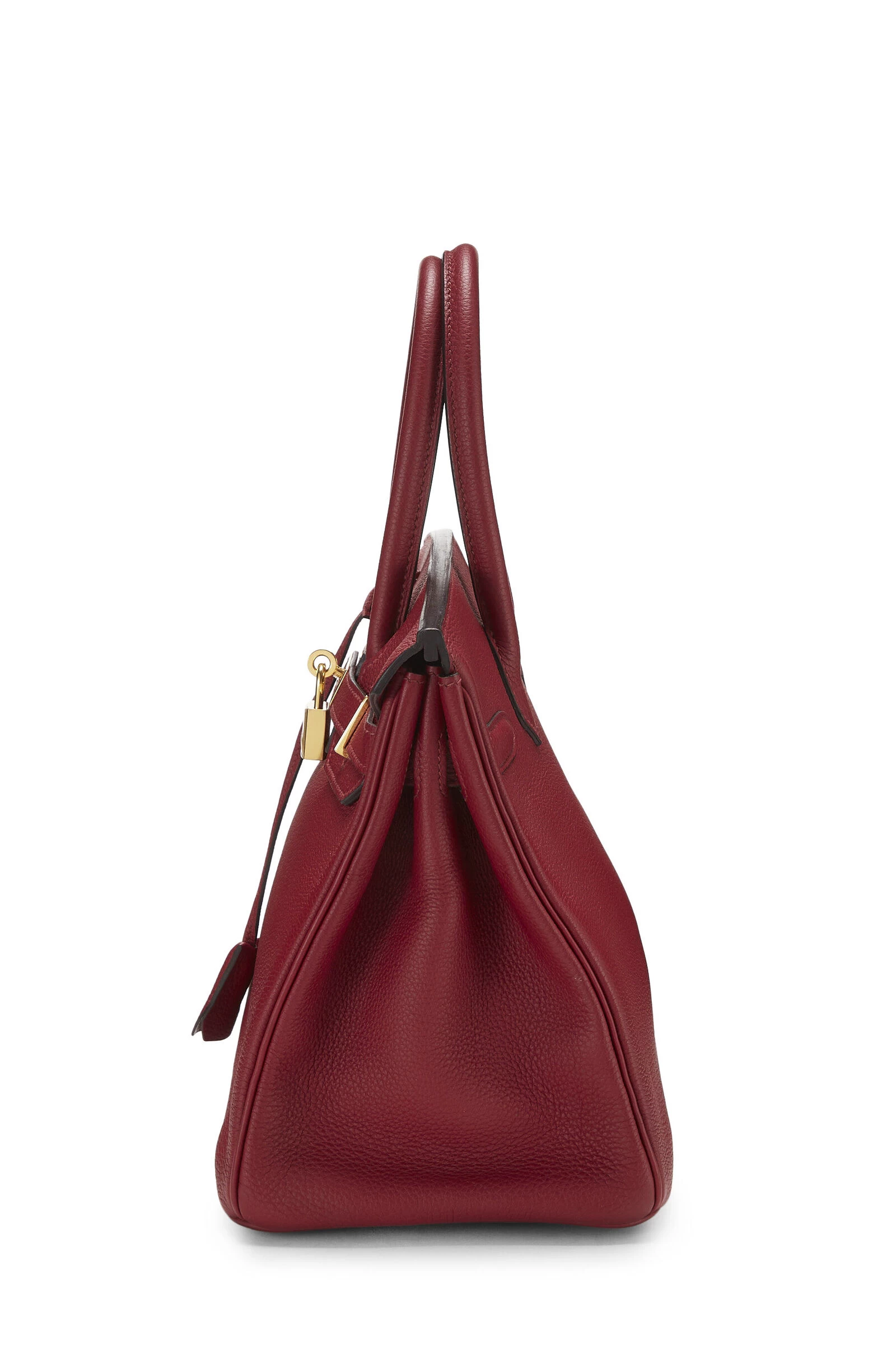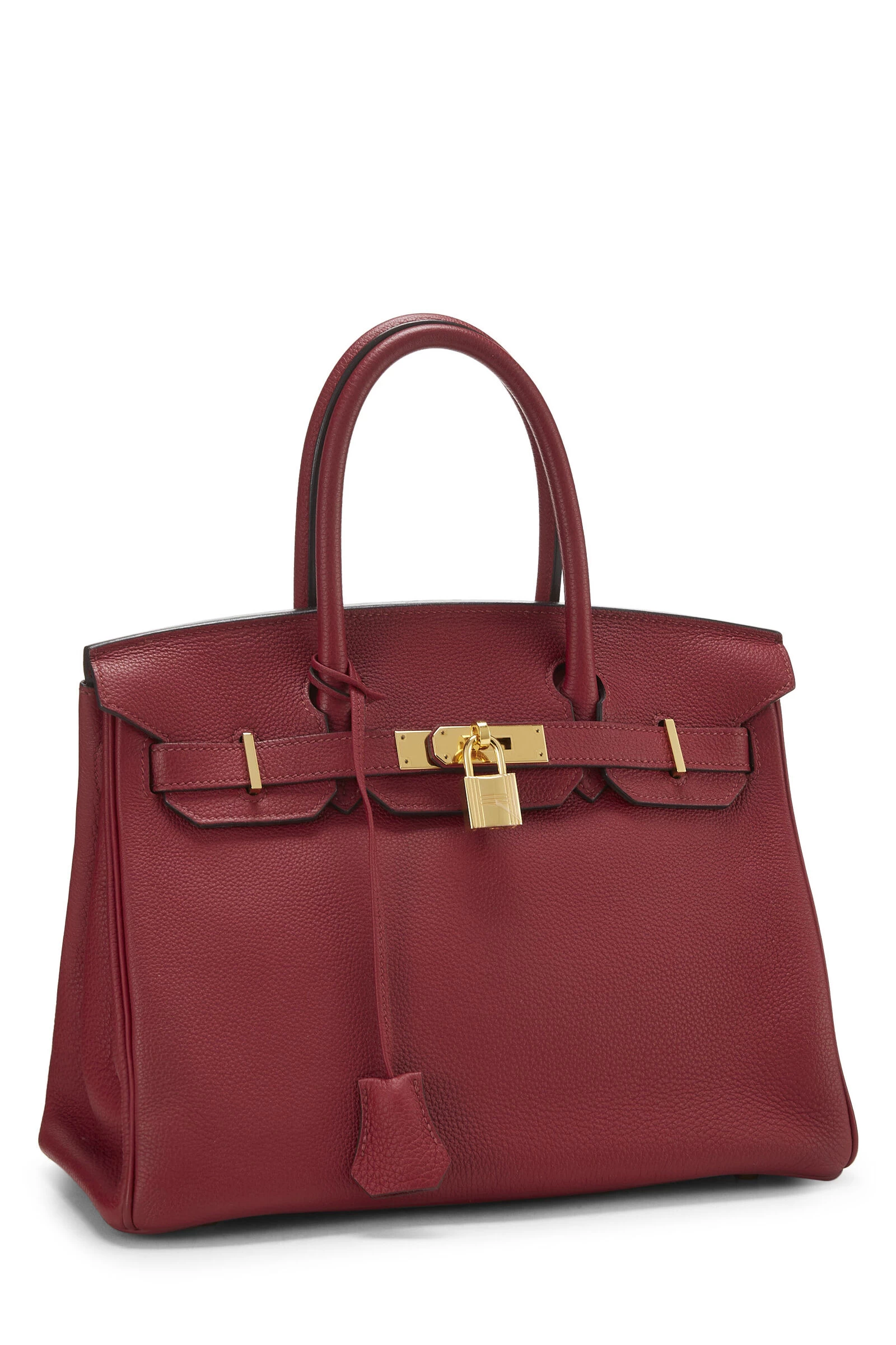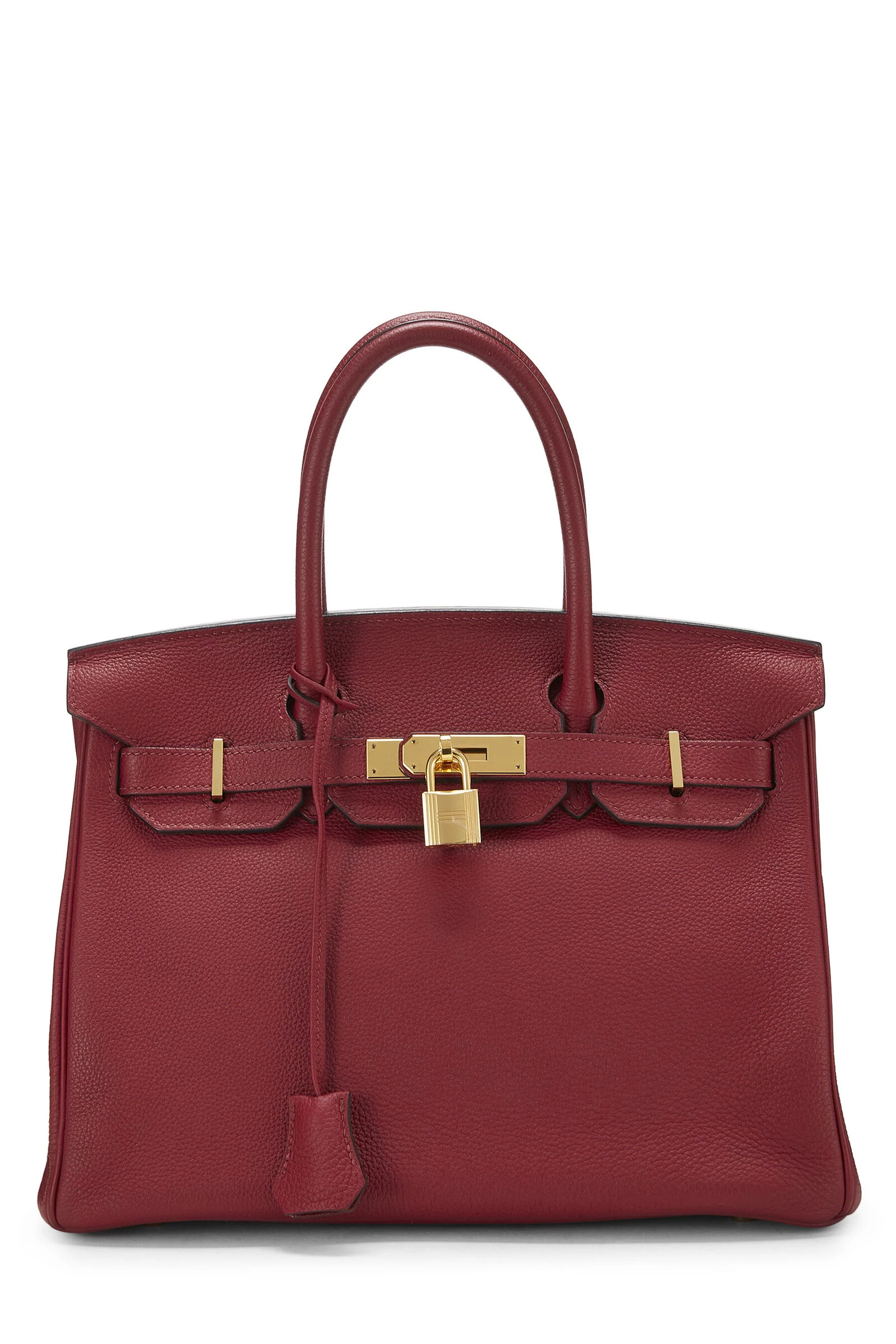 Classic Birkin rendered in red Rouge Grenat Togo leather and accented with gold-plated hardware. Togo leather is a durable calfskin with a medium grain known for its resilience to scratches and ability to be repaired easily. Includes lock, two keys and clochette.