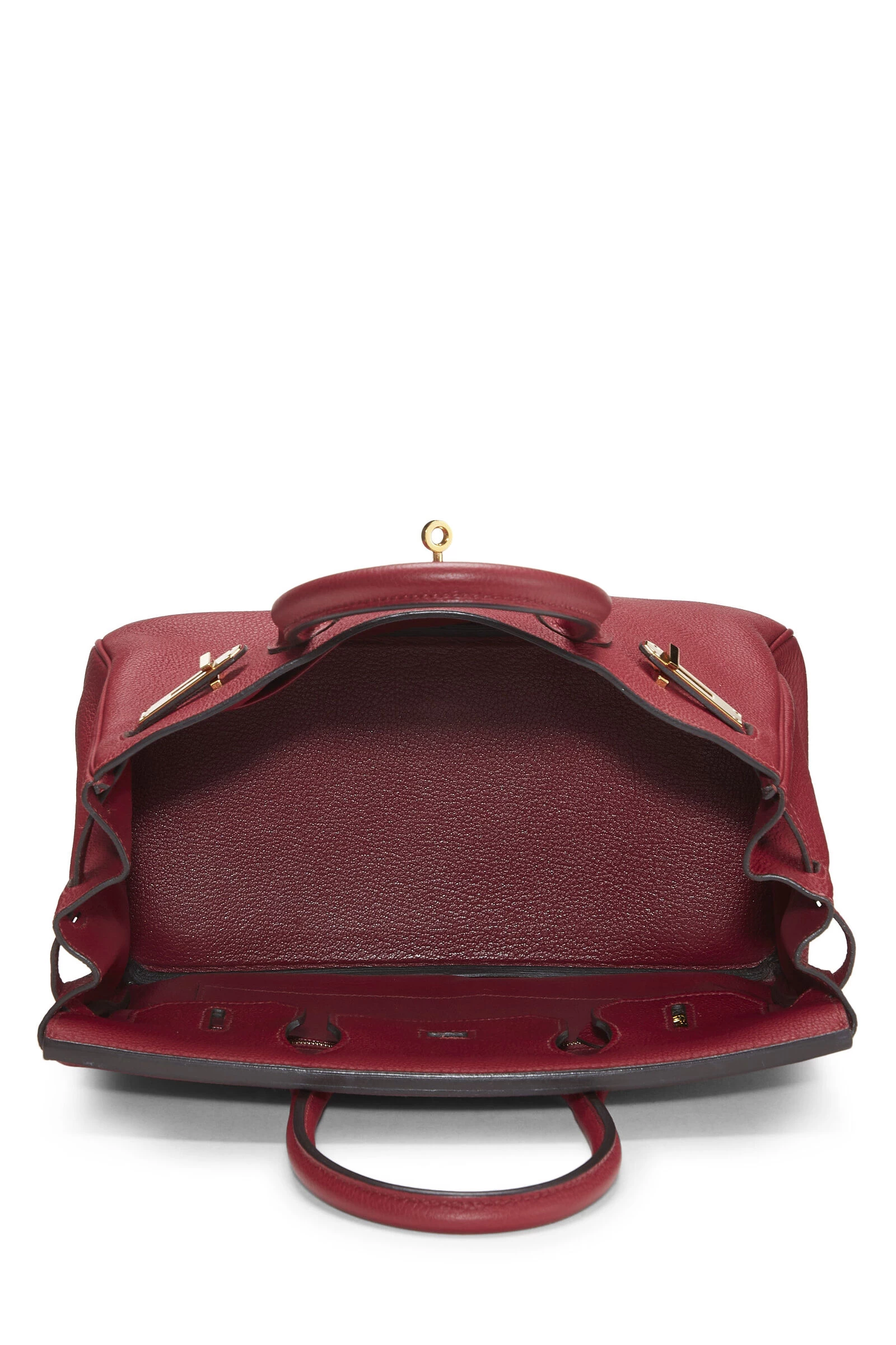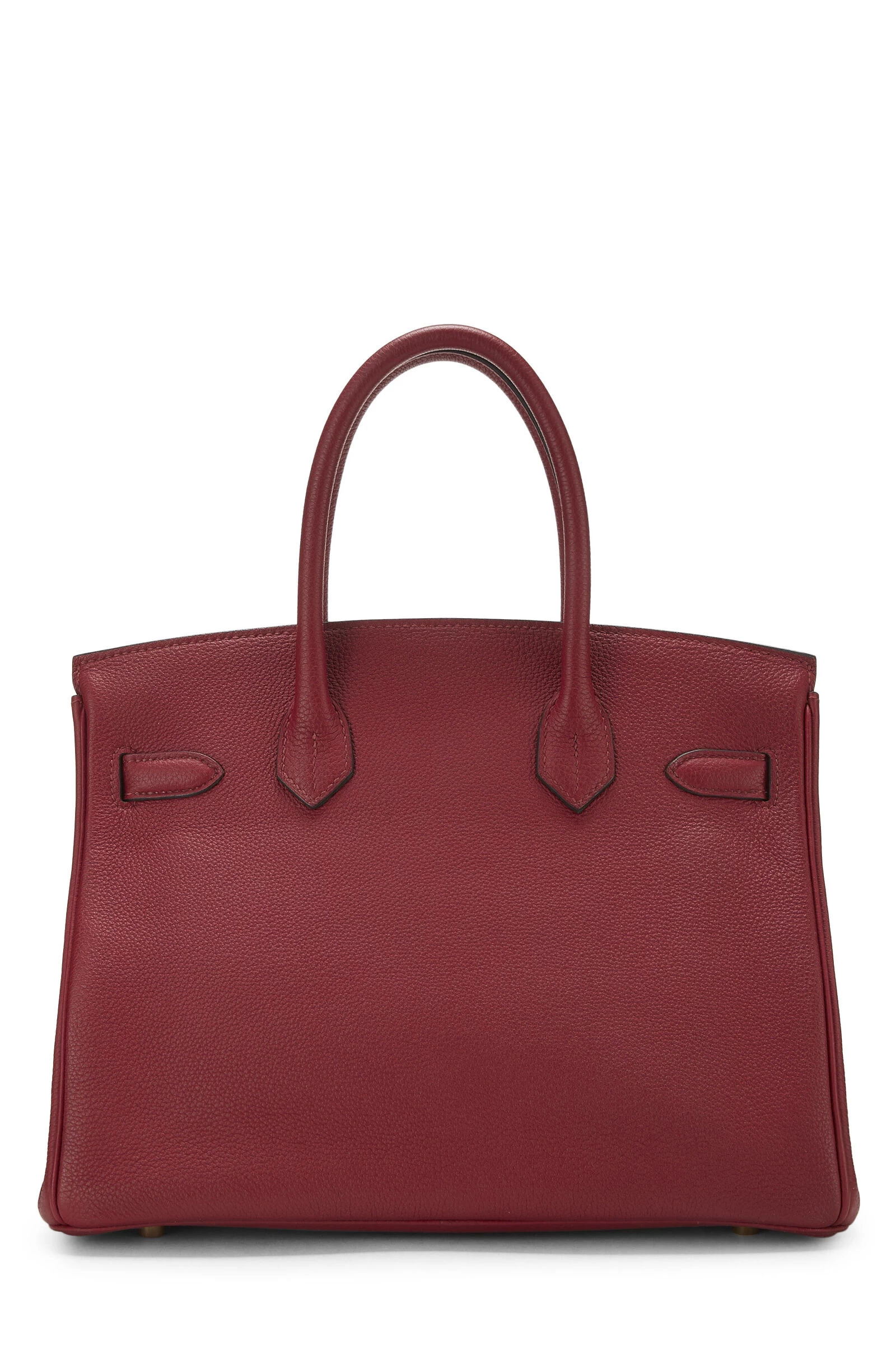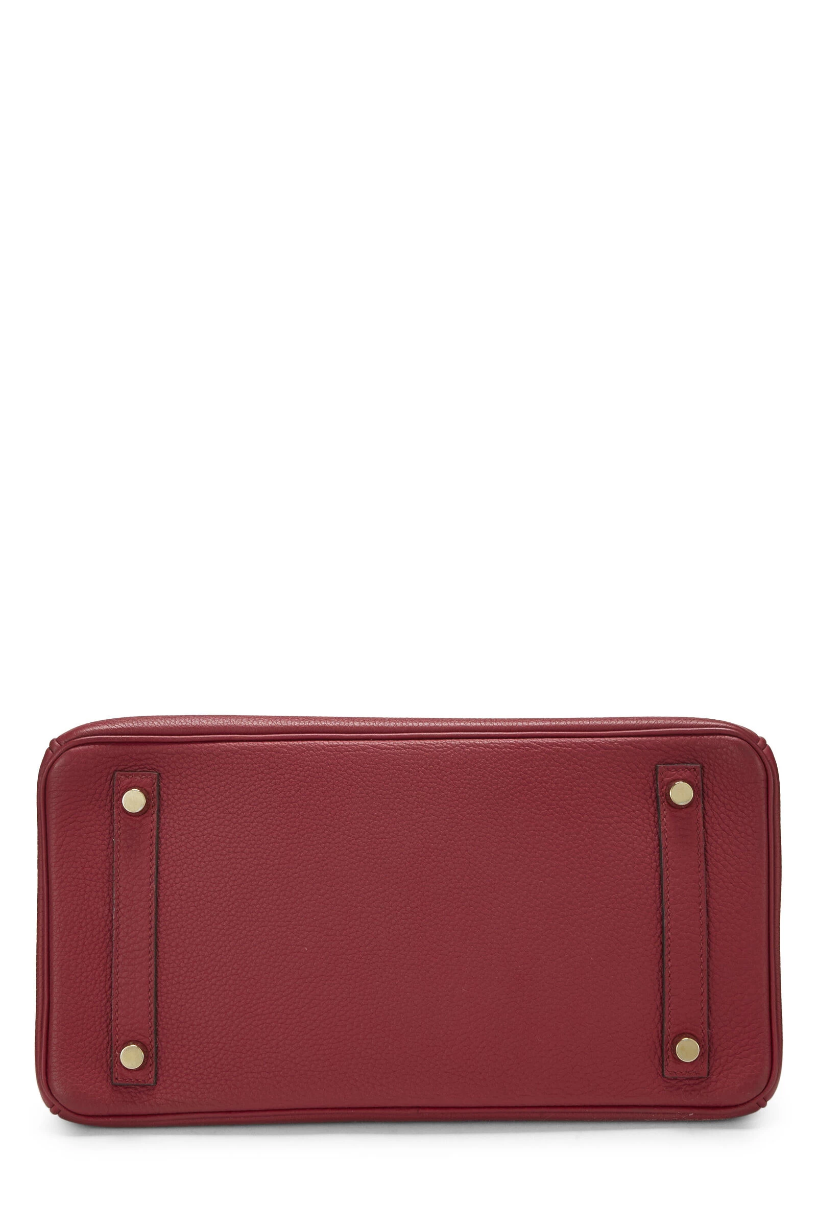 Classic Birkin rendered in red Rouge Grenat Togo leather and accented with gold-plated hardware. Togo leather is a durable calfskin with a medium grain known for its resilience to scratches and ability to be repaired easily. Includes lock, two keys and clochette.