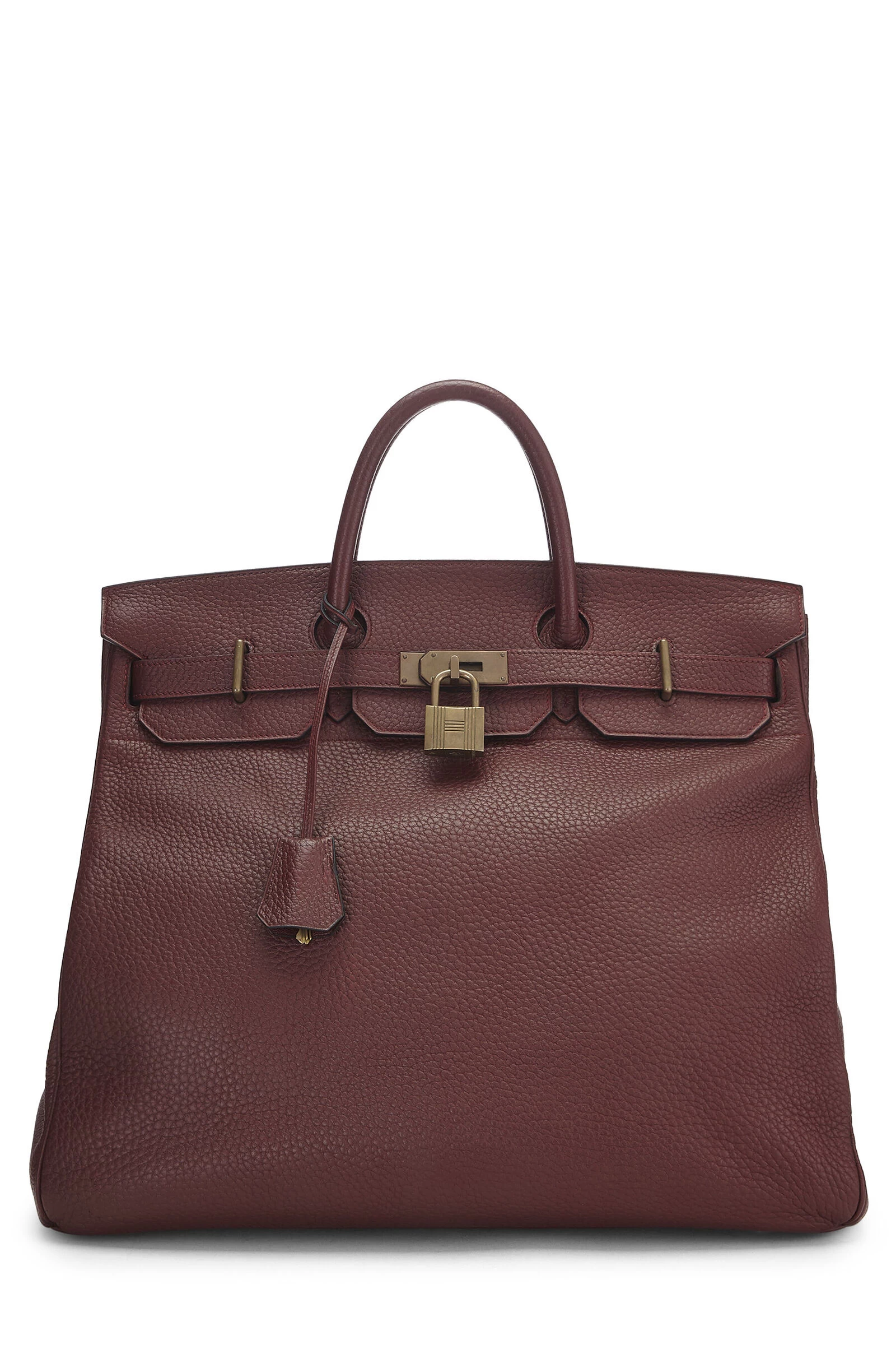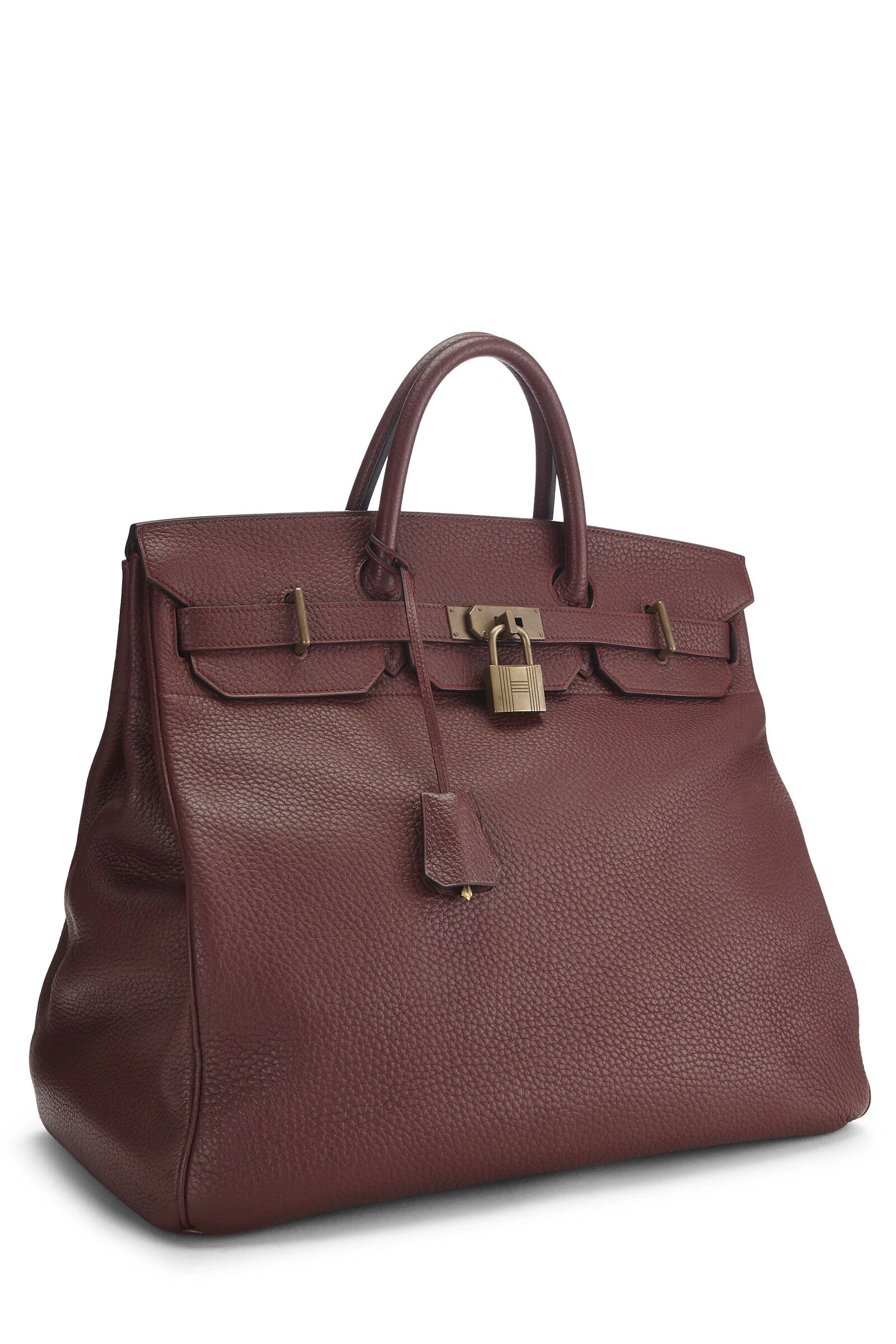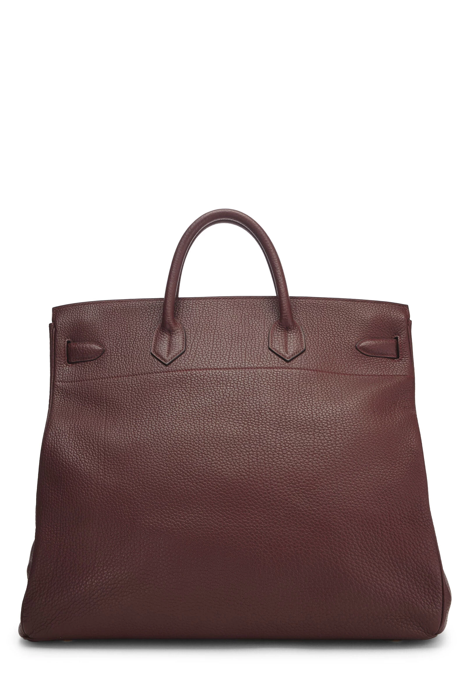 Classic Hermès Haut à Courroies Birkin in classic Rouge H red Fjord leather and accented with brass hardware. The HAC was created by Emile-Maurice Hermès in 1892, modeling it after leather totes carried by Argentinian cowboys. Fjord leather is a textured, velvet-soft, matte leather with a highly-visible grain made from adult bull leather that is naturally scratch-resistant (even more so than Togo or Clemence) and is even water-resistant Includes lock, two keys, clochette and rain jacket.