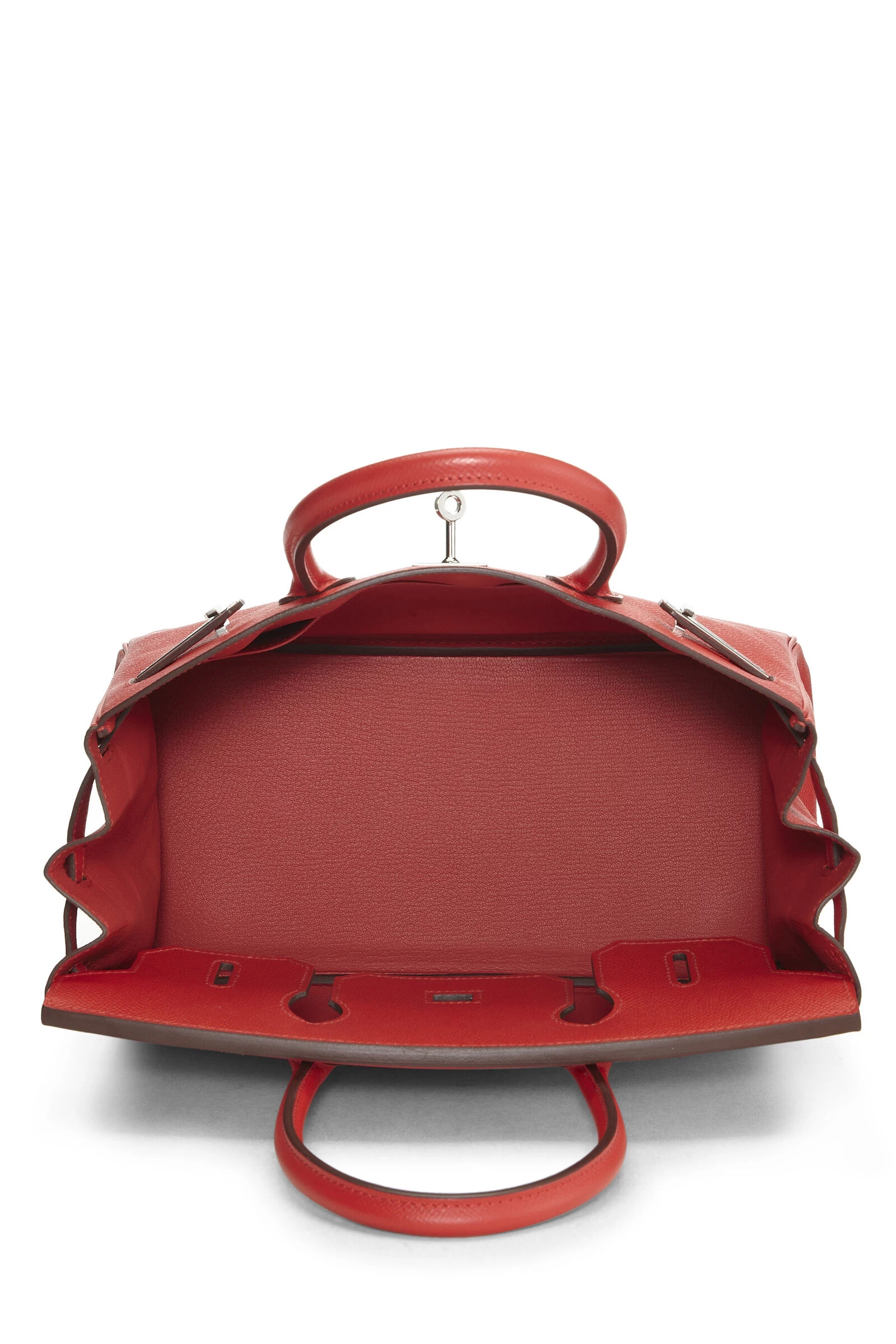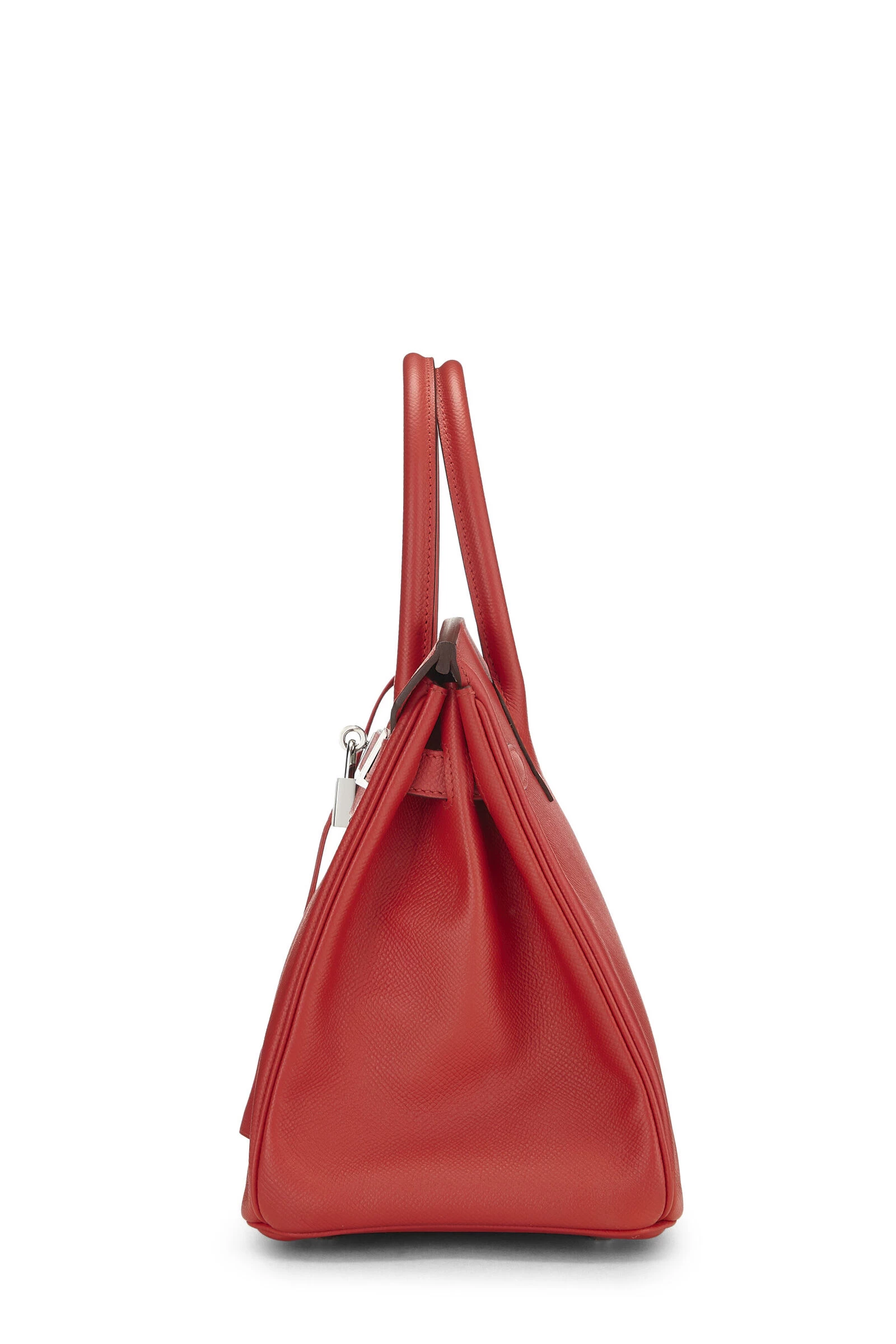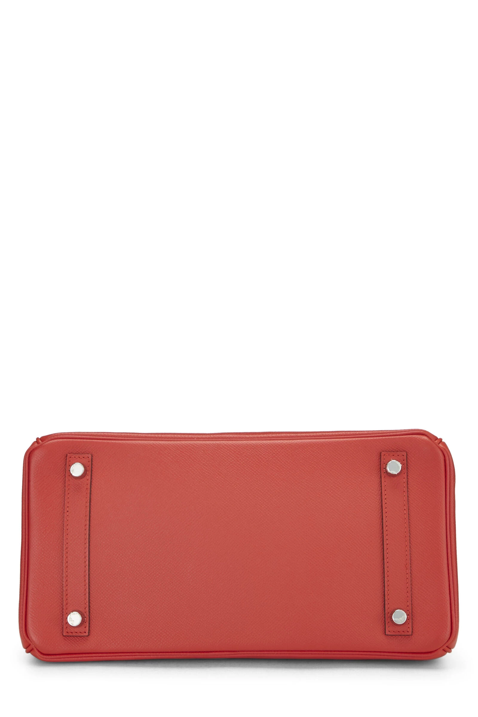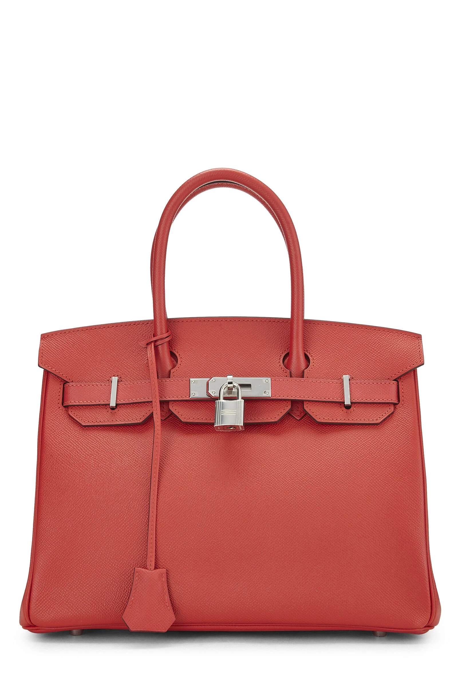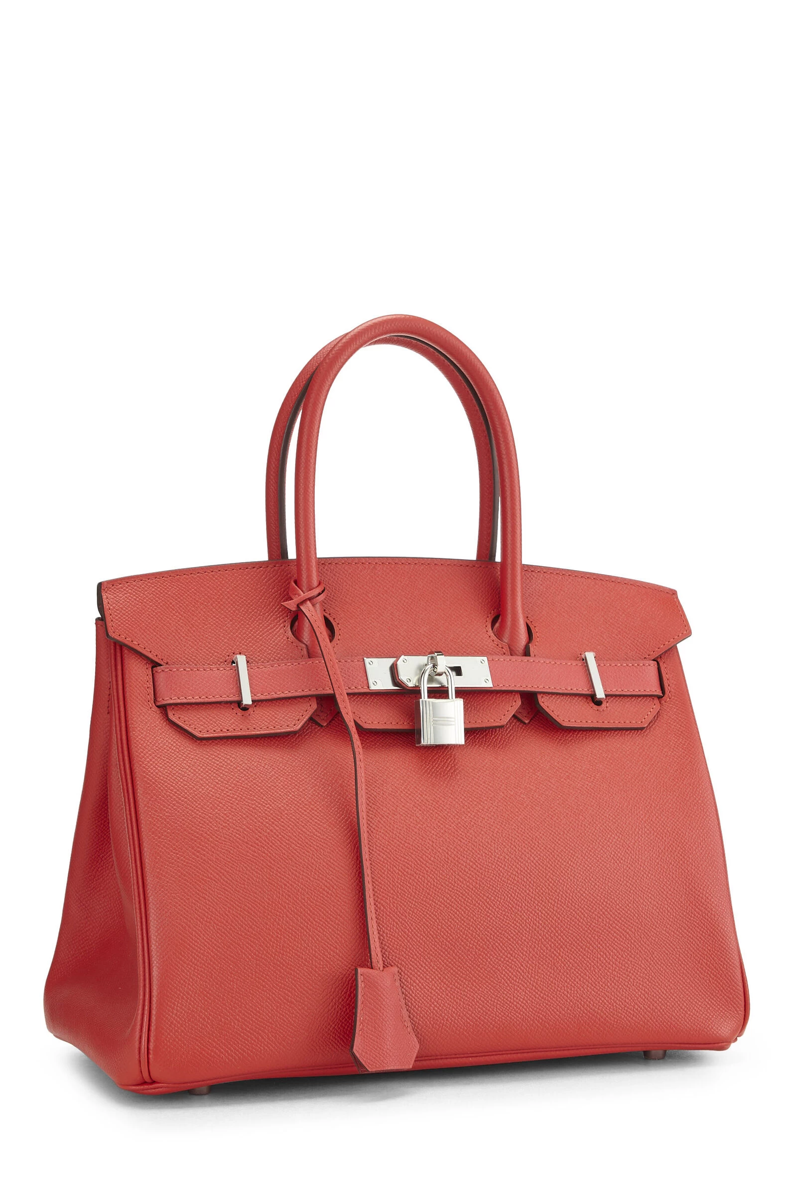 Rouge Tomate red Birkin rendered in Epsom leather and accented with Palladium-plated hardware. Epsom leather is the most lightweight and easy to clean of all Hermès leathers, it is embossed for a consistent grain and increased durability that will hold shape and does not scratch easily. Includes lock, two keys and clochette.