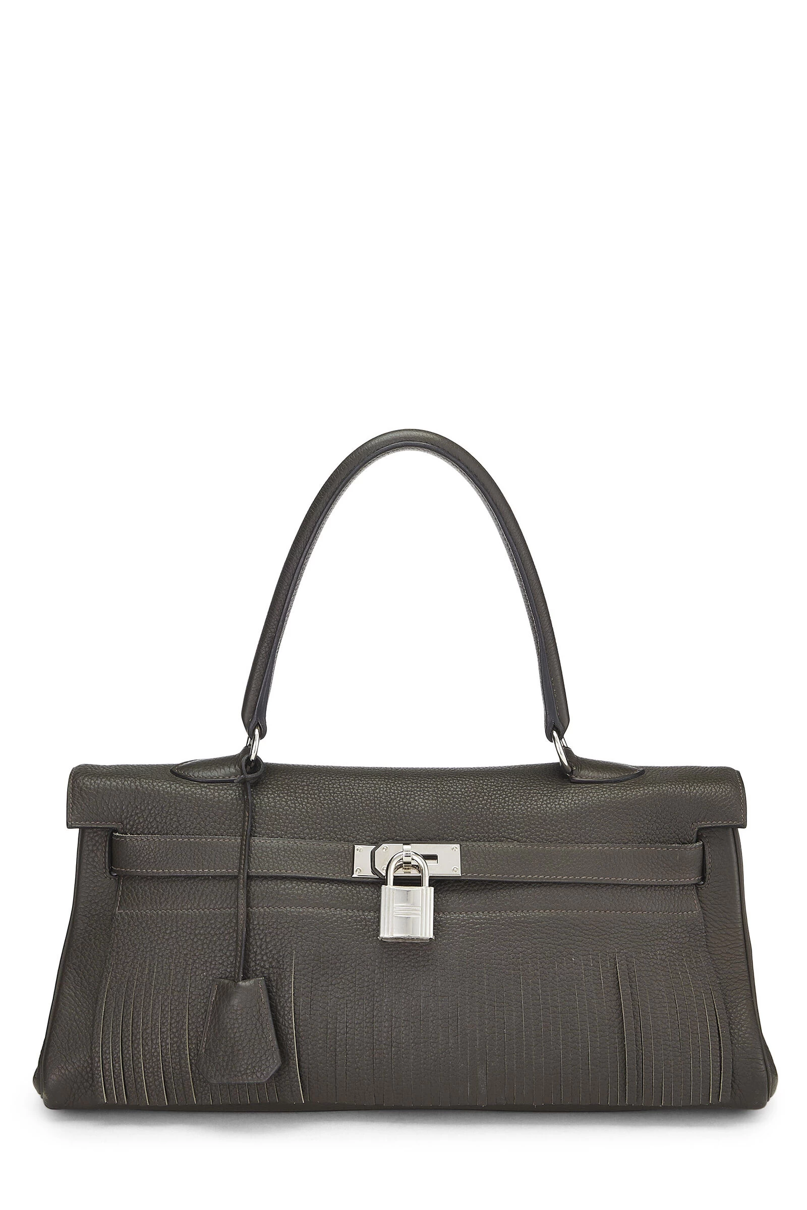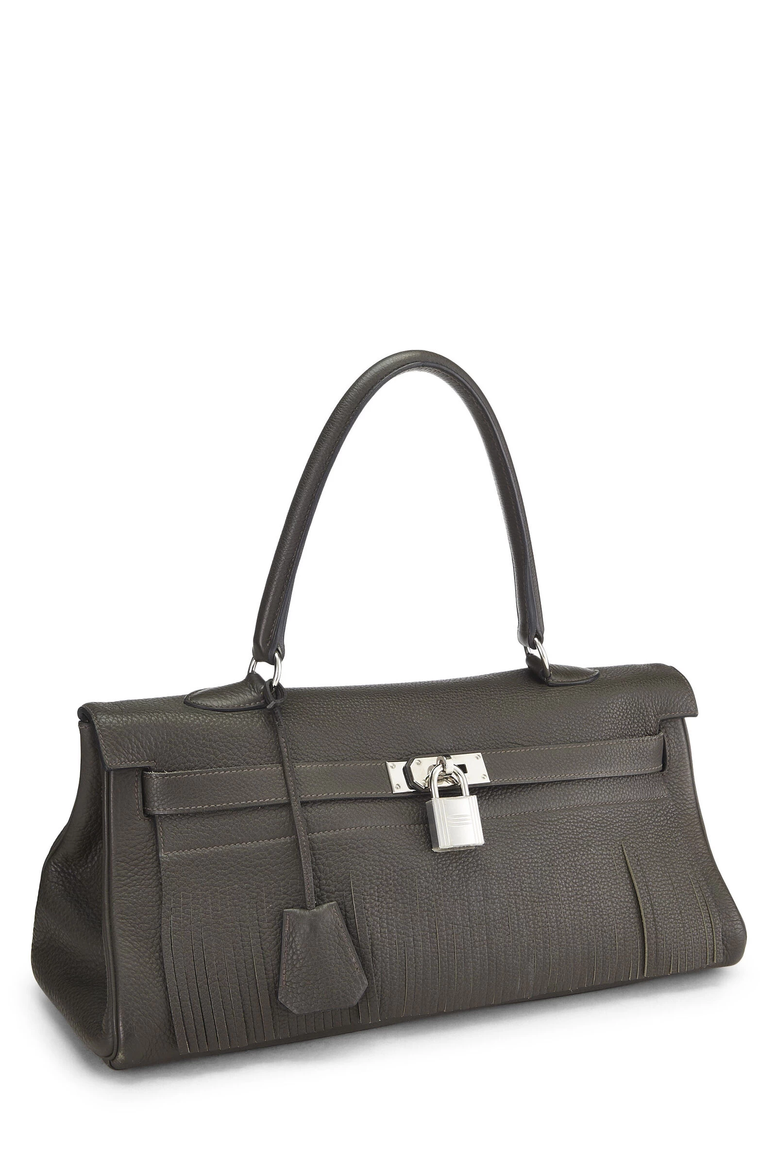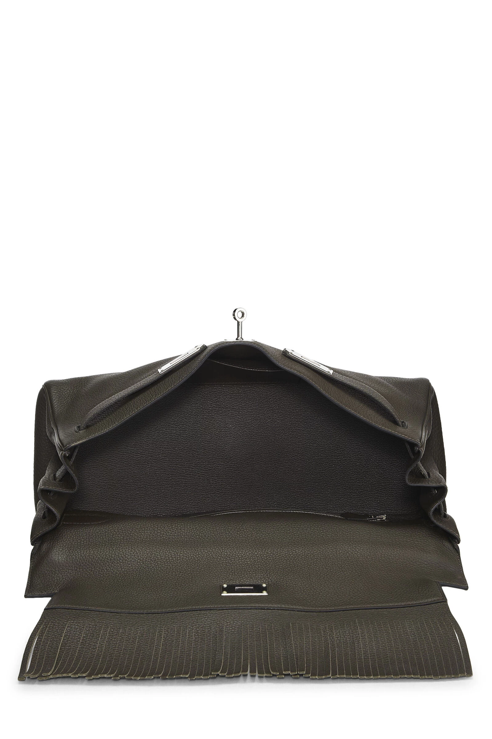 Designed by Jean Paul Gaultier for Hermès and debuted in 2009, the Shoulder Kelly is a modern take on a classic. With a wider, shorter silhouette, the bag features an elongated strap to be worn over the shoulder as the name would suggest. This limited edition version is crafted in Vert Gris Clemence leather with Palladium-plated hardware and features fringe trim along the front. Clemence leather is a thick and durable calfskin with a medium textured grain known for resisting scratches, its ability to be refurbished, and a soft relaxed feel with use, Includes lock, two keys and clochette.