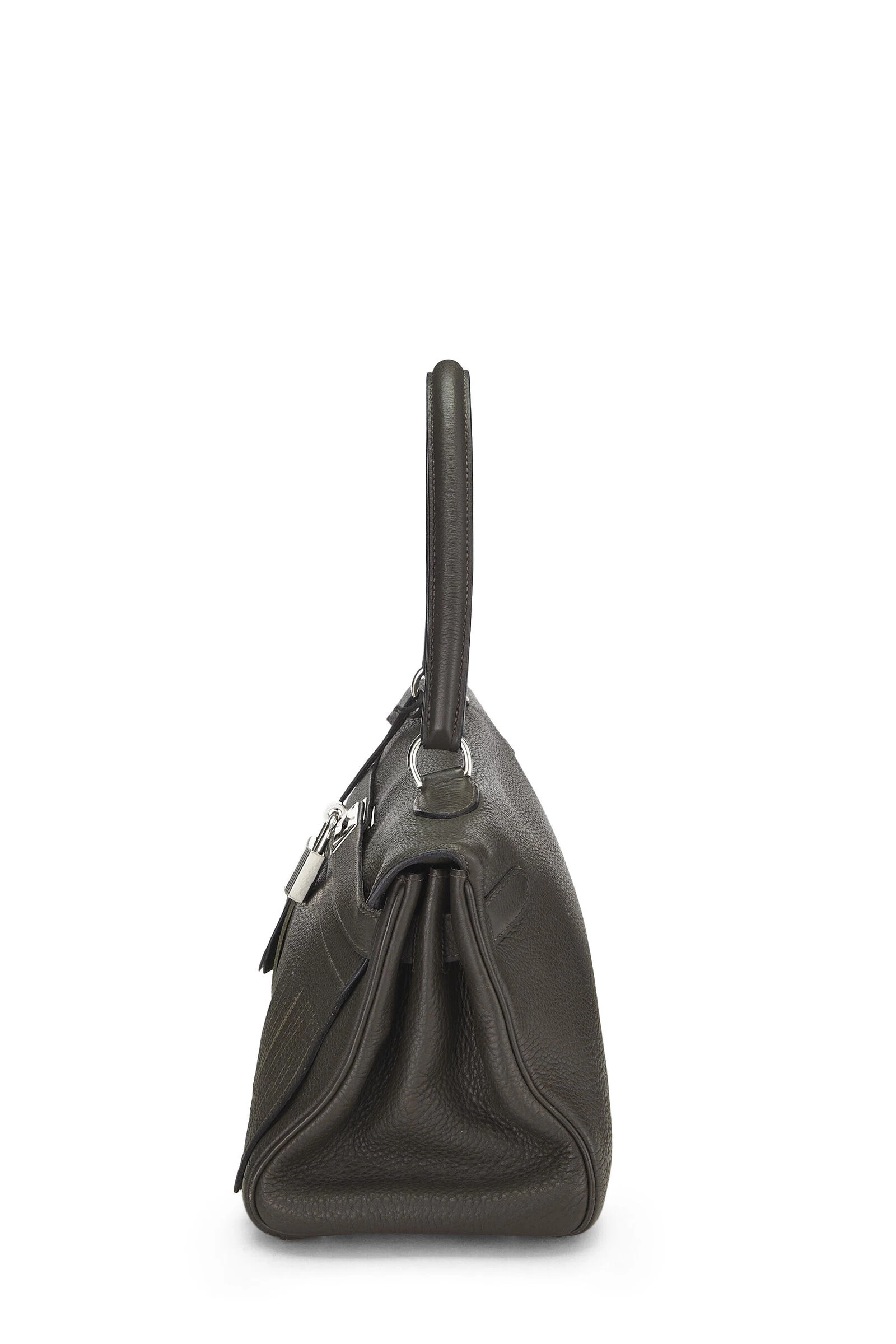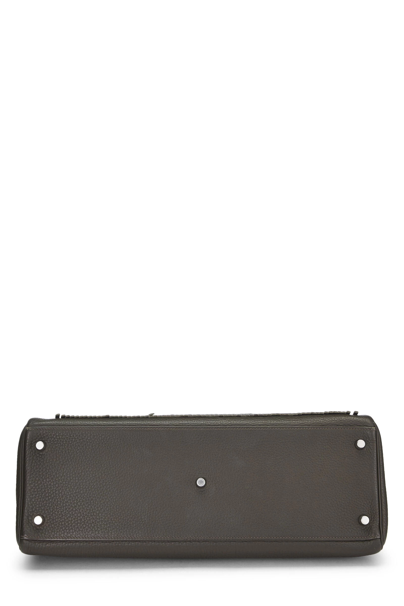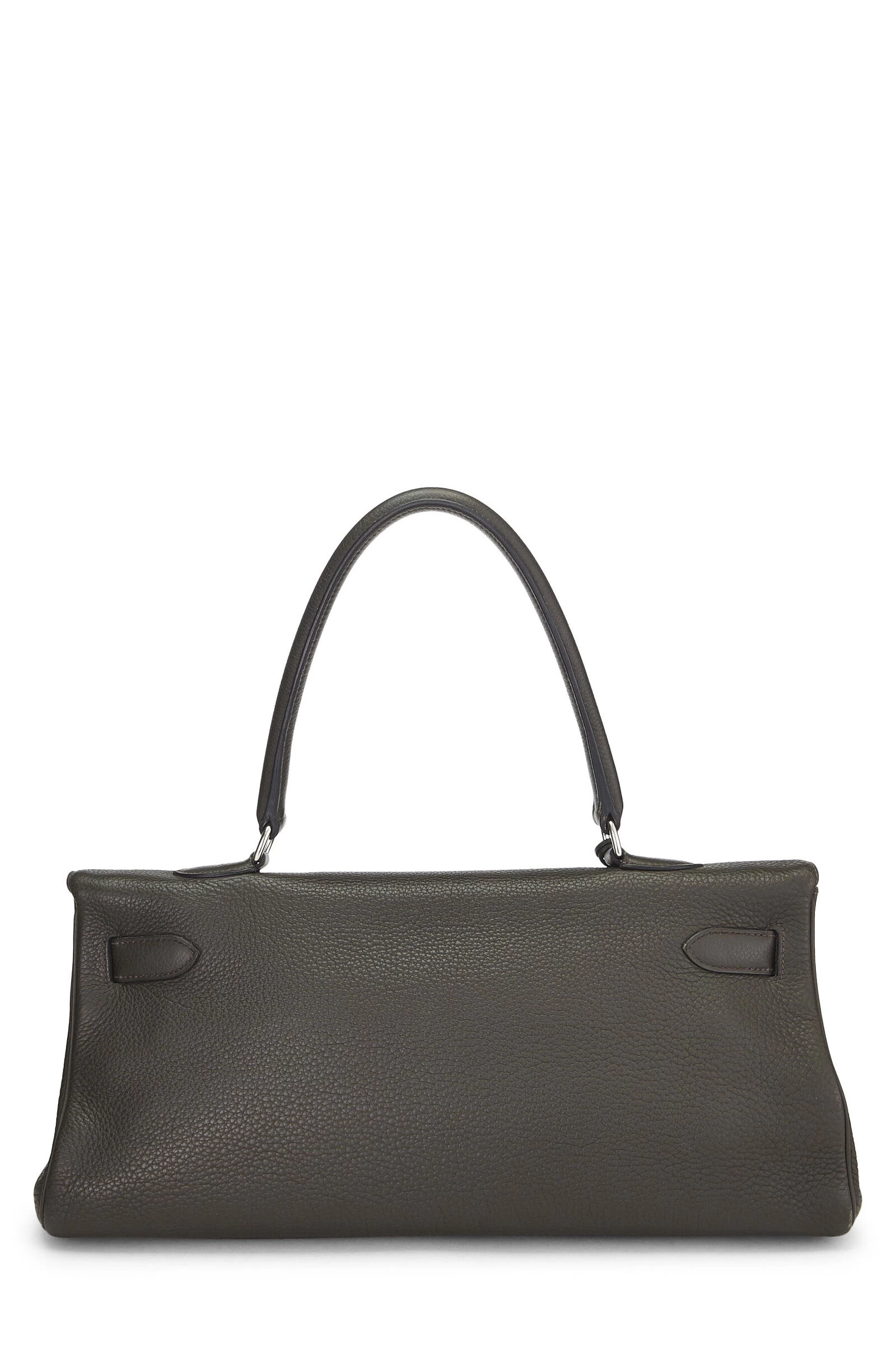 Designed by Jean Paul Gaultier for Hermès and debuted in 2009, the Shoulder Kelly is a modern take on a classic. With a wider, shorter silhouette, the bag features an elongated strap to be worn over the shoulder as the name would suggest. This limited edition version is crafted in Vert Gris Clemence leather with Palladium-plated hardware and features fringe trim along the front. Clemence leather is a thick and durable calfskin with a medium textured grain known for resisting scratches, its ability to be refurbished, and a soft relaxed feel with use, Includes lock, two keys and clochette.