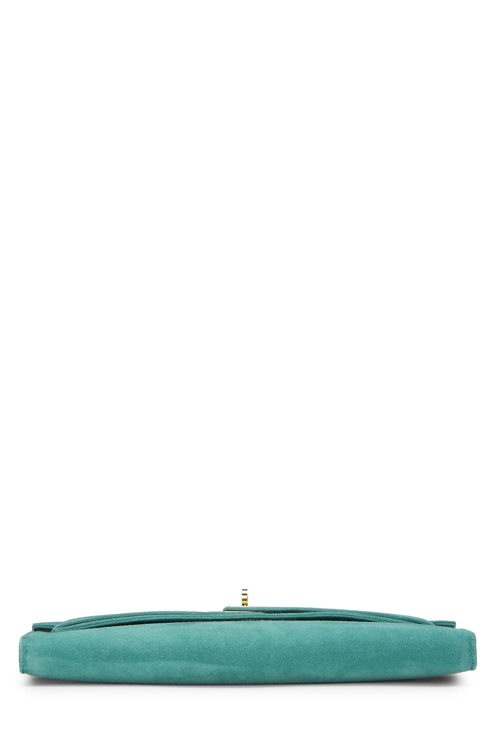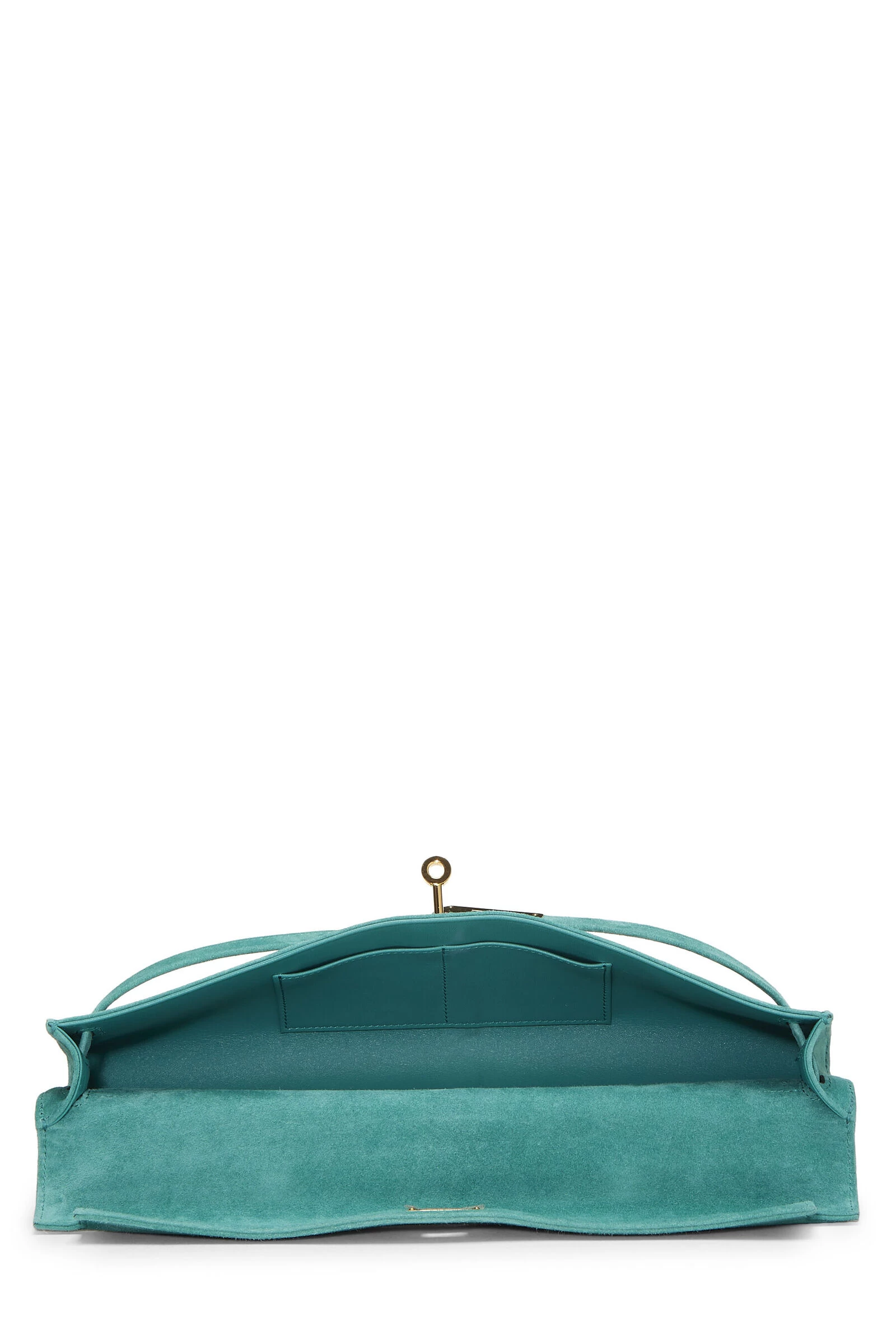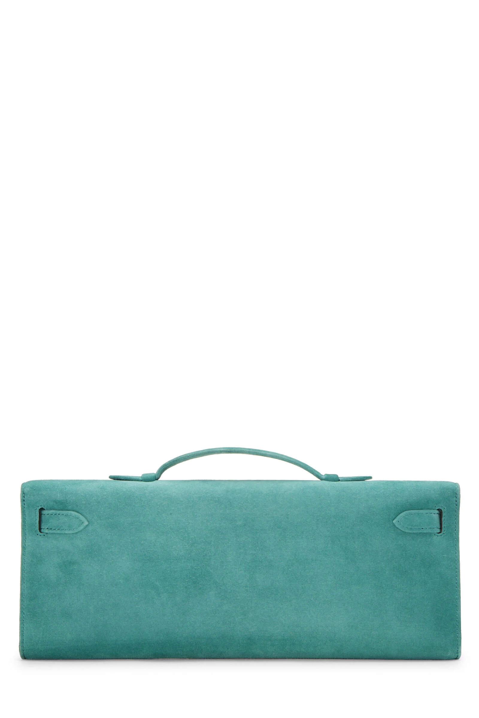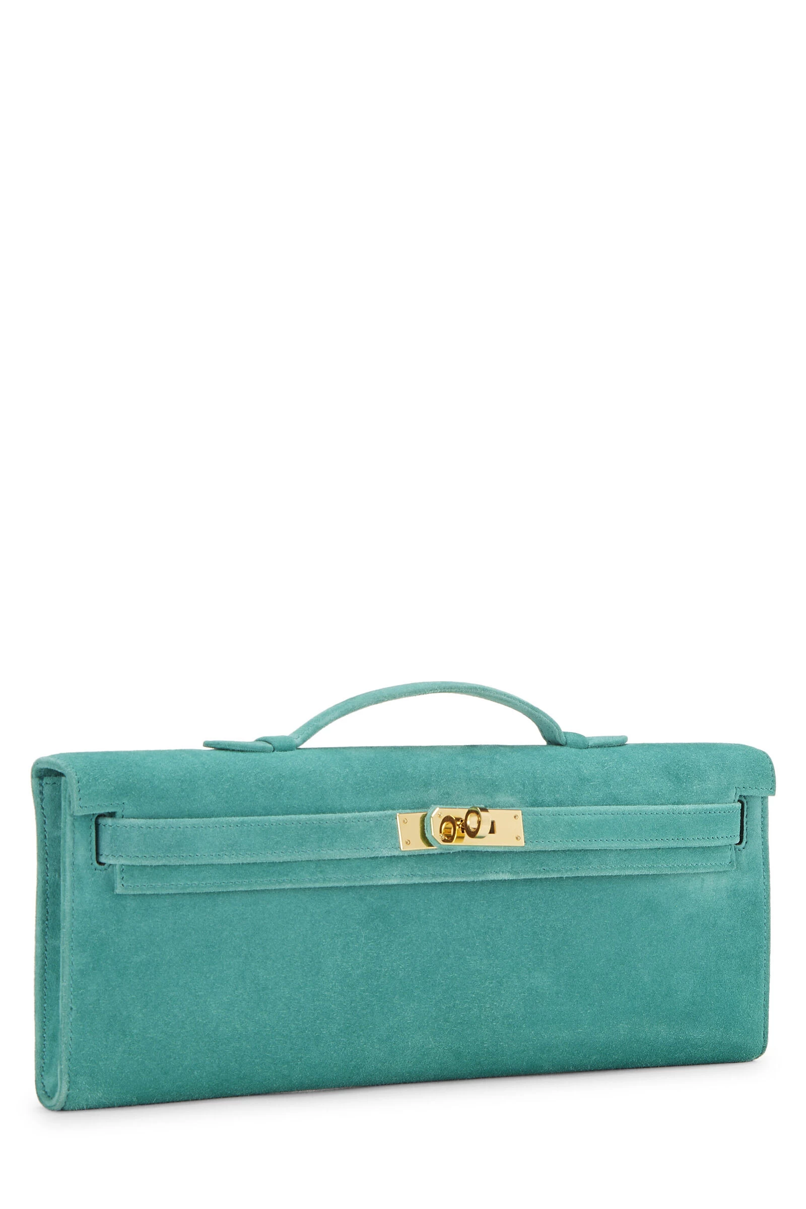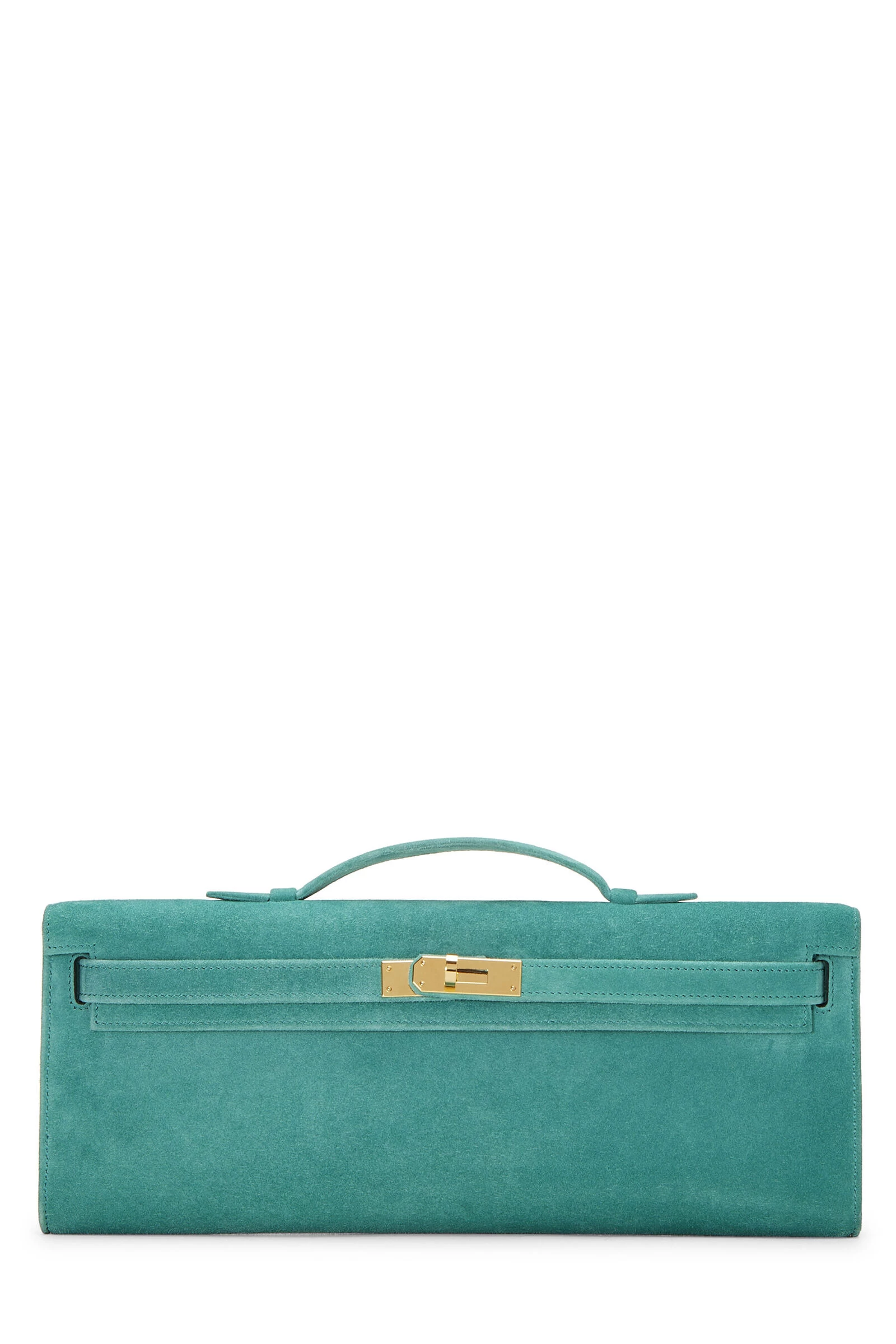 A compact version of the iconic Kelly, this Hermès Cut clutch is crafted in Vert Verone green Doblis suede with a top handle and signature Kelly touret and sangles in gold-plated hardware. Hermès’ Doblis leather is a velvet-like, soft leather that feels incredibly luxurious to the touch but requires a little more maintenance in the long run — it must not be exposed to water and can be prone to fading or scratches without proper care.