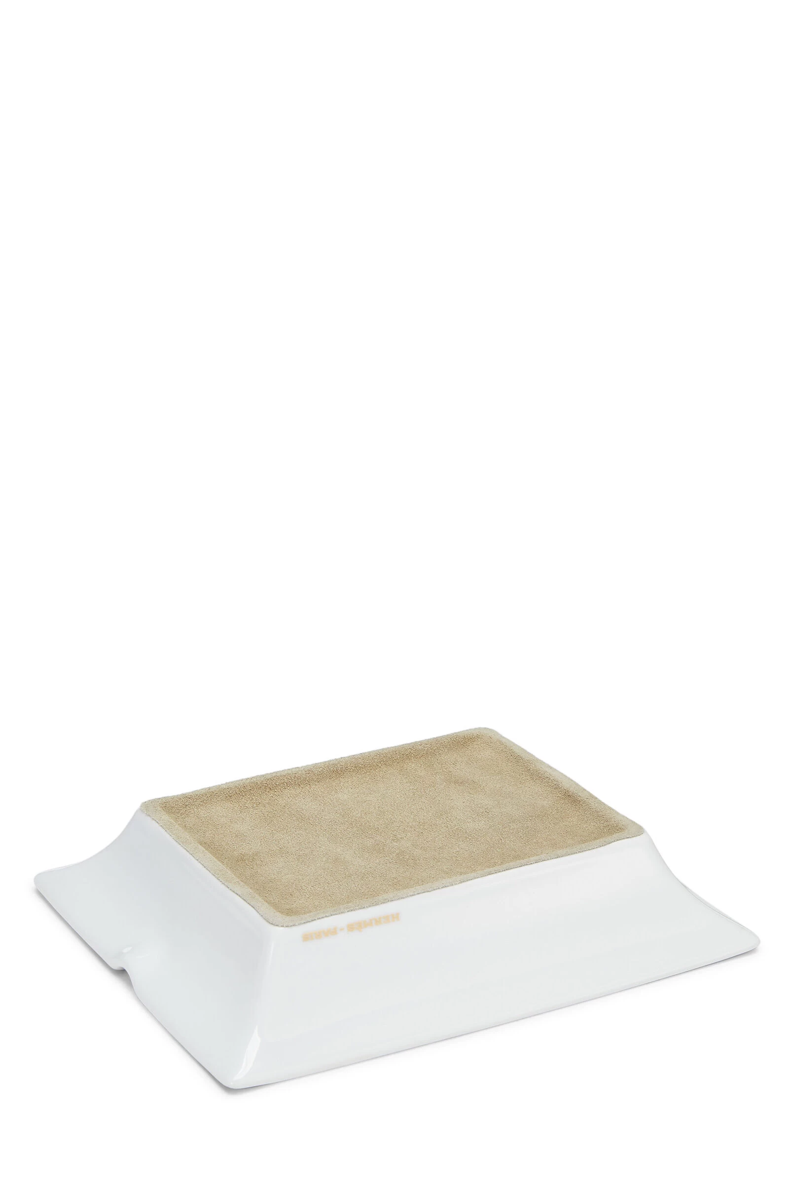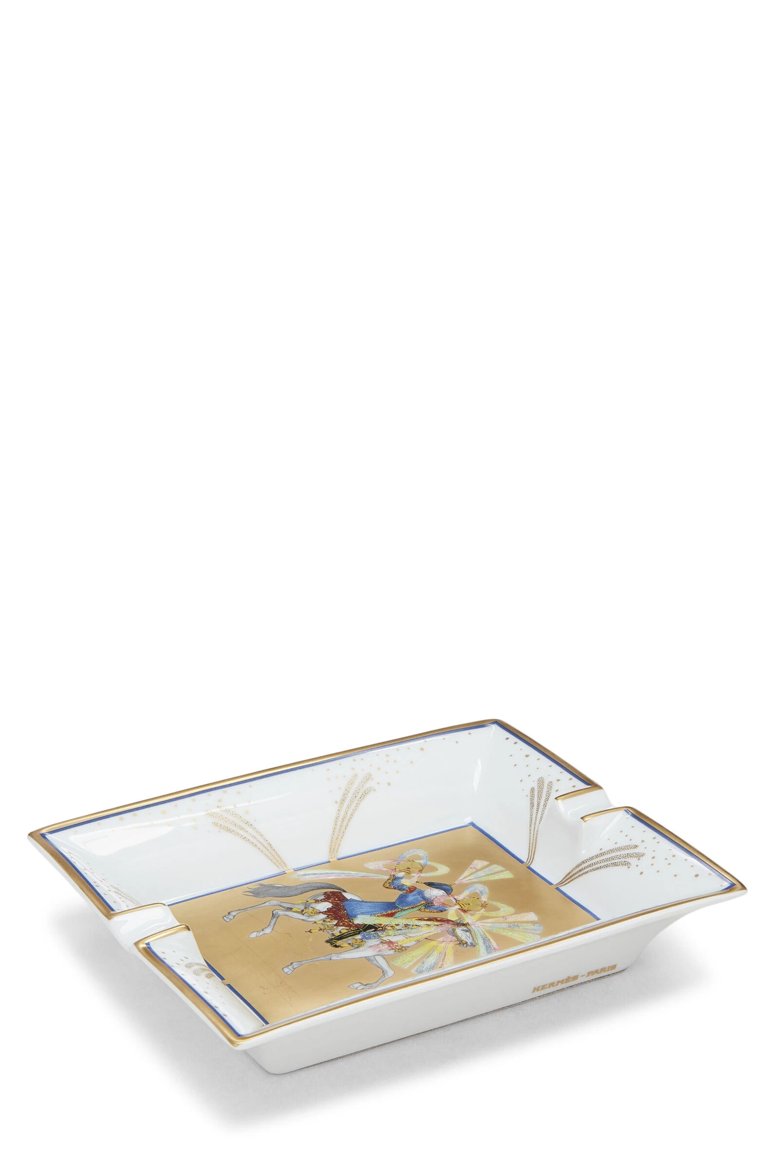 Classic Hermès porcelain ashtray featuring white and multicolor horseback motif, metallic gold-tone accents, and finished with a suede base.