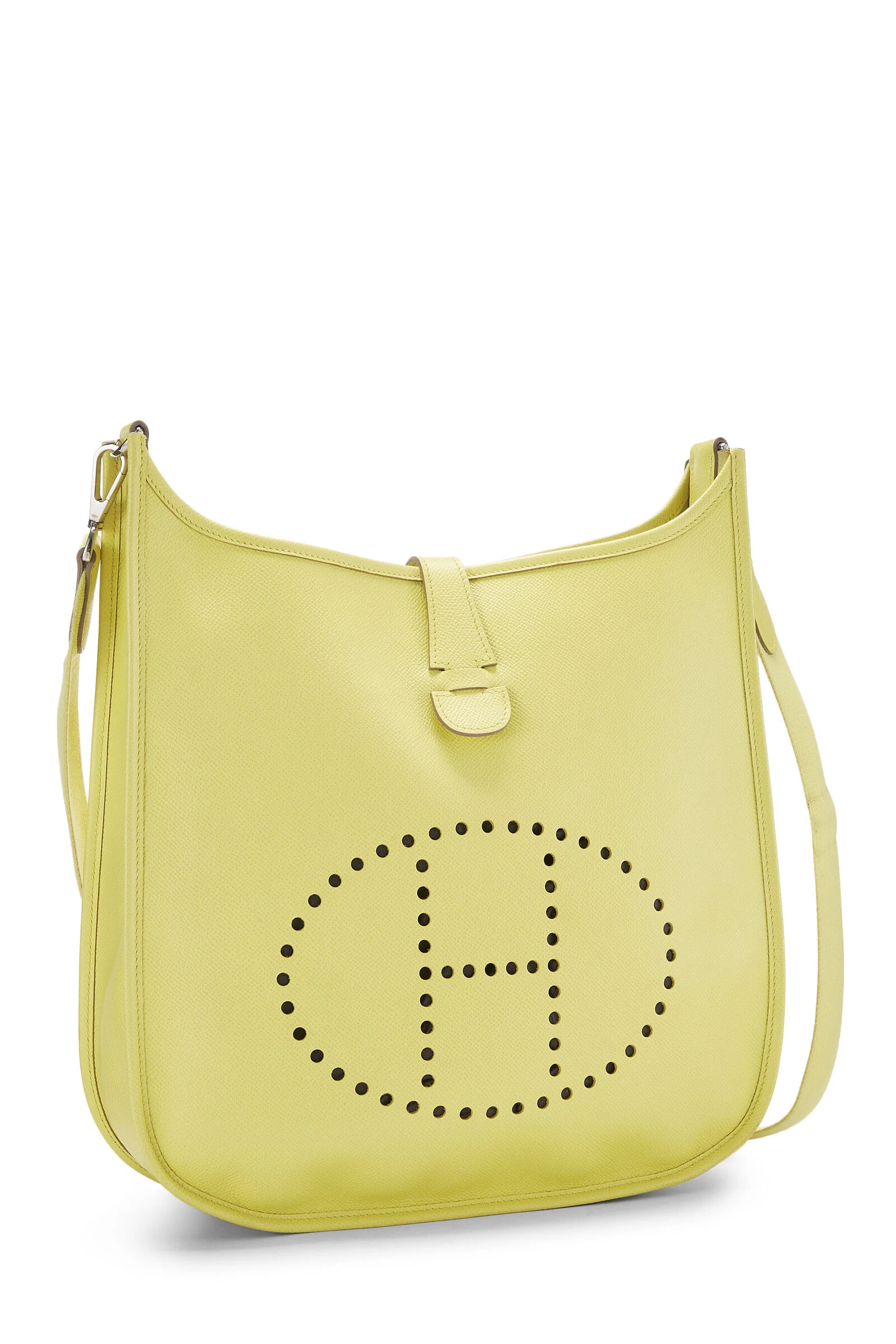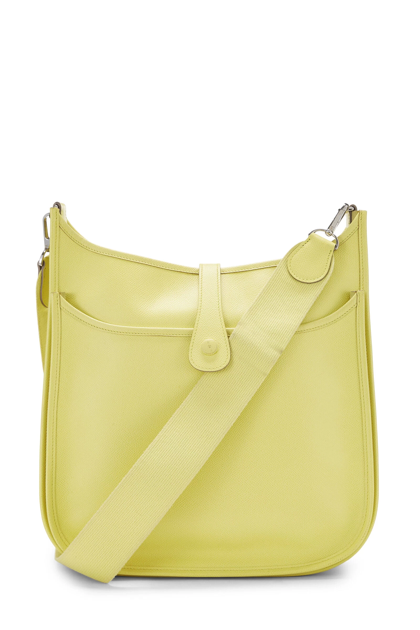 Lime yellow Clemence leather Evelyne III GM accented with Palladium-plated hardware. Clemence leather is a thick and durable calfskin with a medium textured grain known for resisting scratches, its ability to be refurbished, and a soft relaxed feel with use.