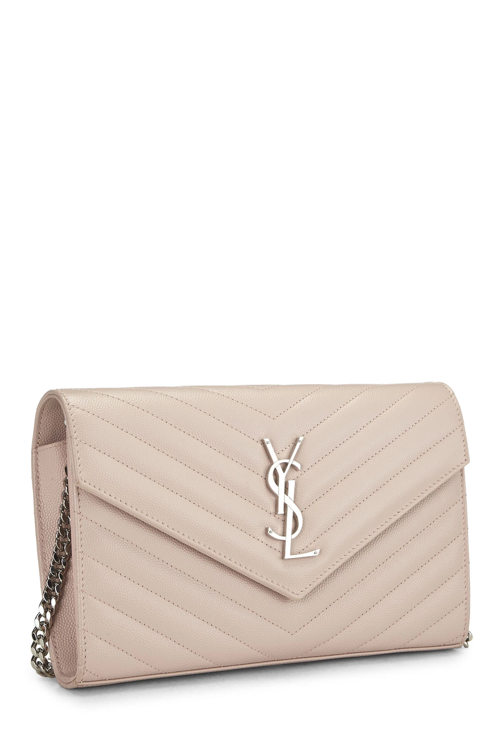 A covetable YSL silhouette, the Kate wallet-on-chain bag is crafted in chevron stitched pink grained leather which adds texture and dimension to the bag, featuring a matching leather interior and finished with silver-tone metal ‘YSL’ logo hardware . The shoulder strap is detachable for carry as a clutch or wallet.