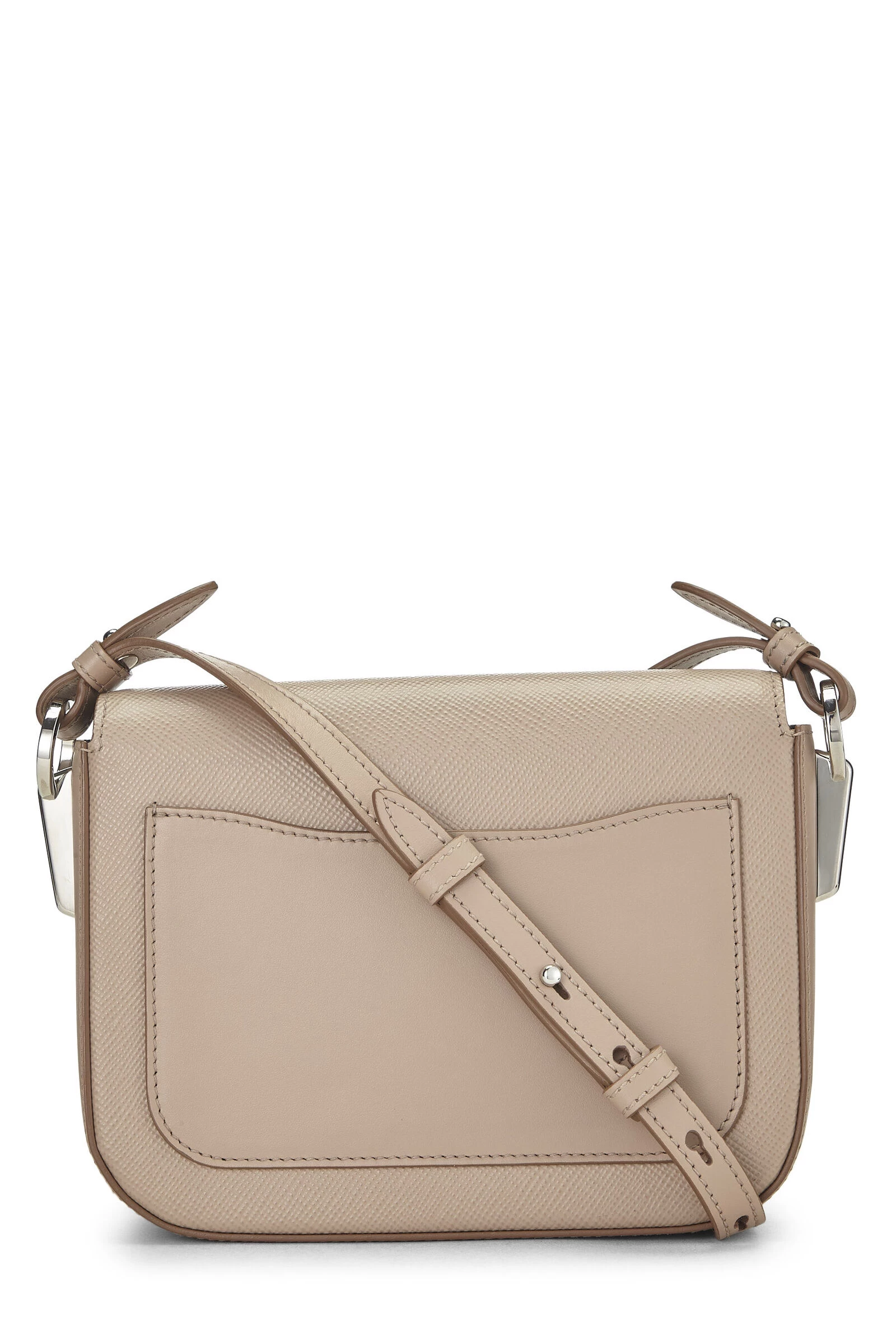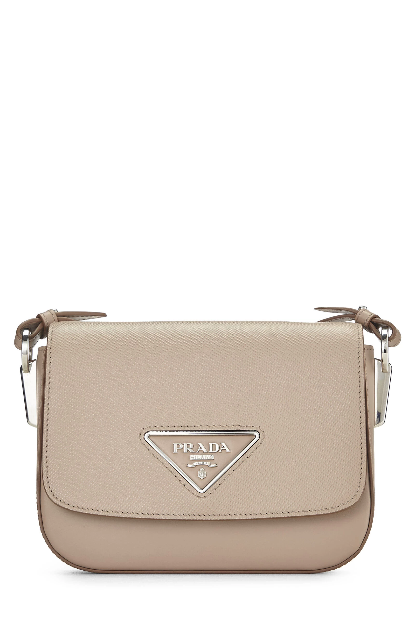 Sleek Prada shoulder bag rendered in the house’s classic Saffiano leather – featured here in beige. Finished with silver-tone hardware, this trendy silhouette features the iconic Prada logo on the front flap while the Interior is rendered in contrast lambskin leather. Perfectly versatile, the leather strap is removable and adjustable.