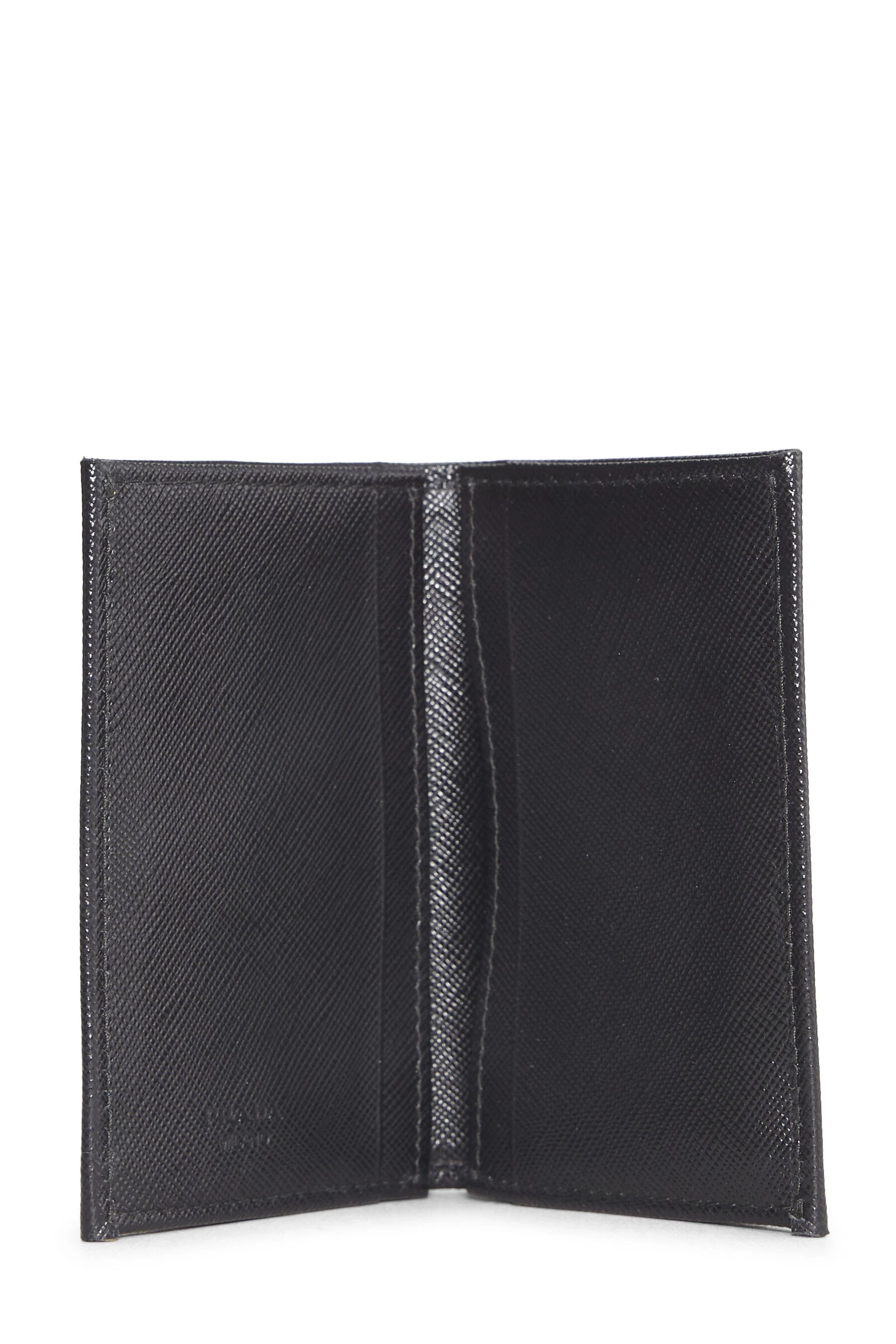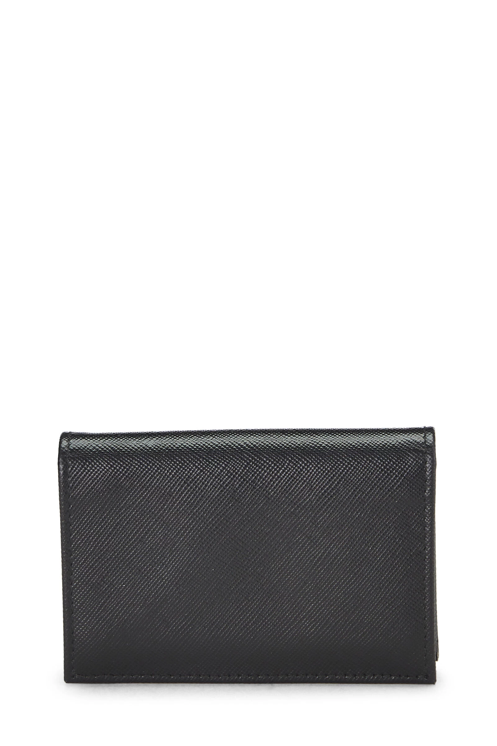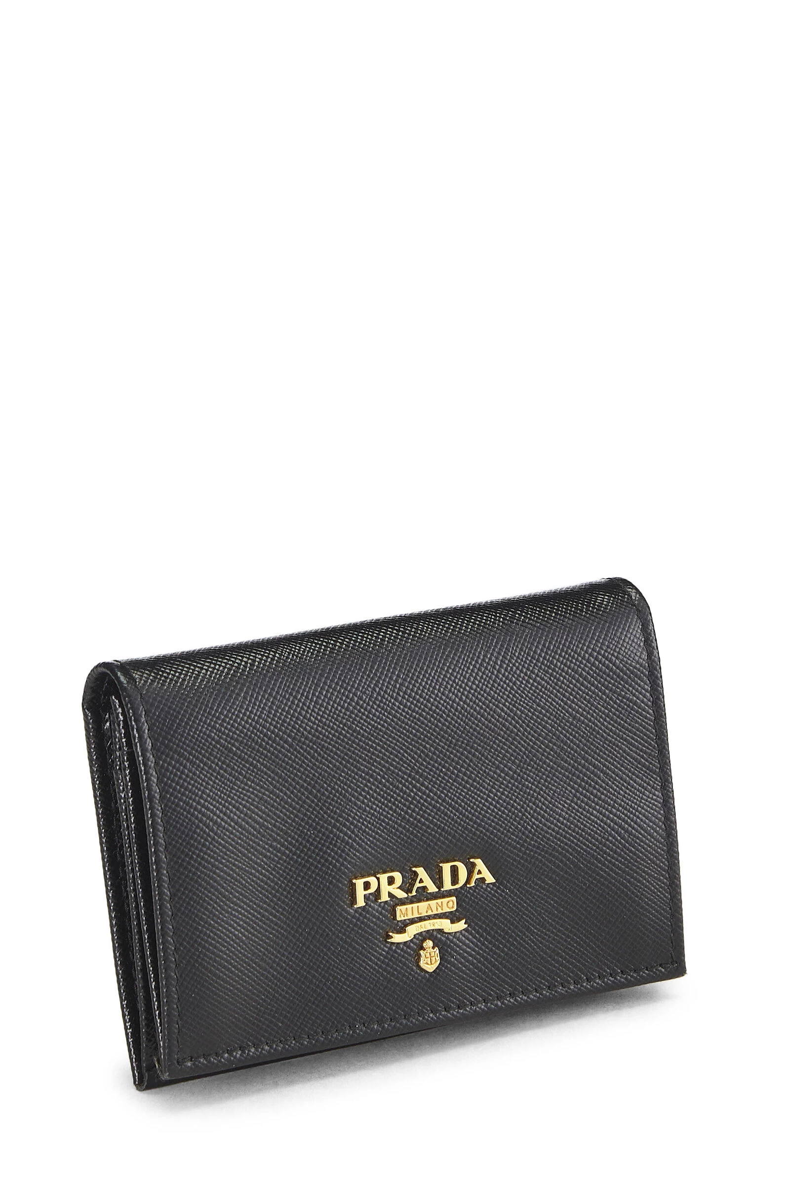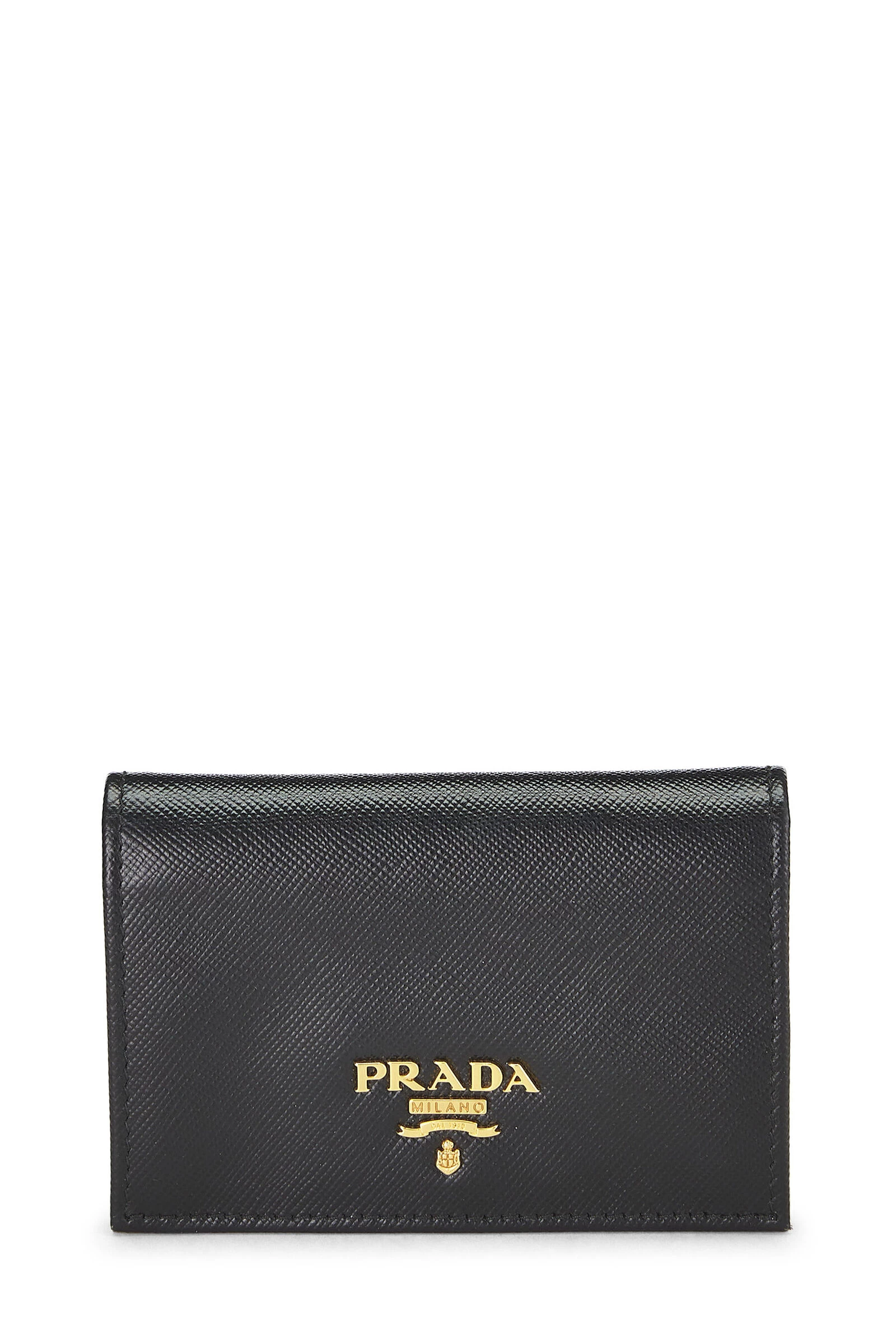 Black cardholder rendered in Prada’s signature stamped Saffiano leather that is incredibly durable and scratch-resistant, featuring a gold-tone metal logo at the front.