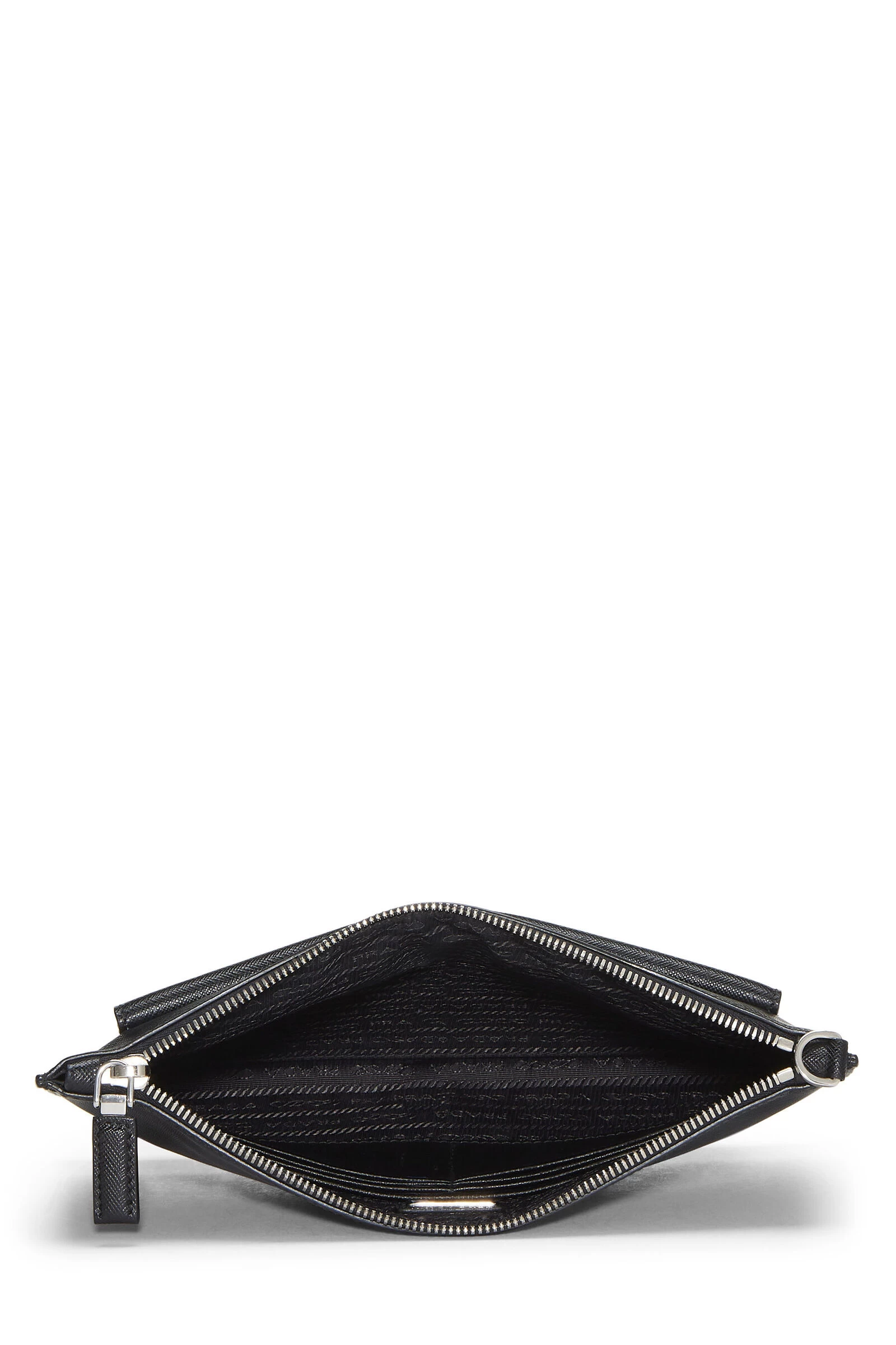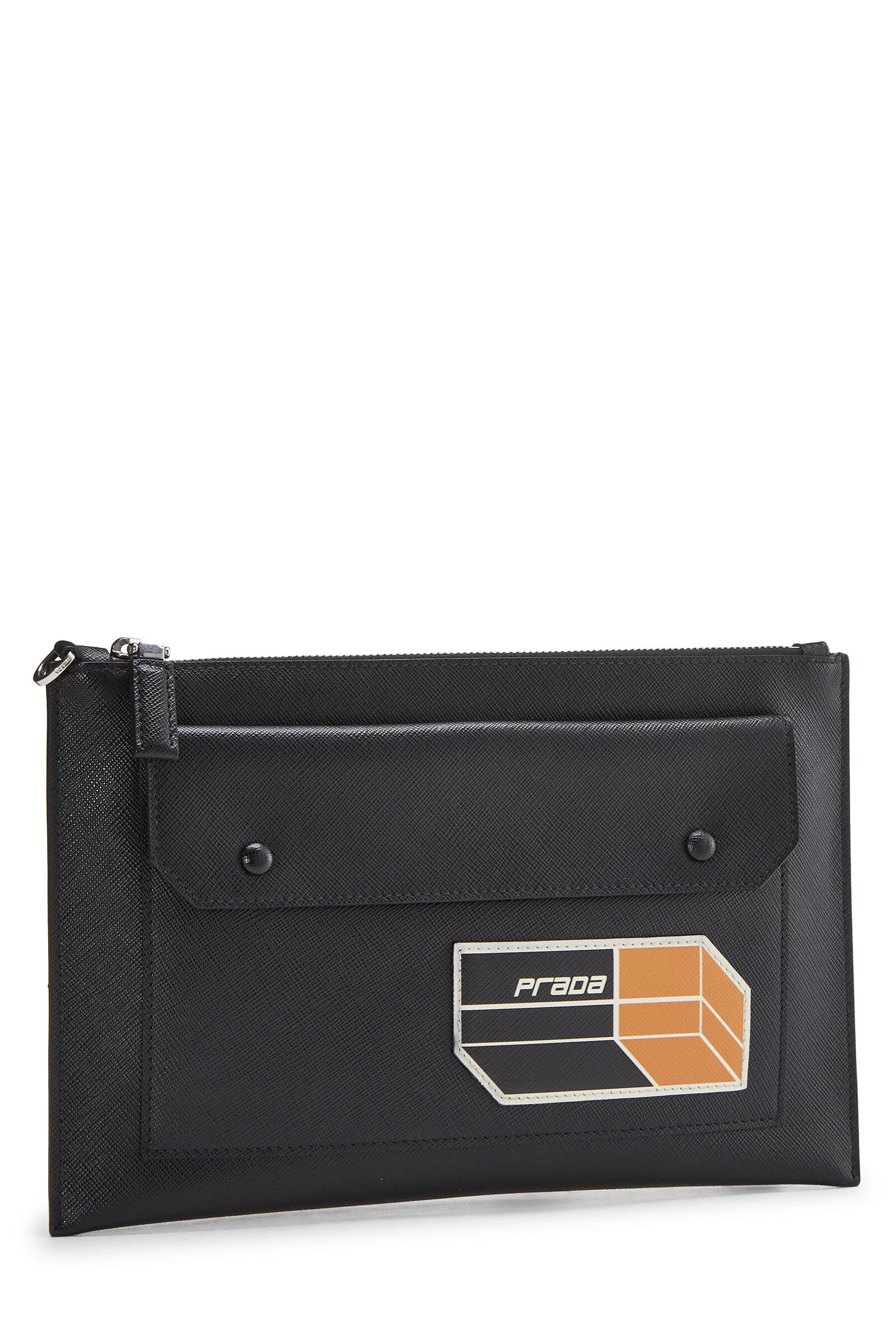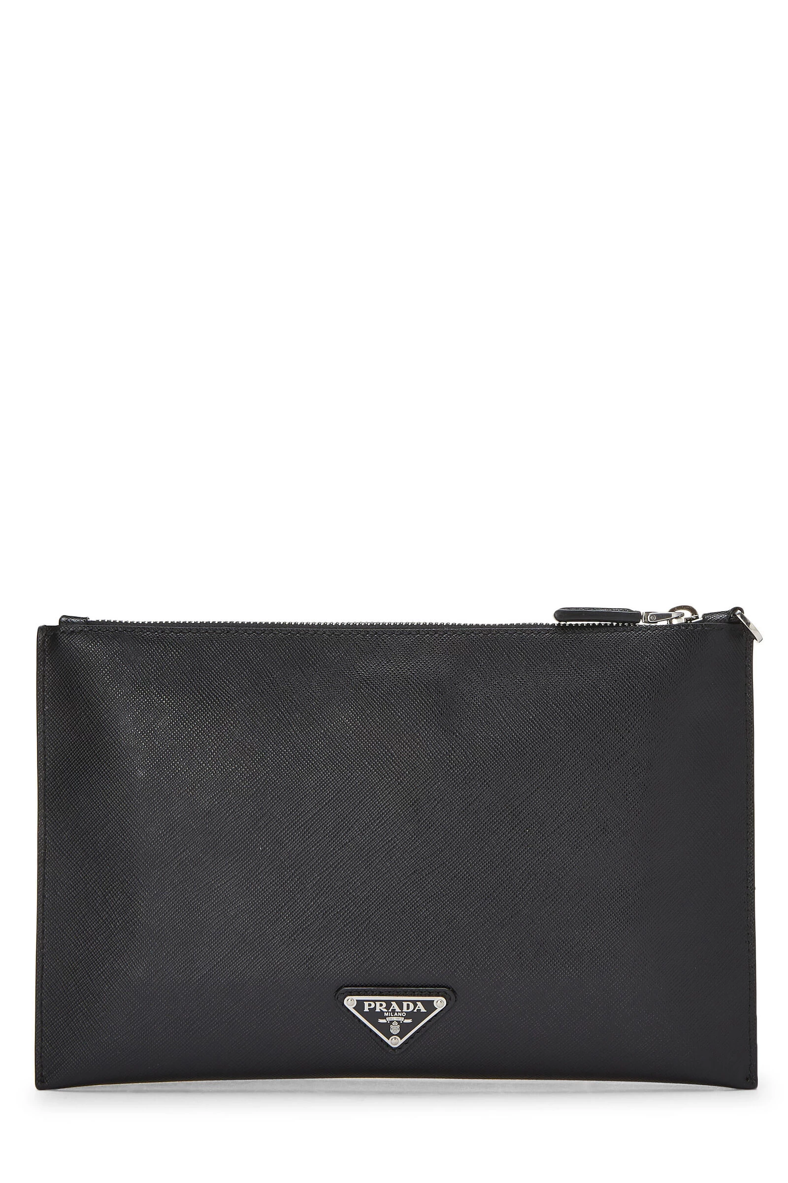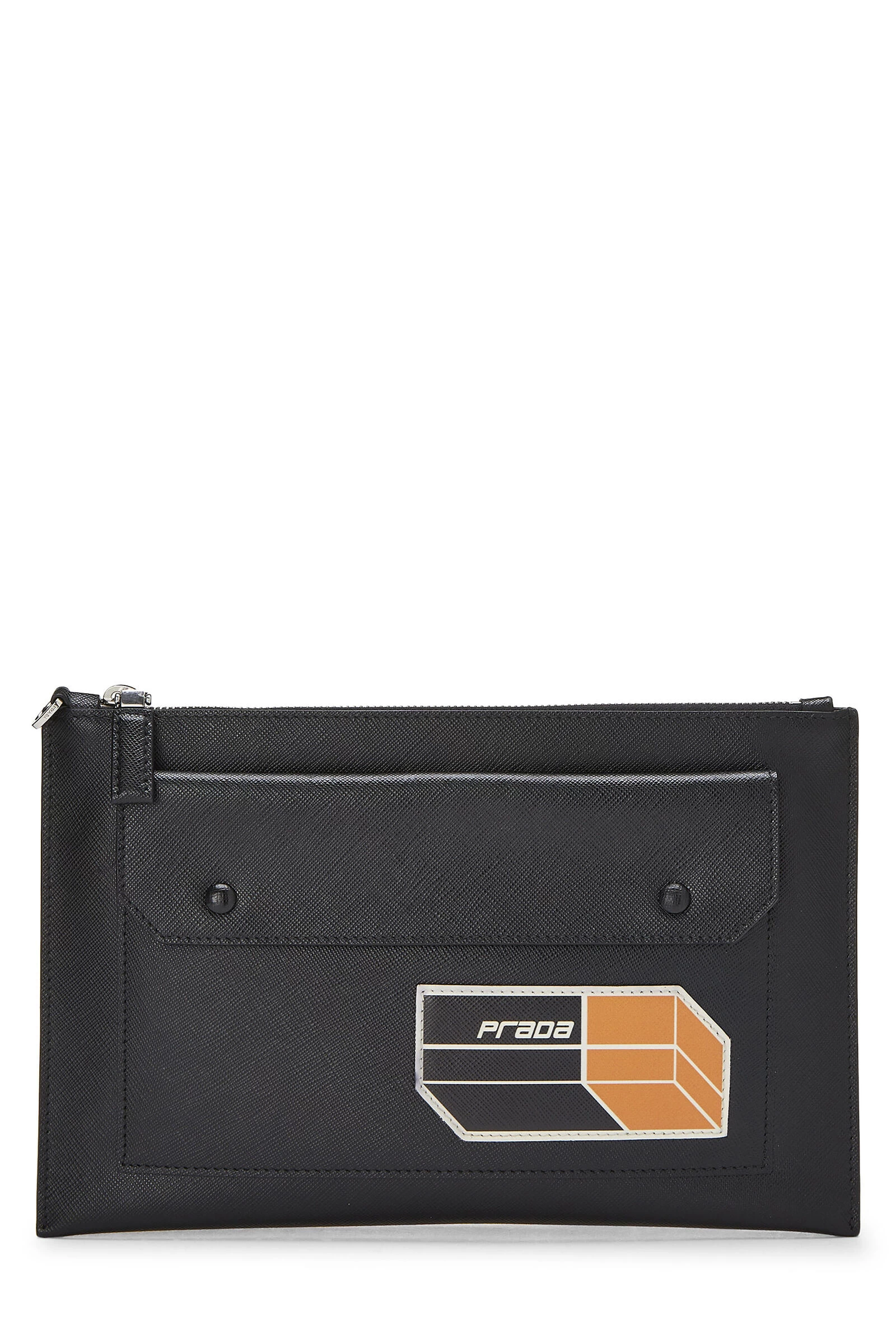 Ultra-chic long Prada clutch rendered in the house standard Saffiano leather in classic black. This modern version of a classic on-the-go clutch features an embroidered Prada applique on an exterior flap pocket.
