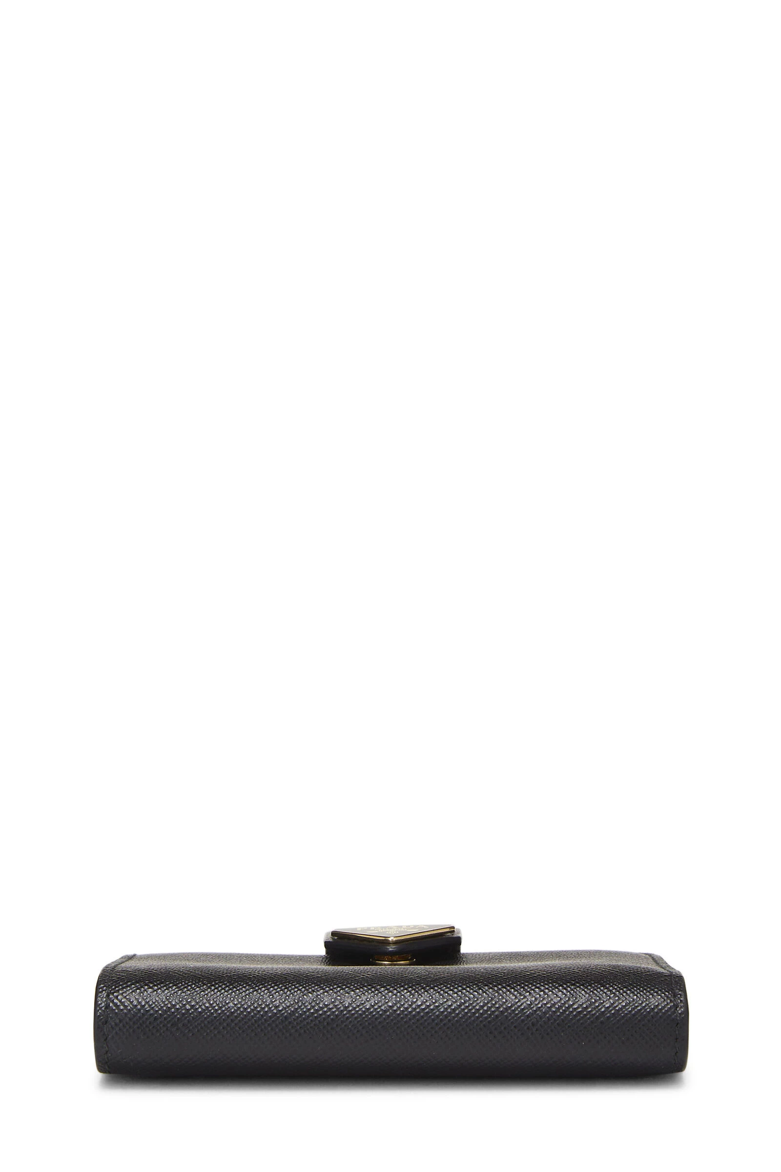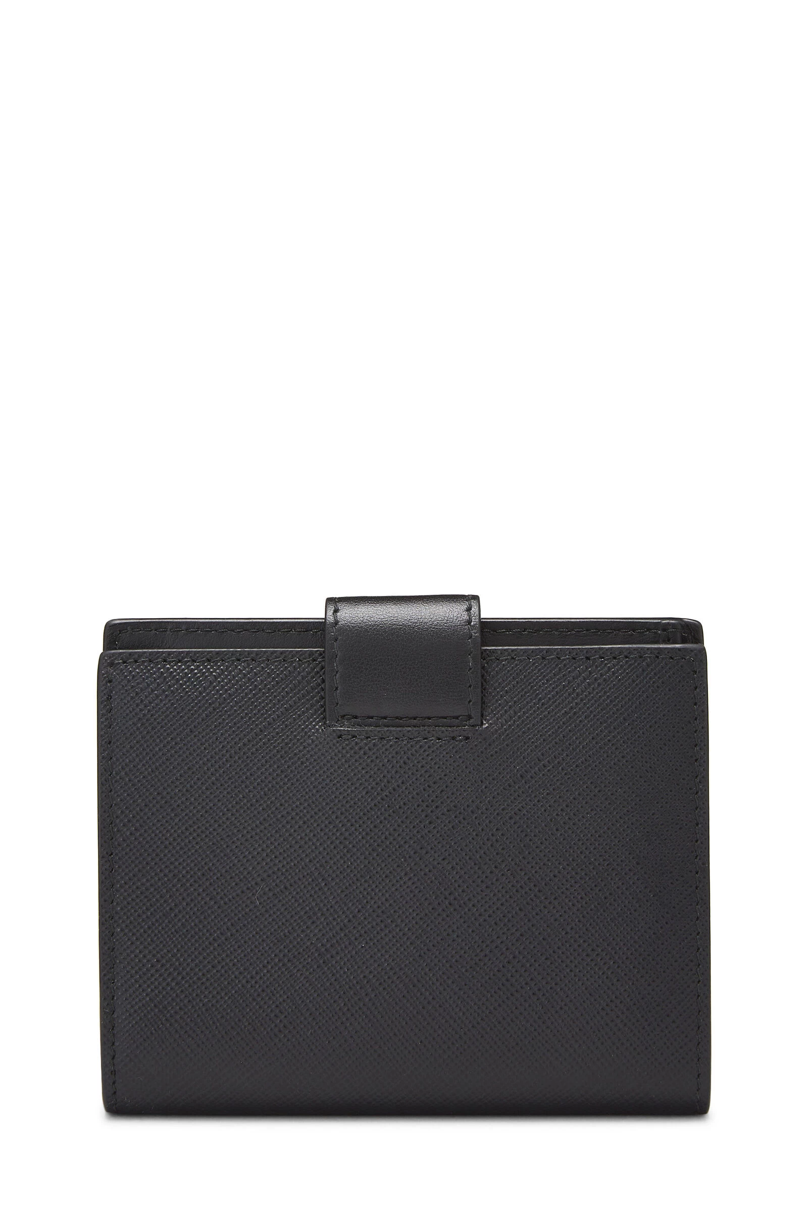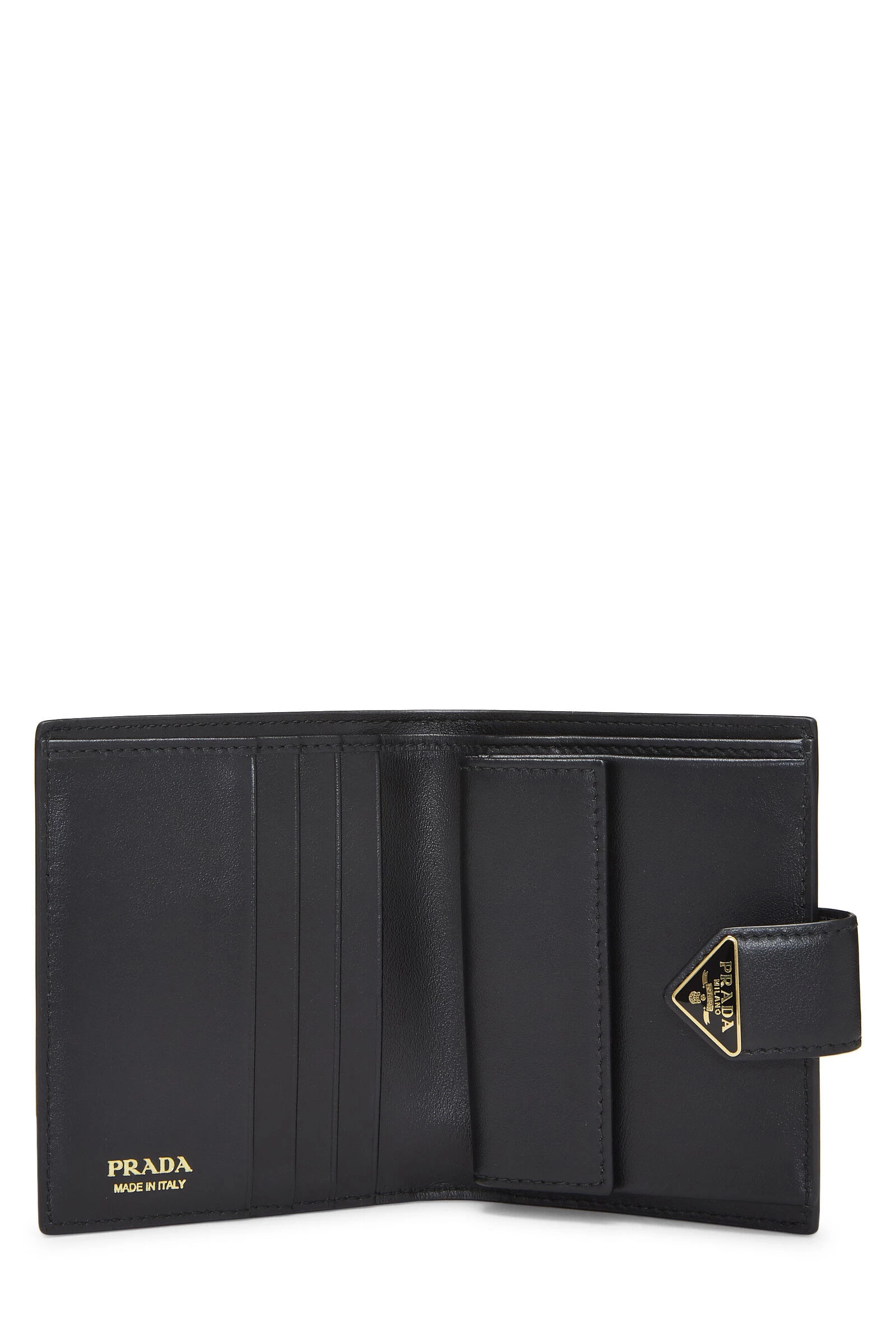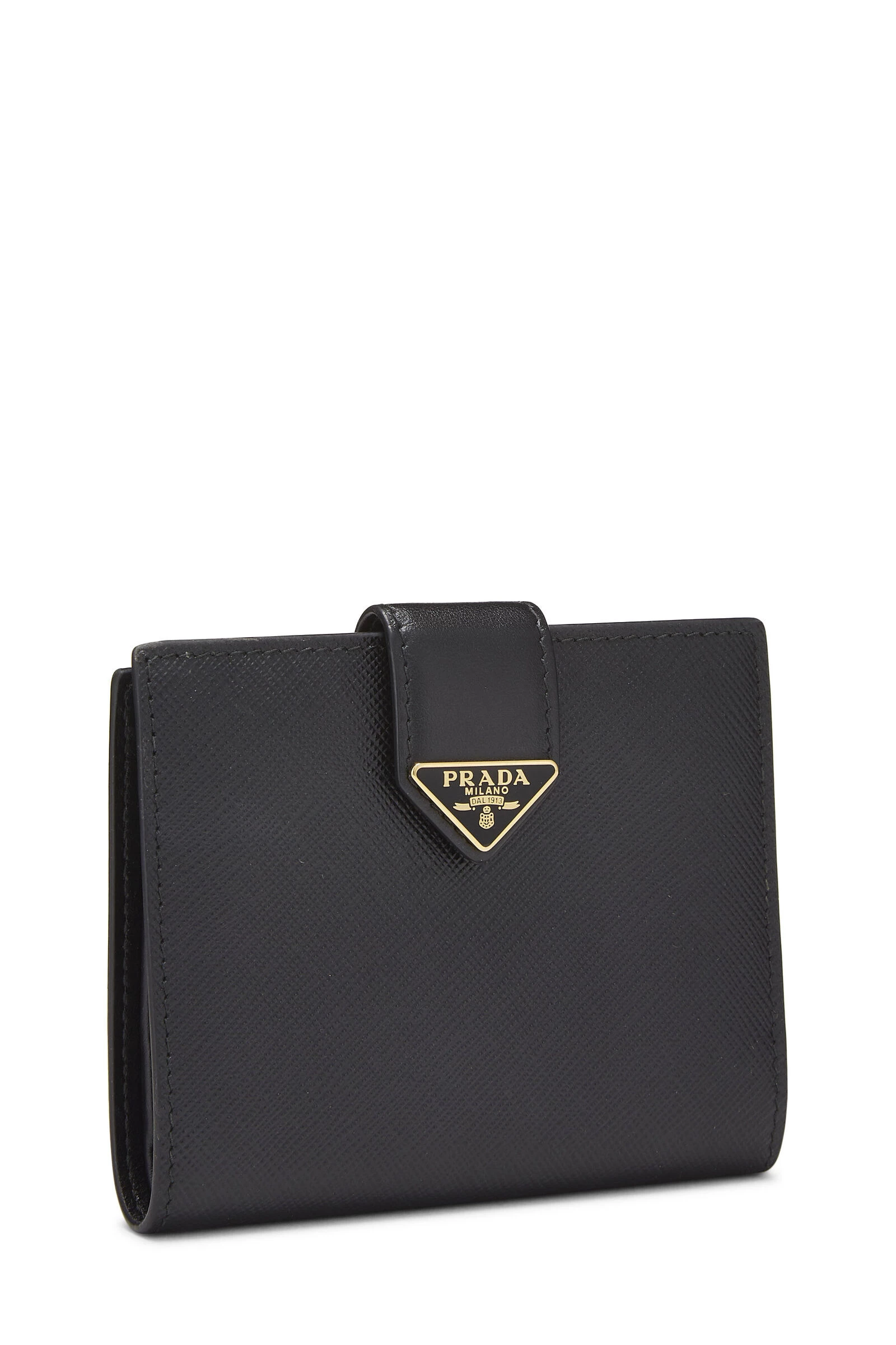 Compact Prada snap wallet crafted in black Saffiano leather, featuring tonal black leather lining and finished with gold-tone logo hardware at the front. Saffiano leather is a type of calfskin leather that has a cross-hatched embossed grain mixed with wax to create a satin finish, and is built for water resistance.