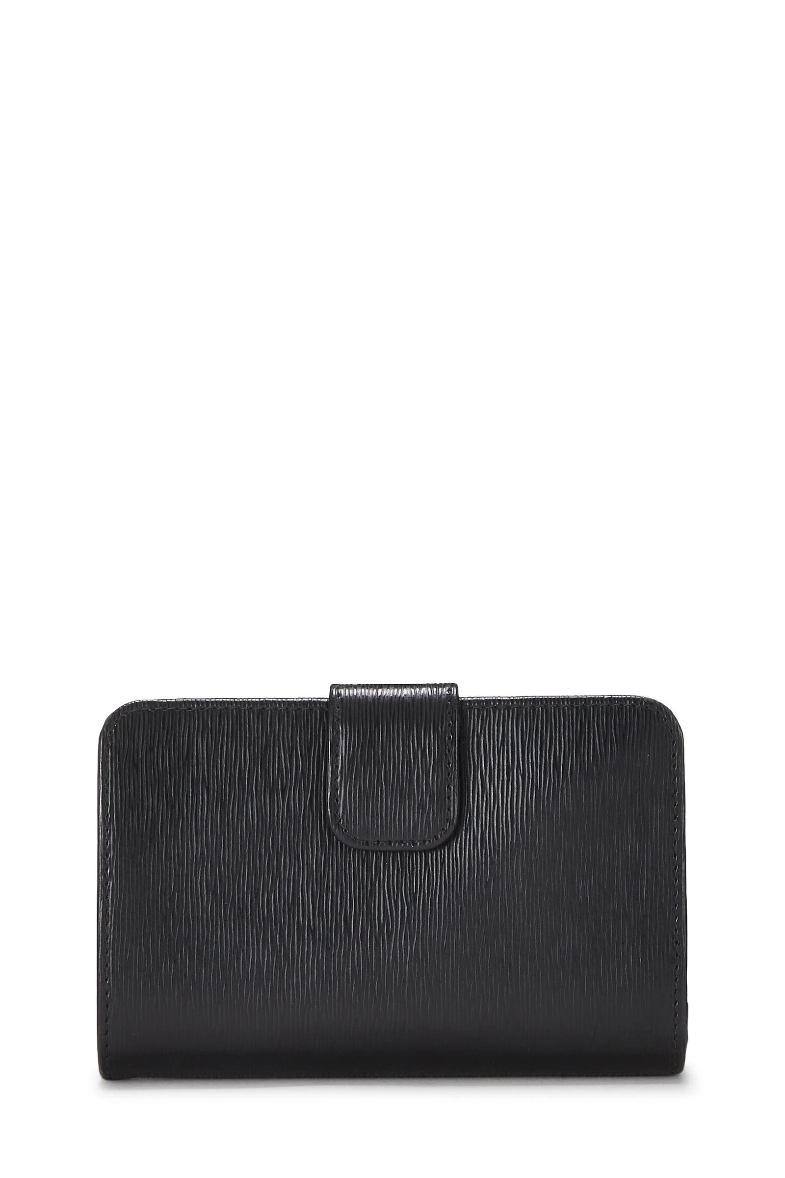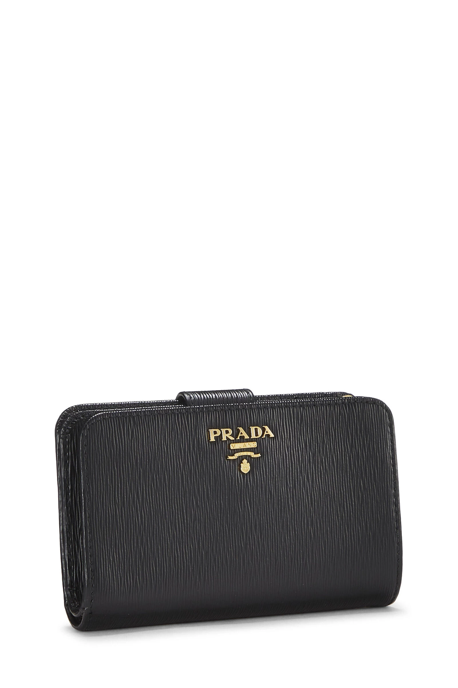 Striking Prada compact wallet rendered in the house’s iconic Vitello Move grained leather, featuring gold-tone hardware and an exterior zipper compartment.