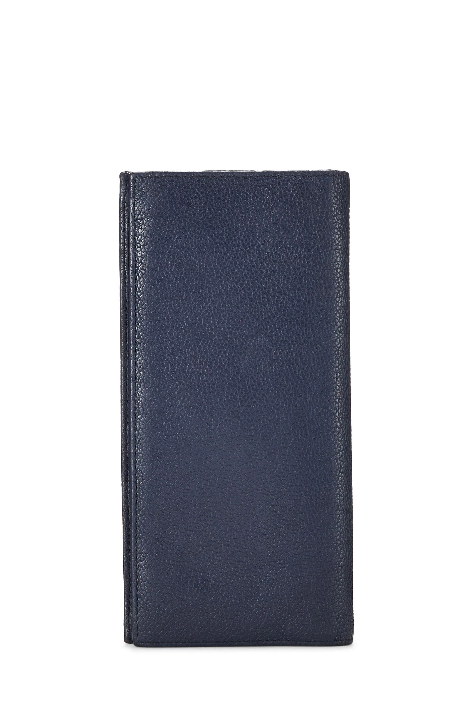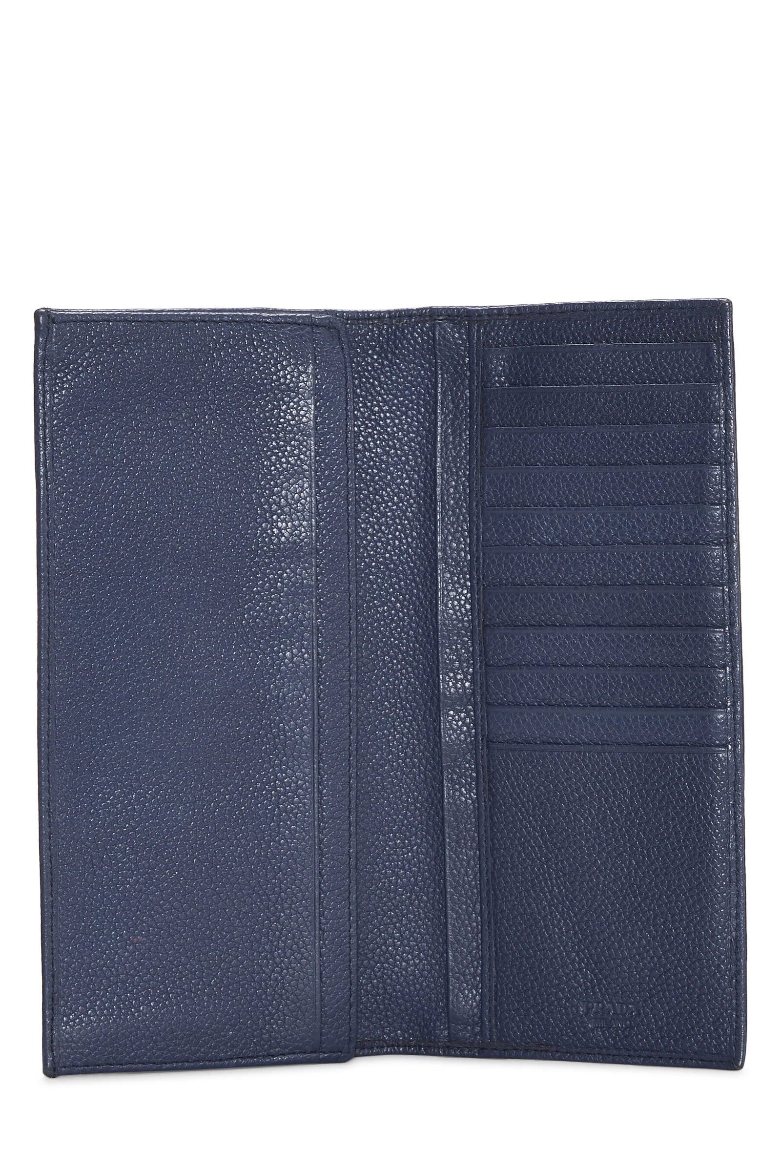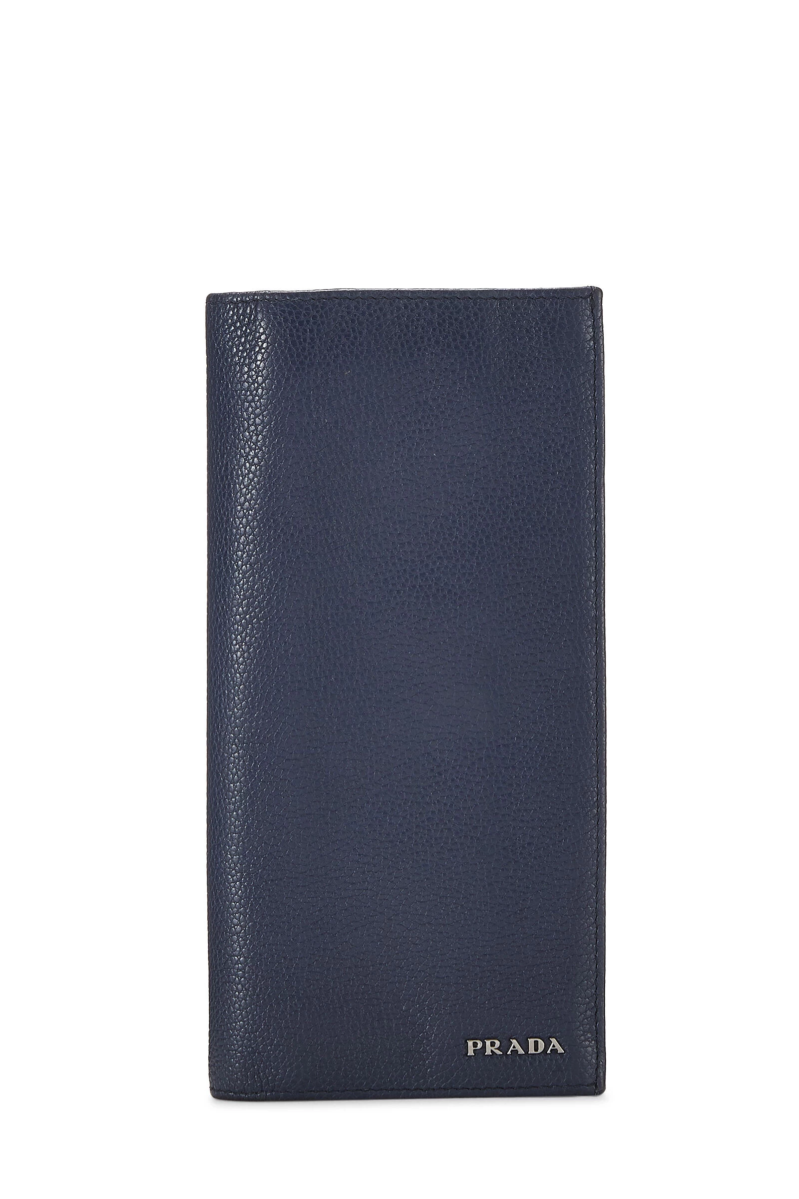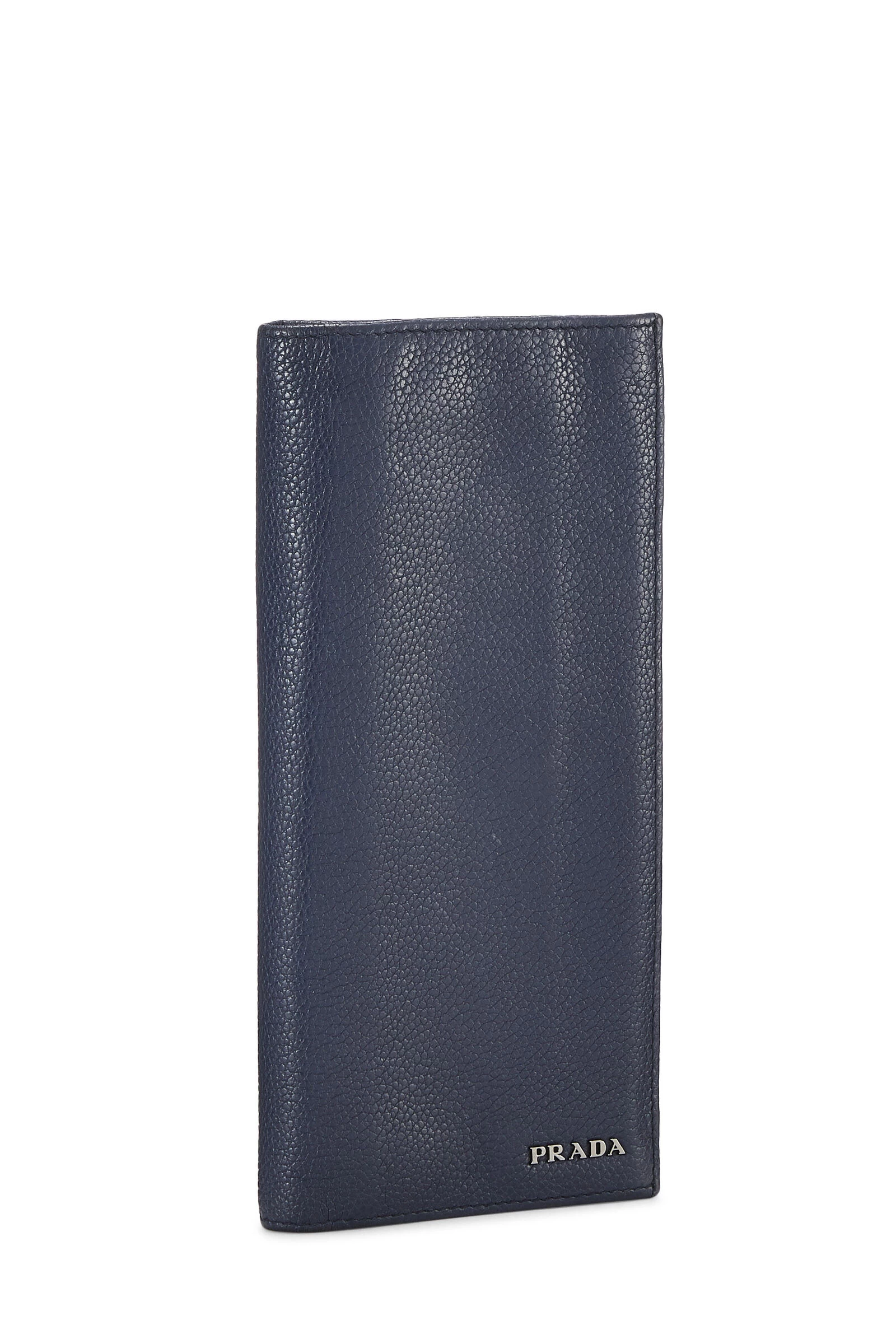 Classic checkbook style bi-fold wallet rendered in Prada’s signature Vitello Daino grained leather, featuring multiple card slots and interior pockets.