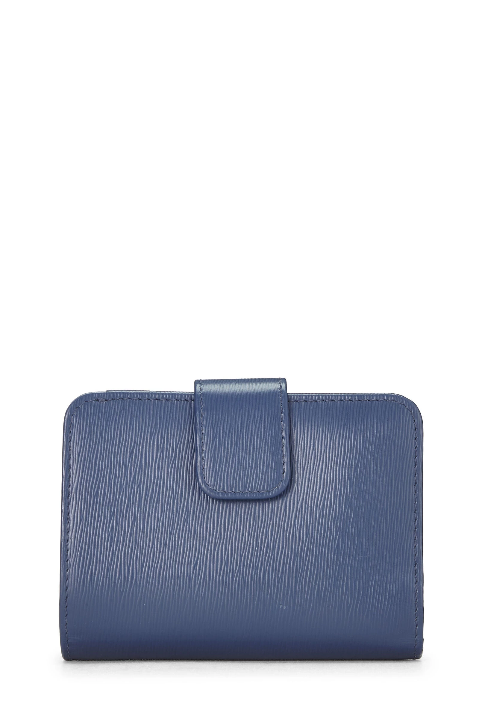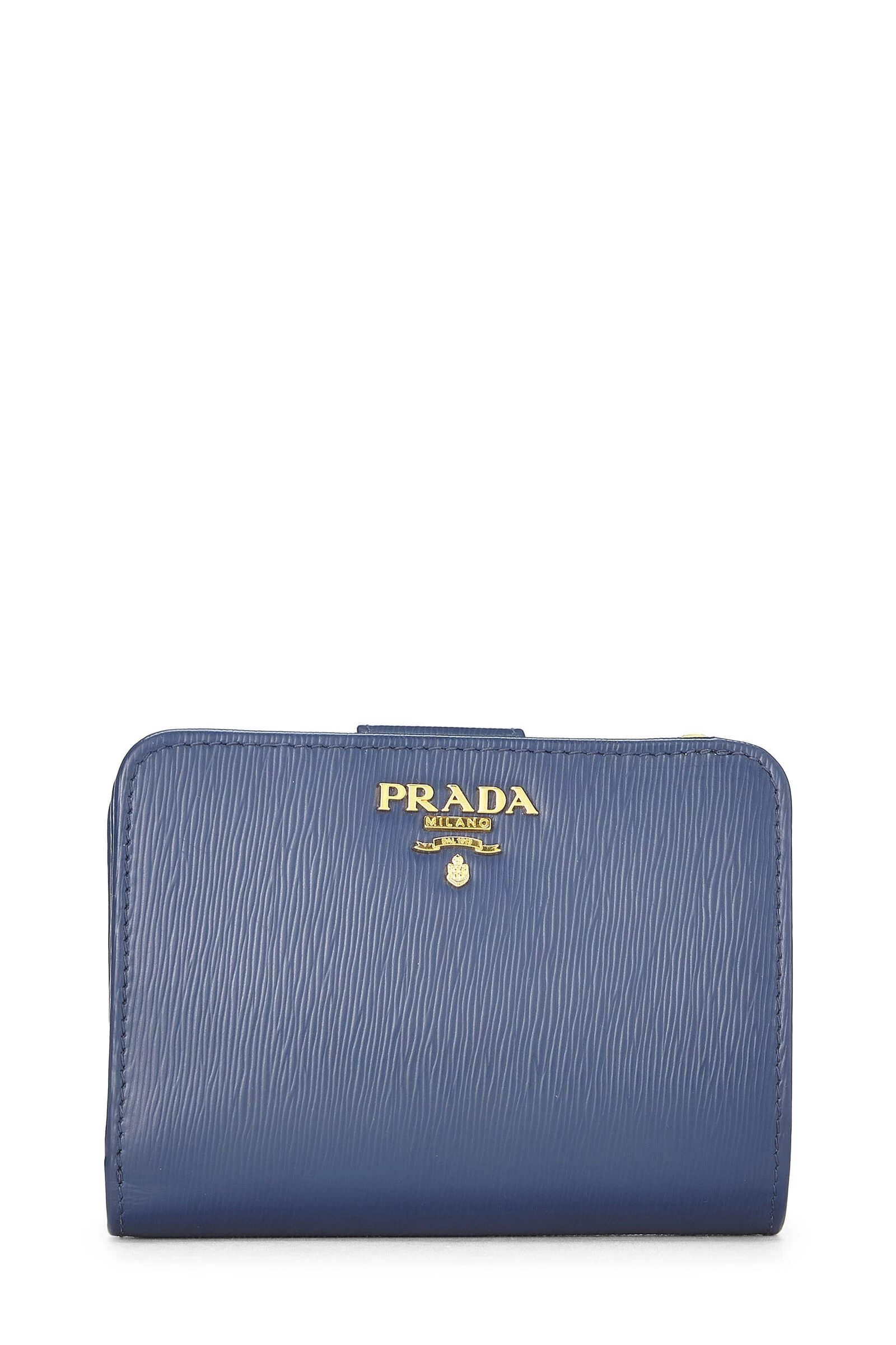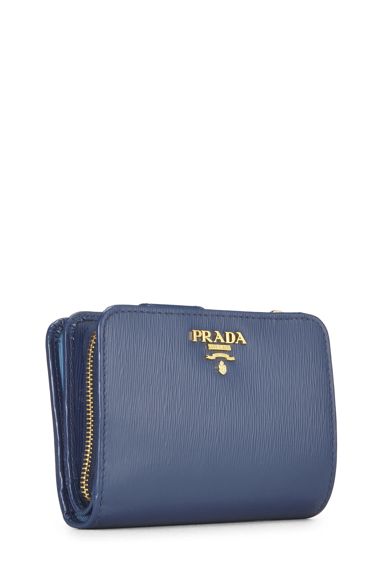 Compact Prada snap wallet crafted in blue Vitello Move leather, featuring contrast light blue lining and finished with gold-tone logo hardware at the front.