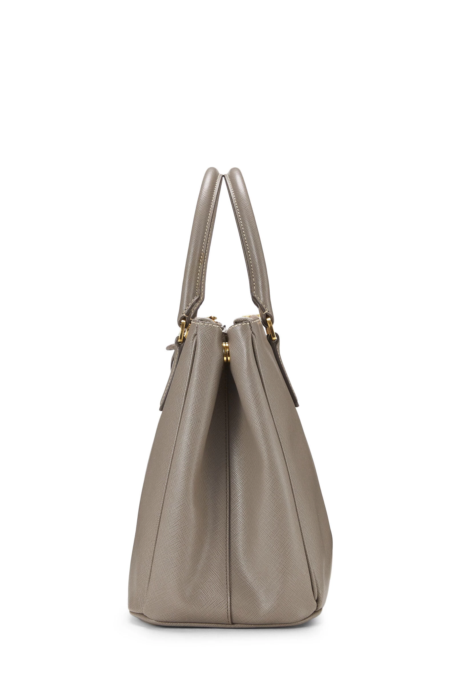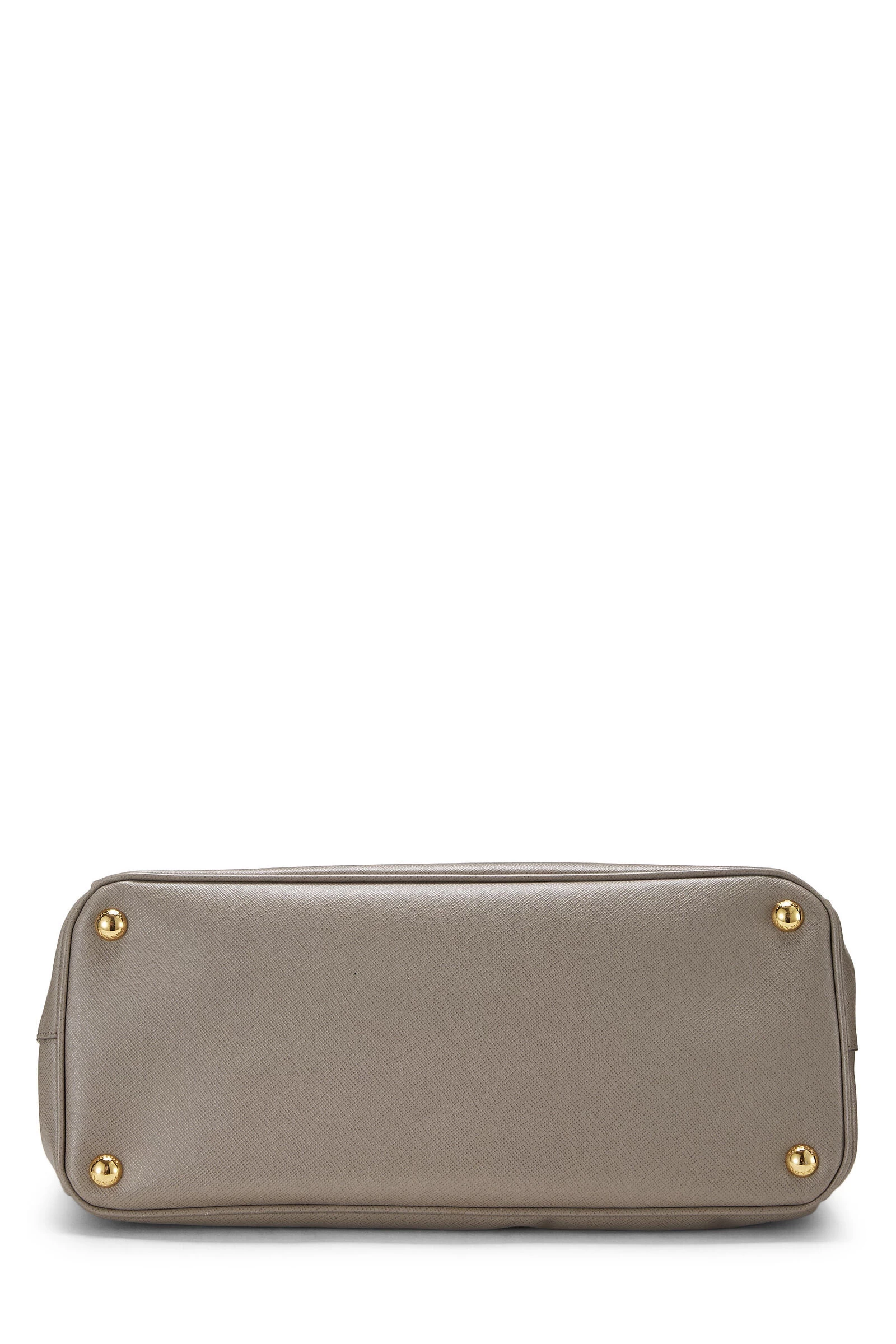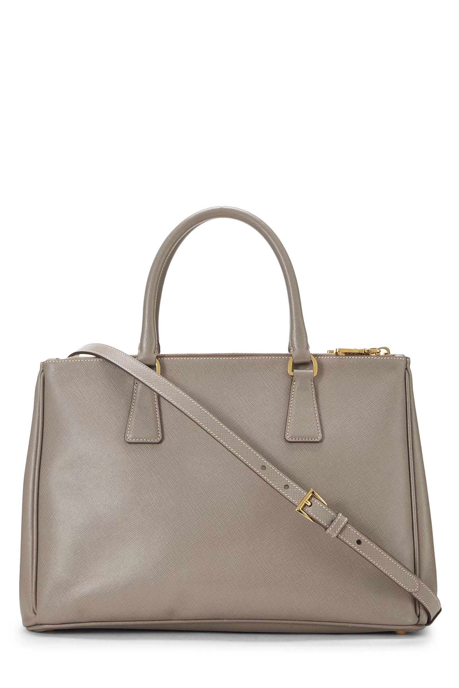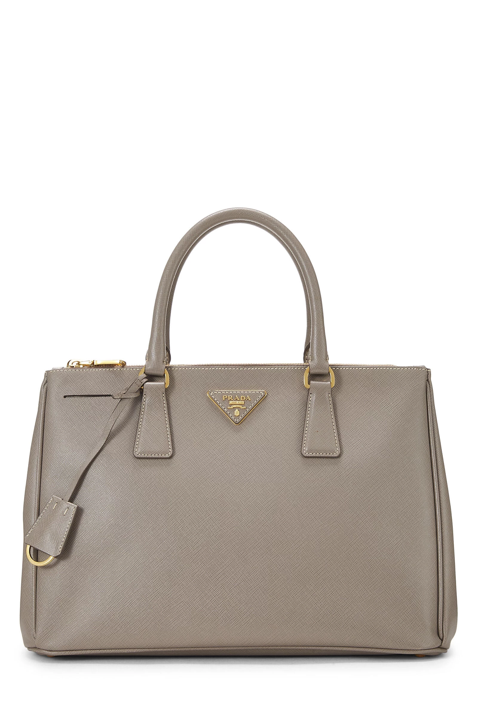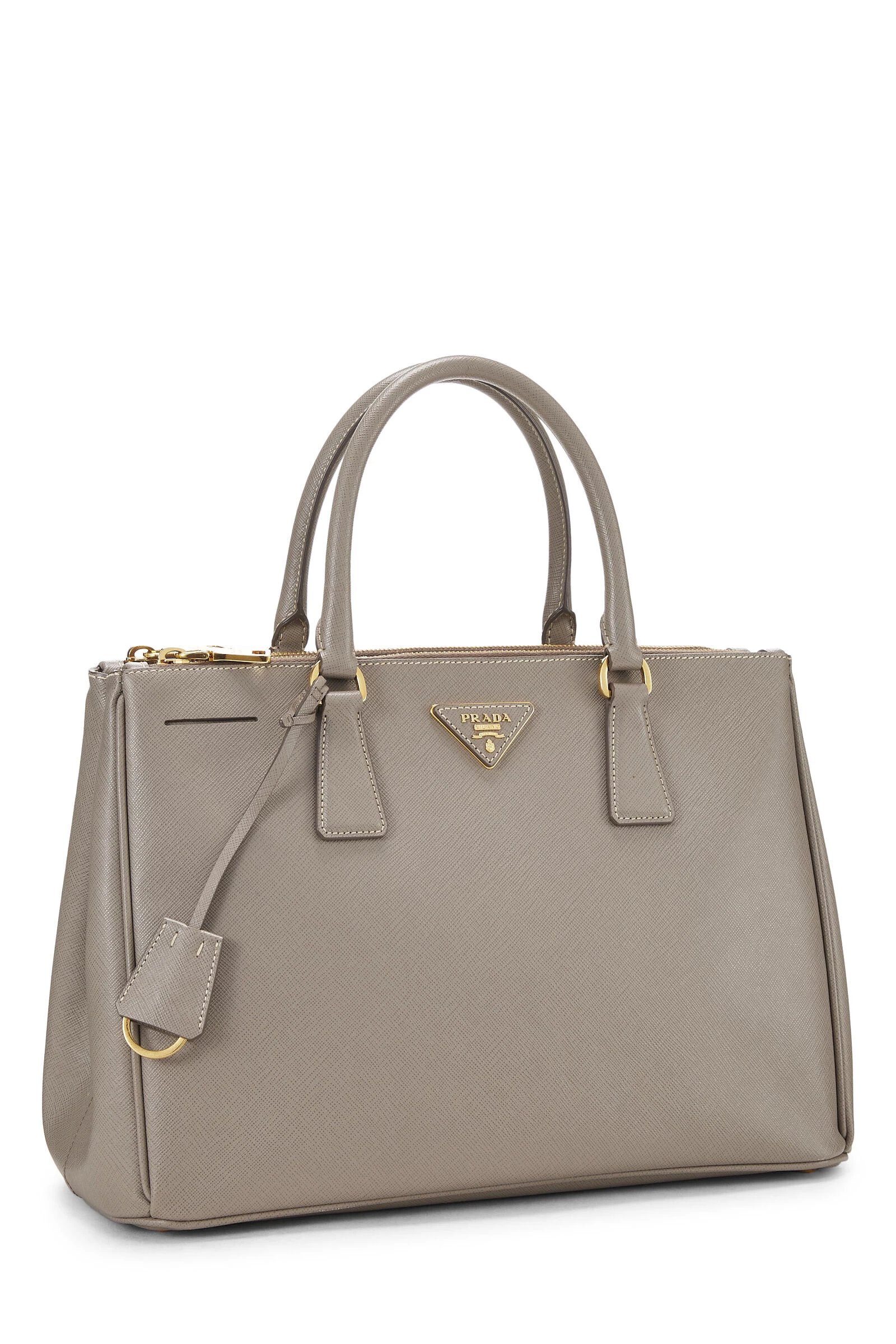 Structured and chic Prada Executive tote rendered in grey Saffiano leather, finished with gold-tone hardware and featuring an optional shoulder strap for versatile carry. Saffiano leather is Prada-exclusive calfskin leather that has a cross-hatched embossed grain mixed with wax to create a satin finish and is built for water resistance.