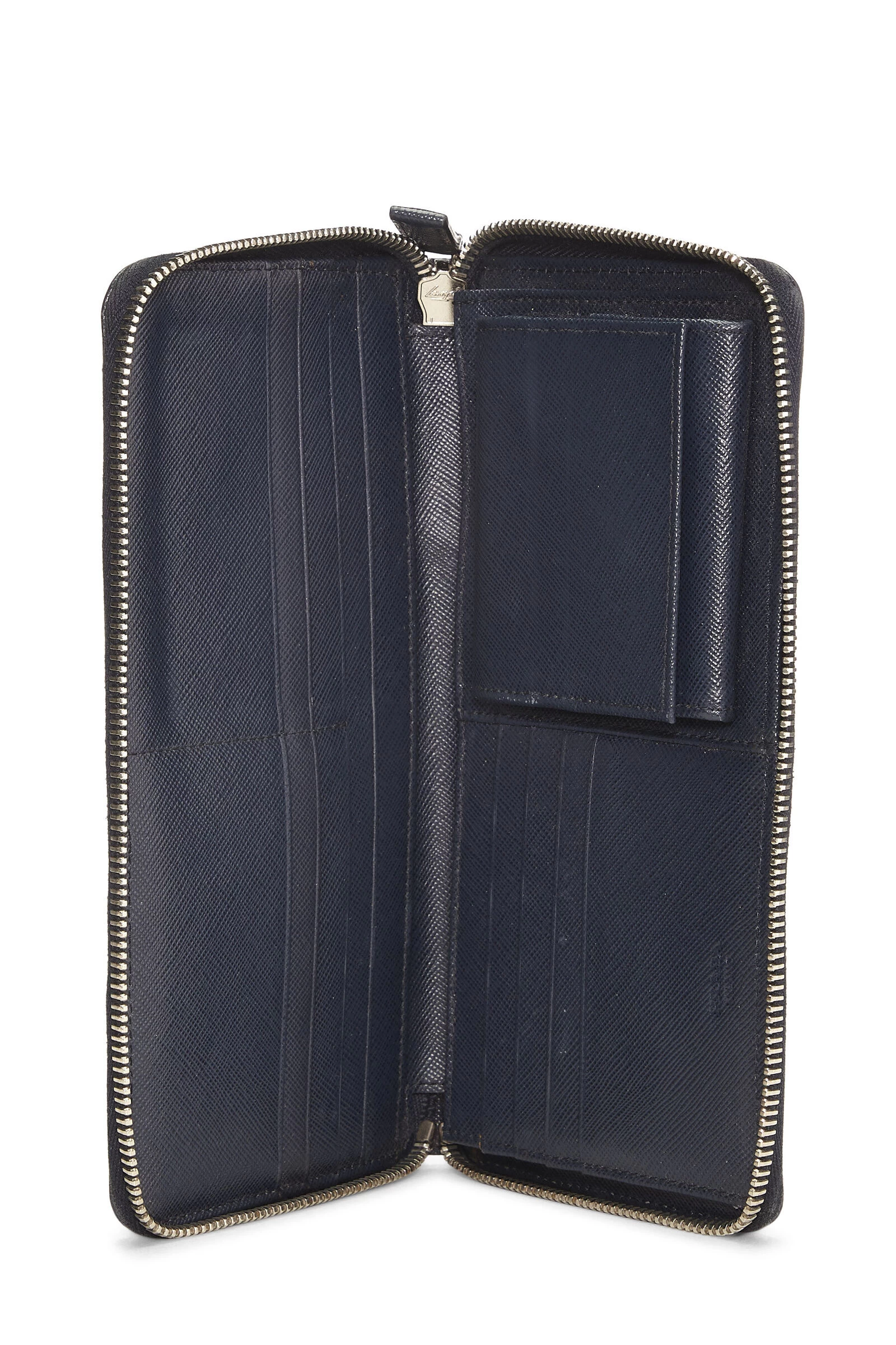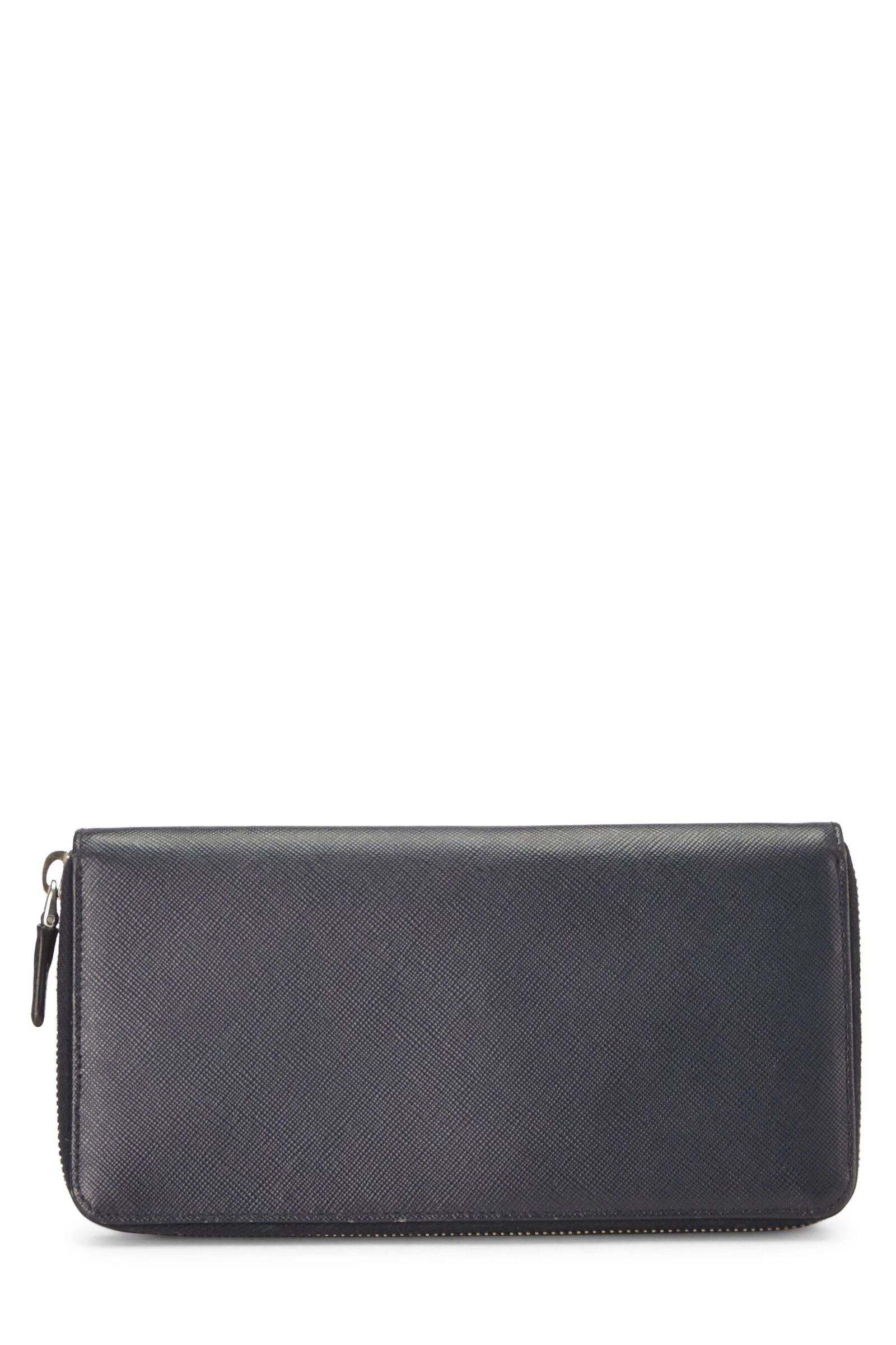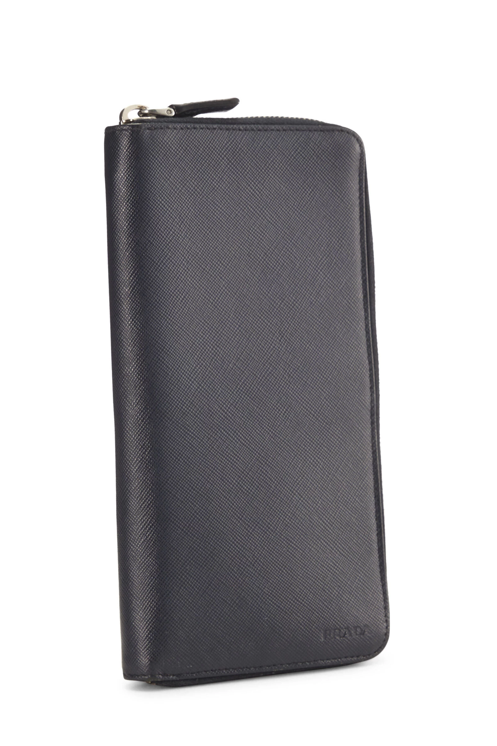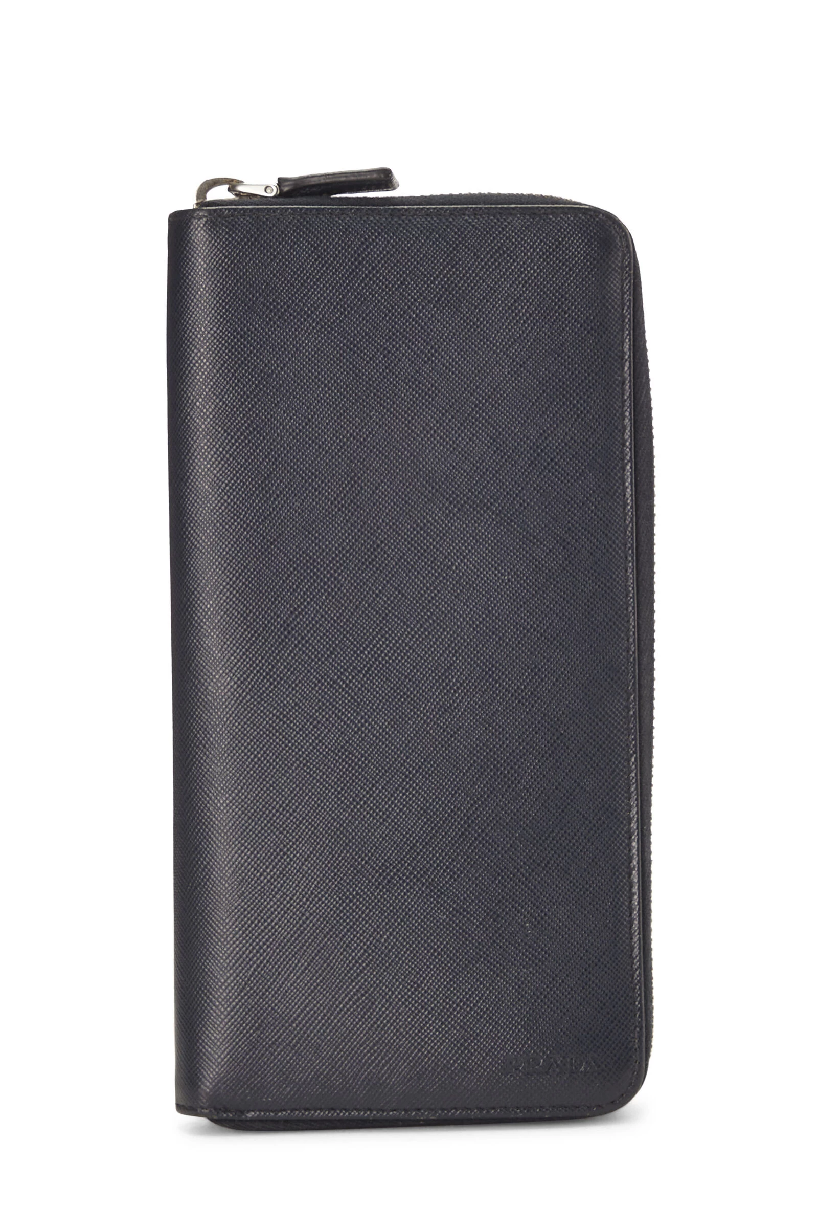 Classic Prada zip wallet crafted in the house’s signature Saffiano leather and finished with silver-tone hardware. Saffiano leather is a type of calfskin leather that has a cross-hatched embossed grain mixed with wax to create a satin finish, and is built for water resistance.