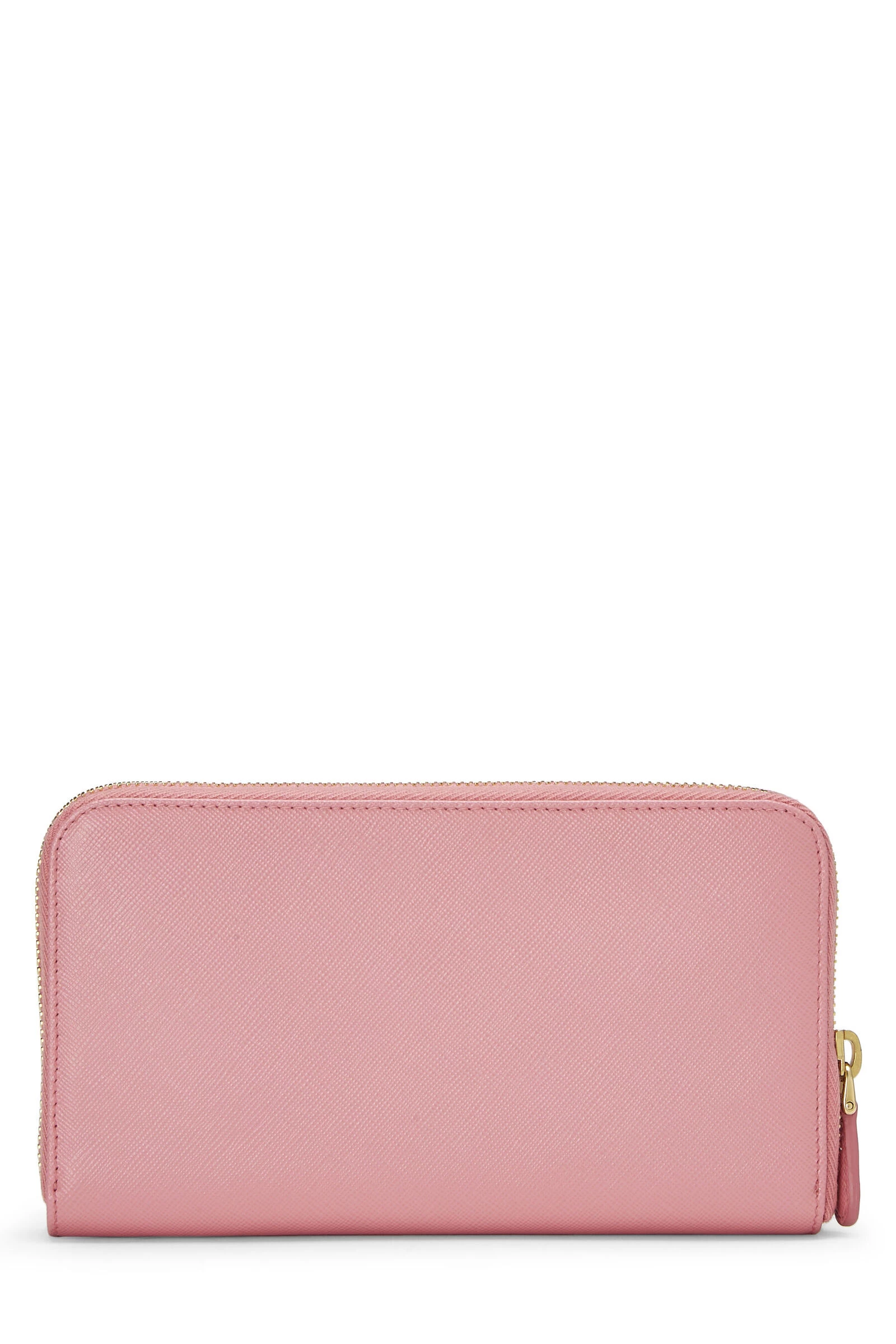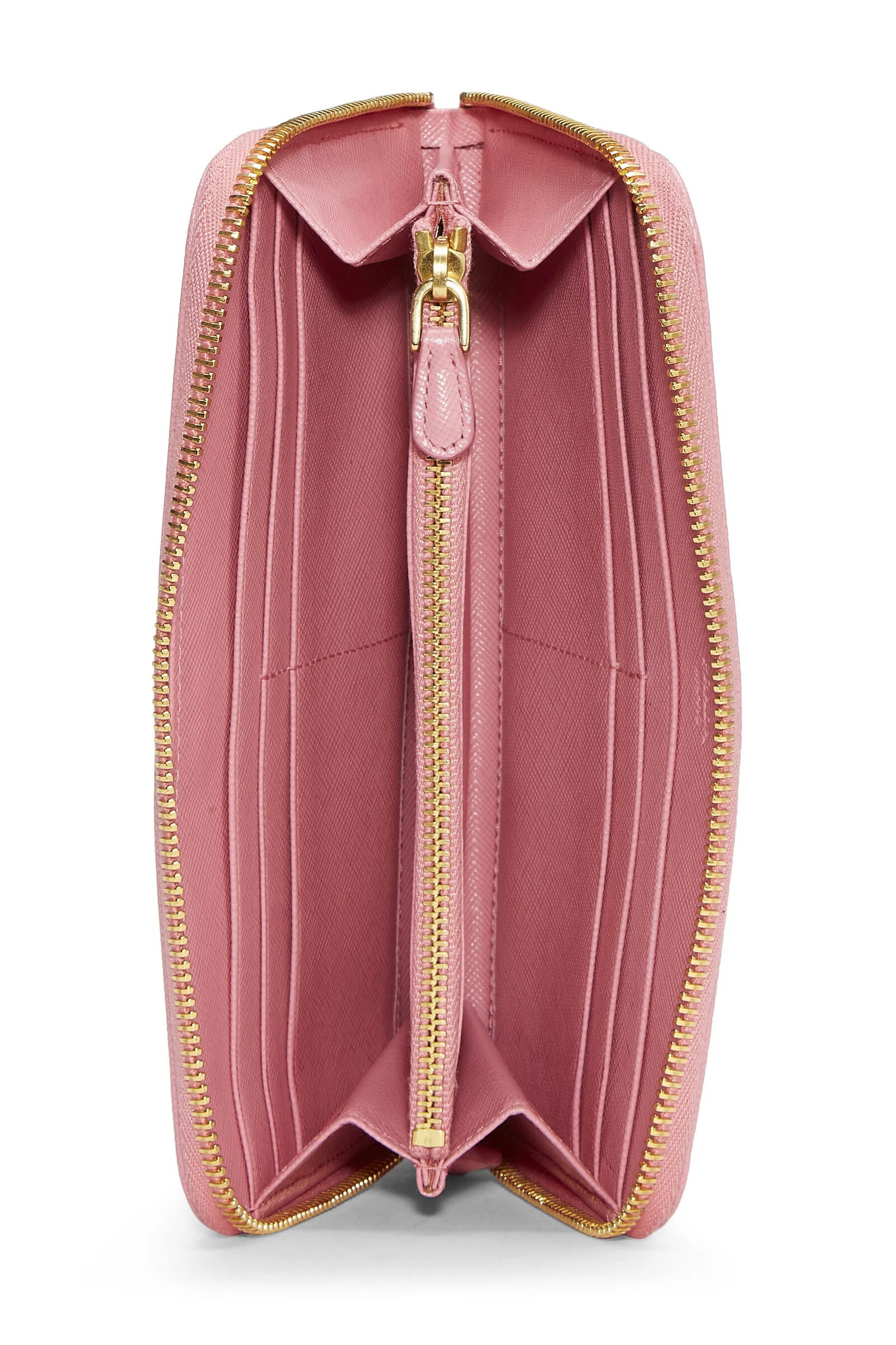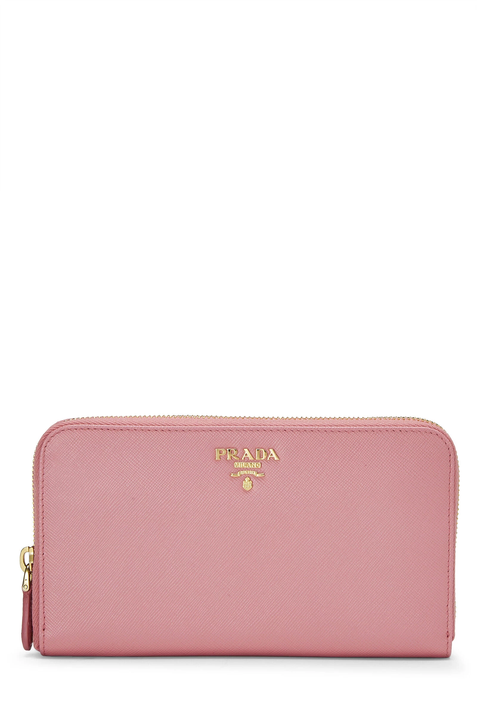 Ultra chic and perfect for everyday use, this Prada zip around wallet comes rendered in pink Saffiano leather, accented with gold-tone logo hardware, and finished with a highly compartmentalized interior that’s sure to fit all of your wallet essentials with ease.