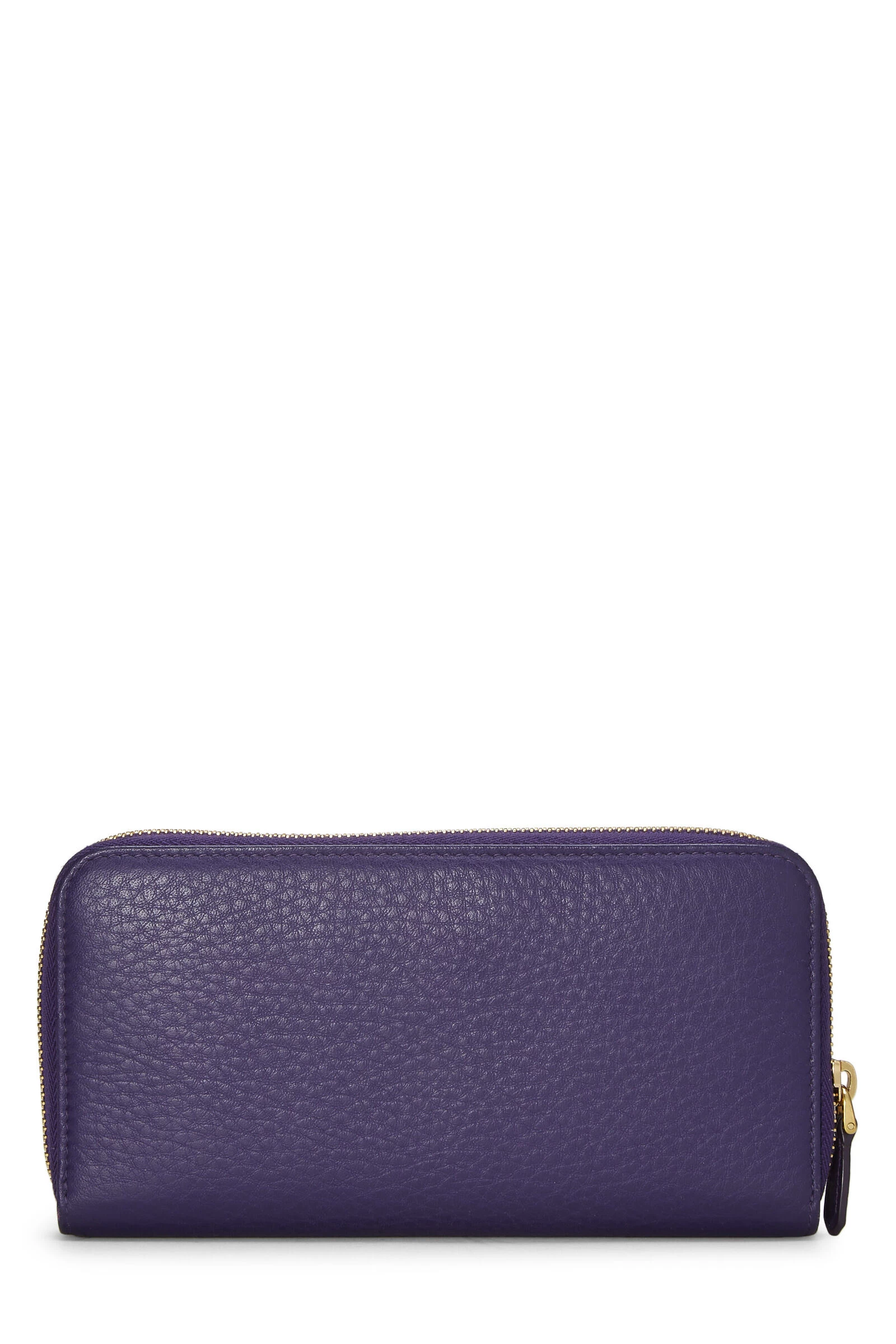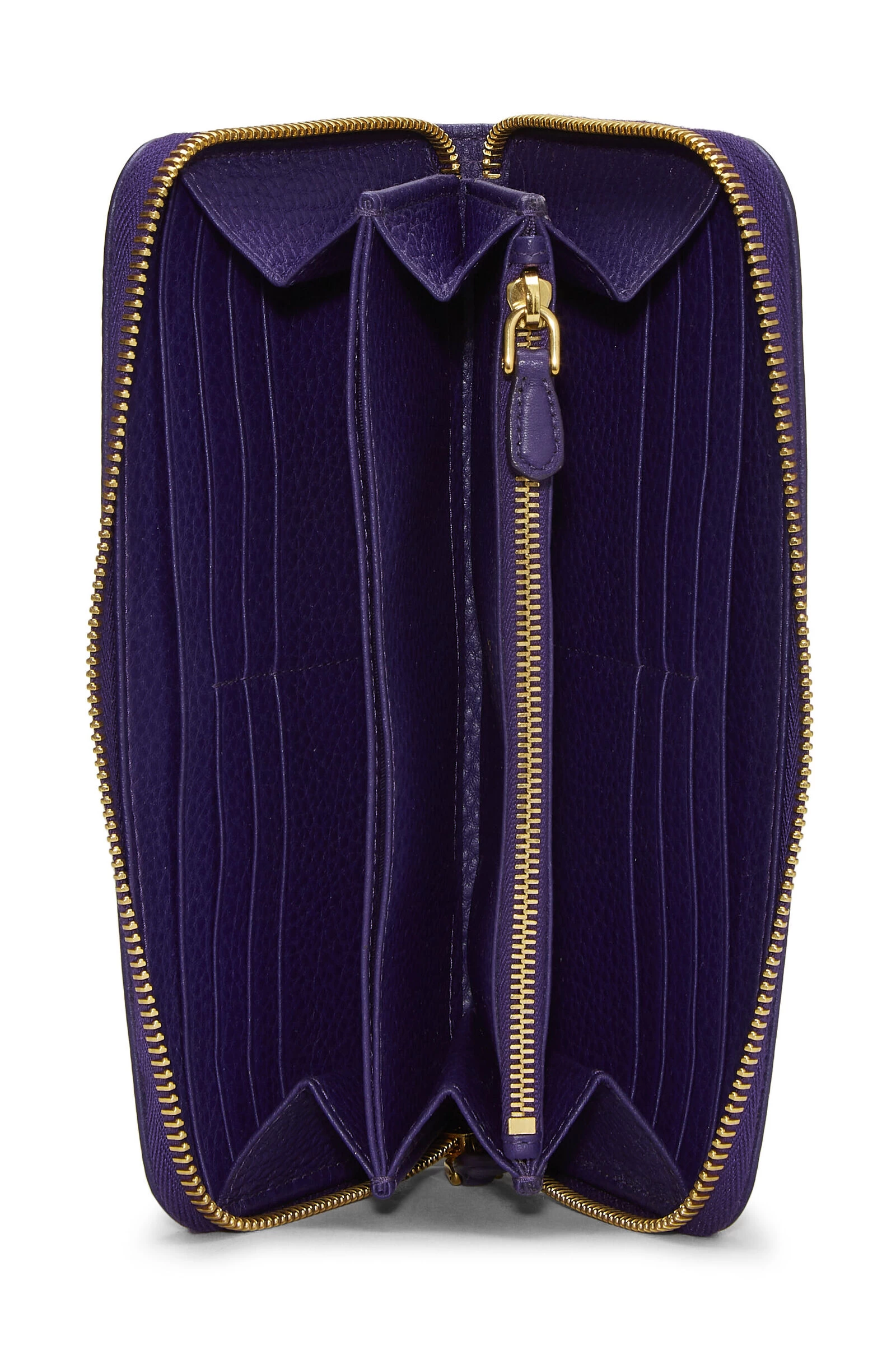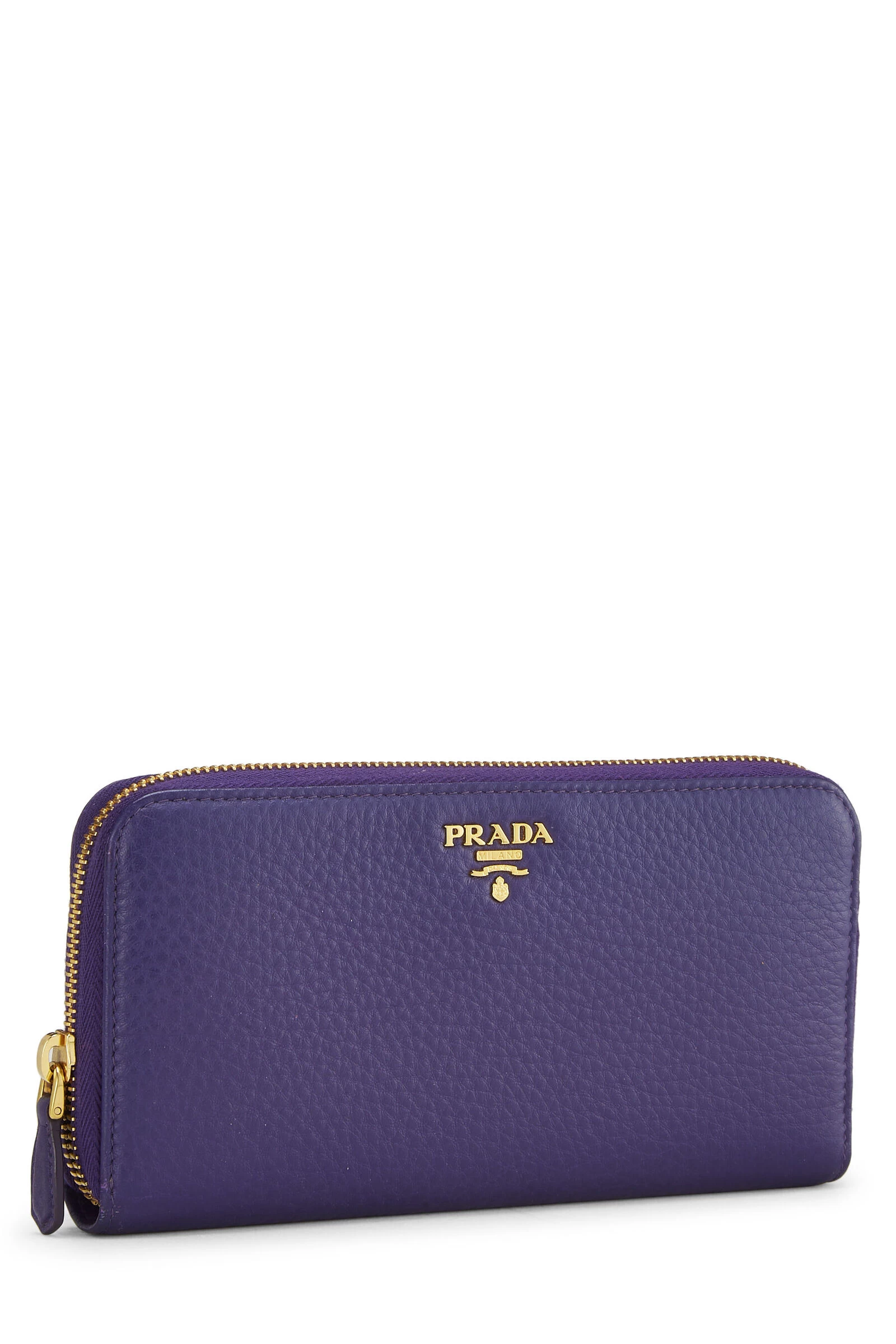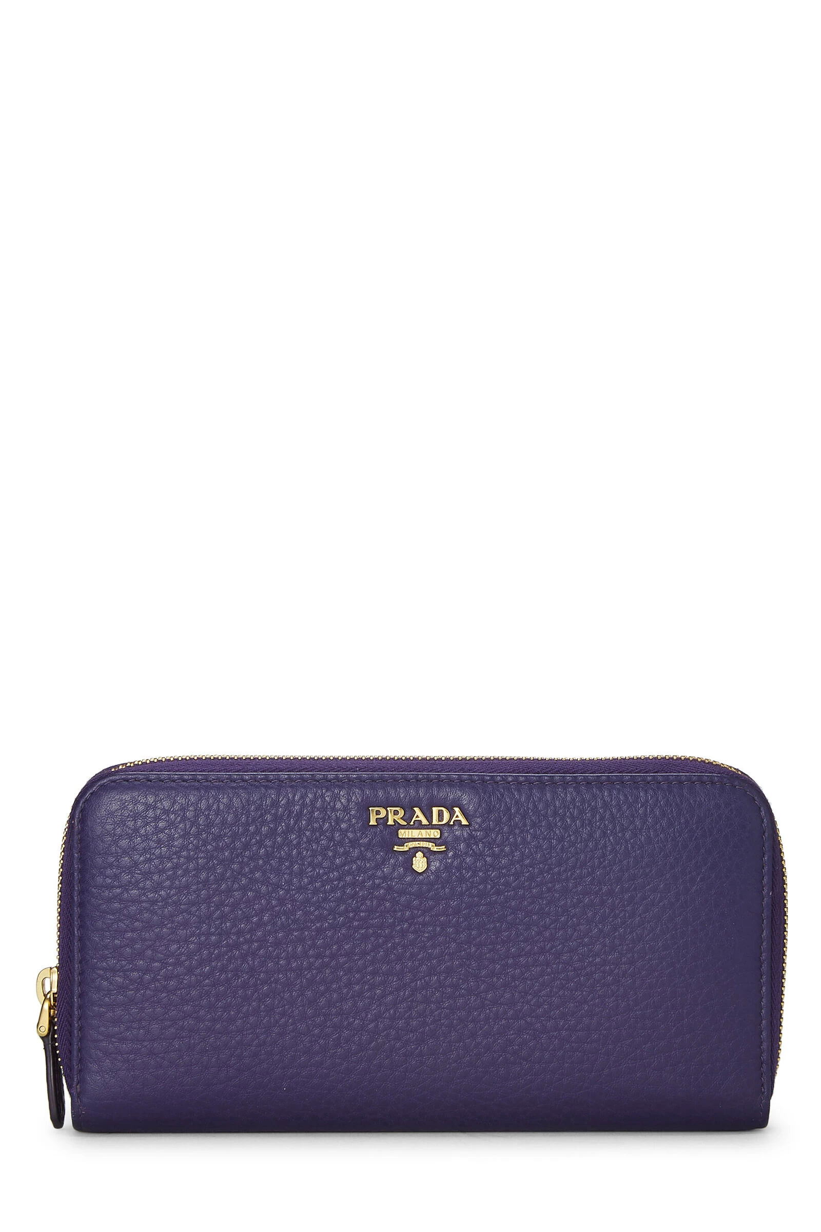 Classic zip around wallet rendered in Prada’s signature Vitello Daino grained leather, featuring multiple card slots and pockets for optimal storage.