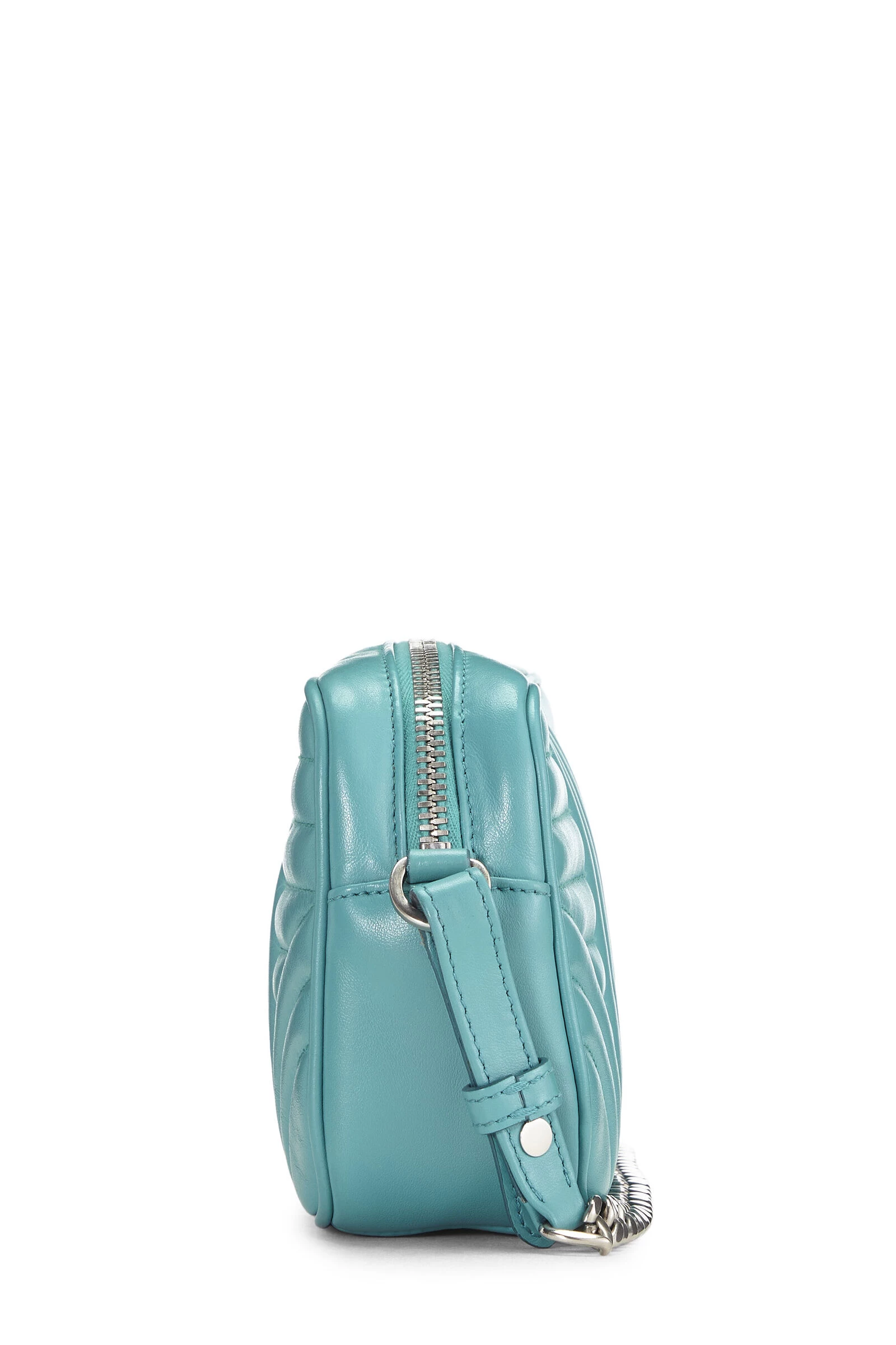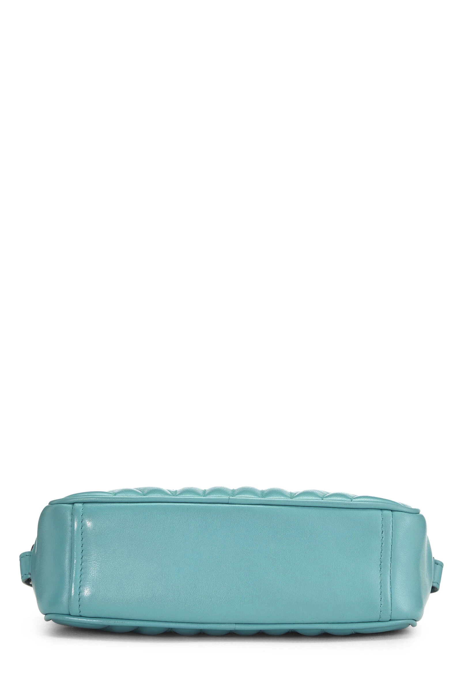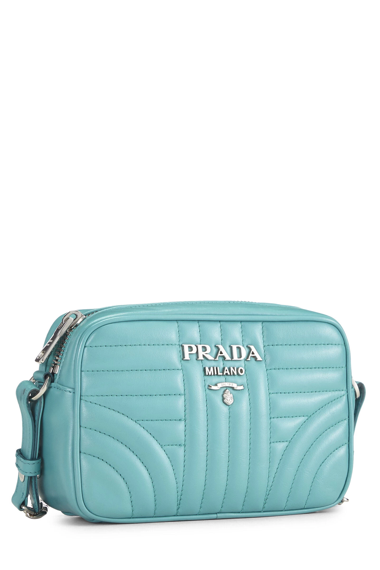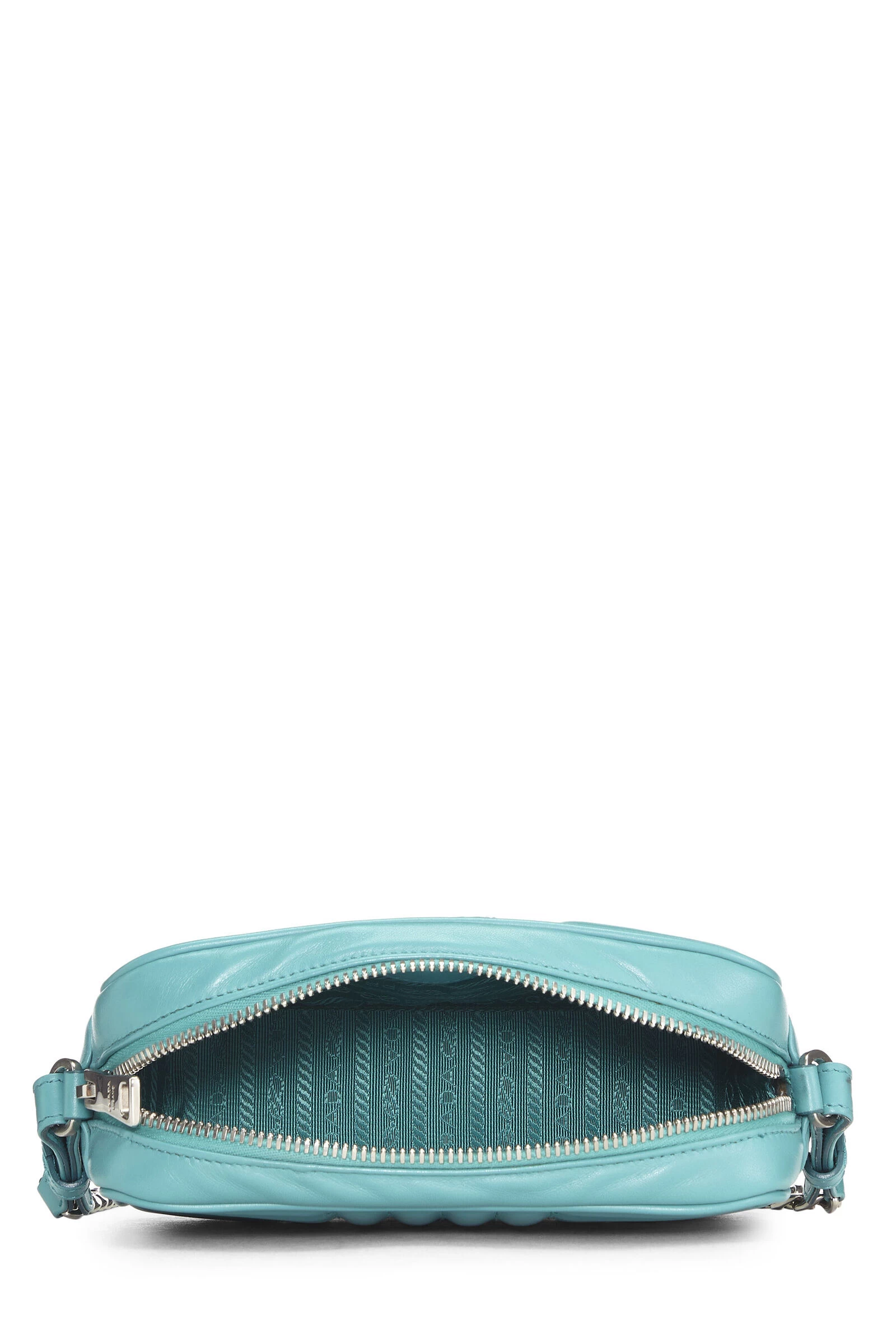 Chic Prada Diagramme Camera bag crafted in turquoise calfskin, featuring stylistic quilting, accented with silver-tone logo hardware and finished with chain-link.