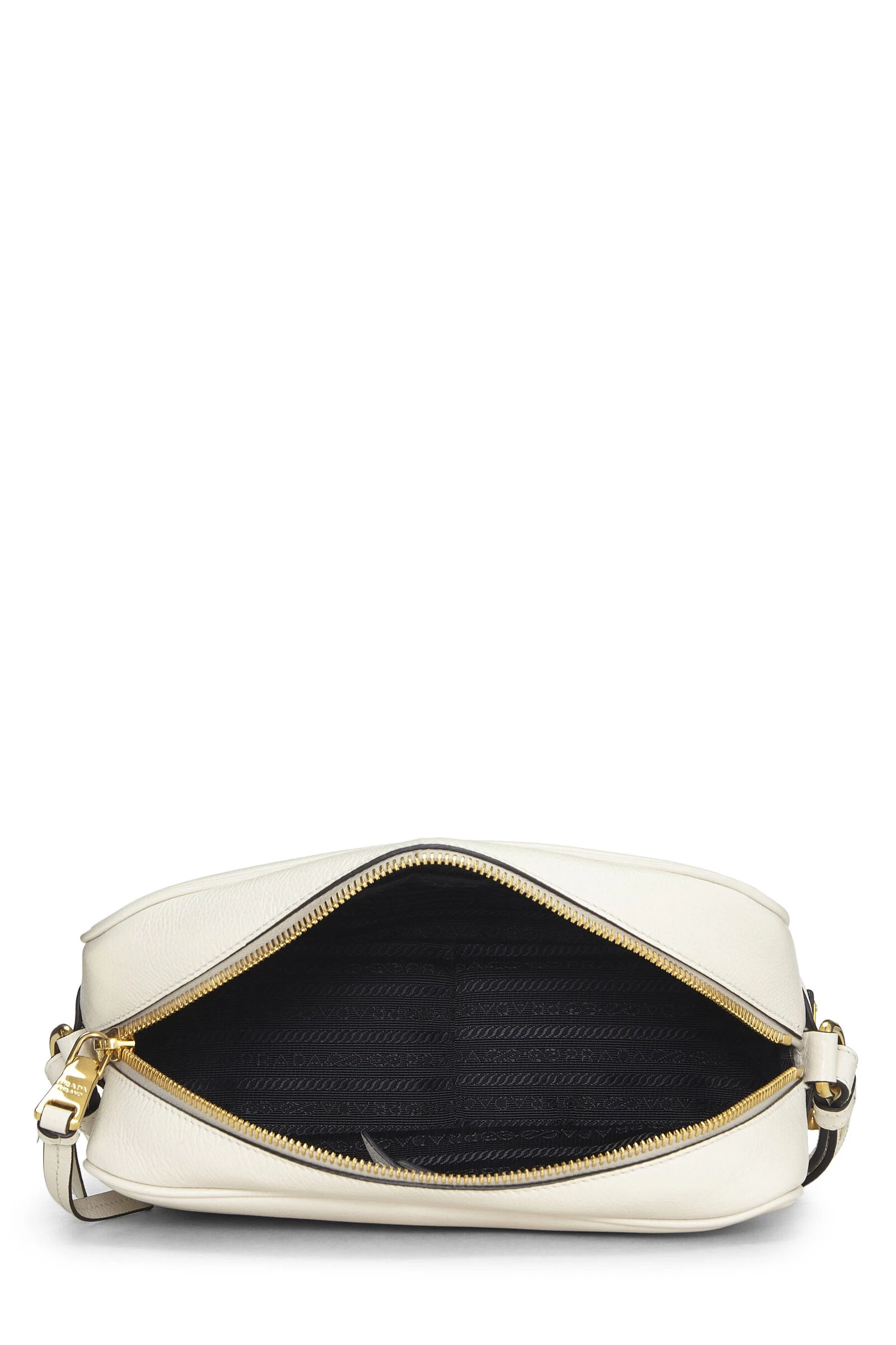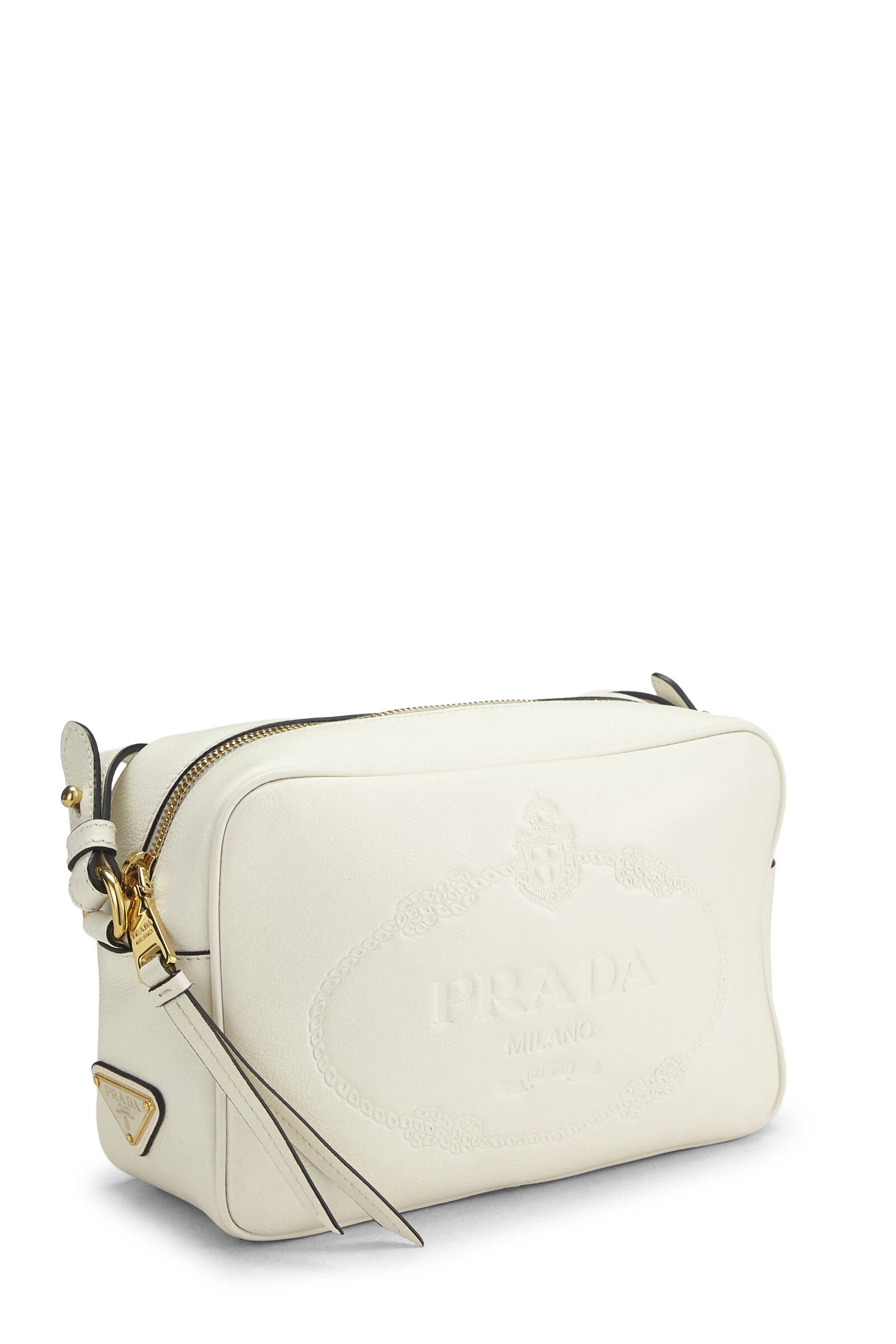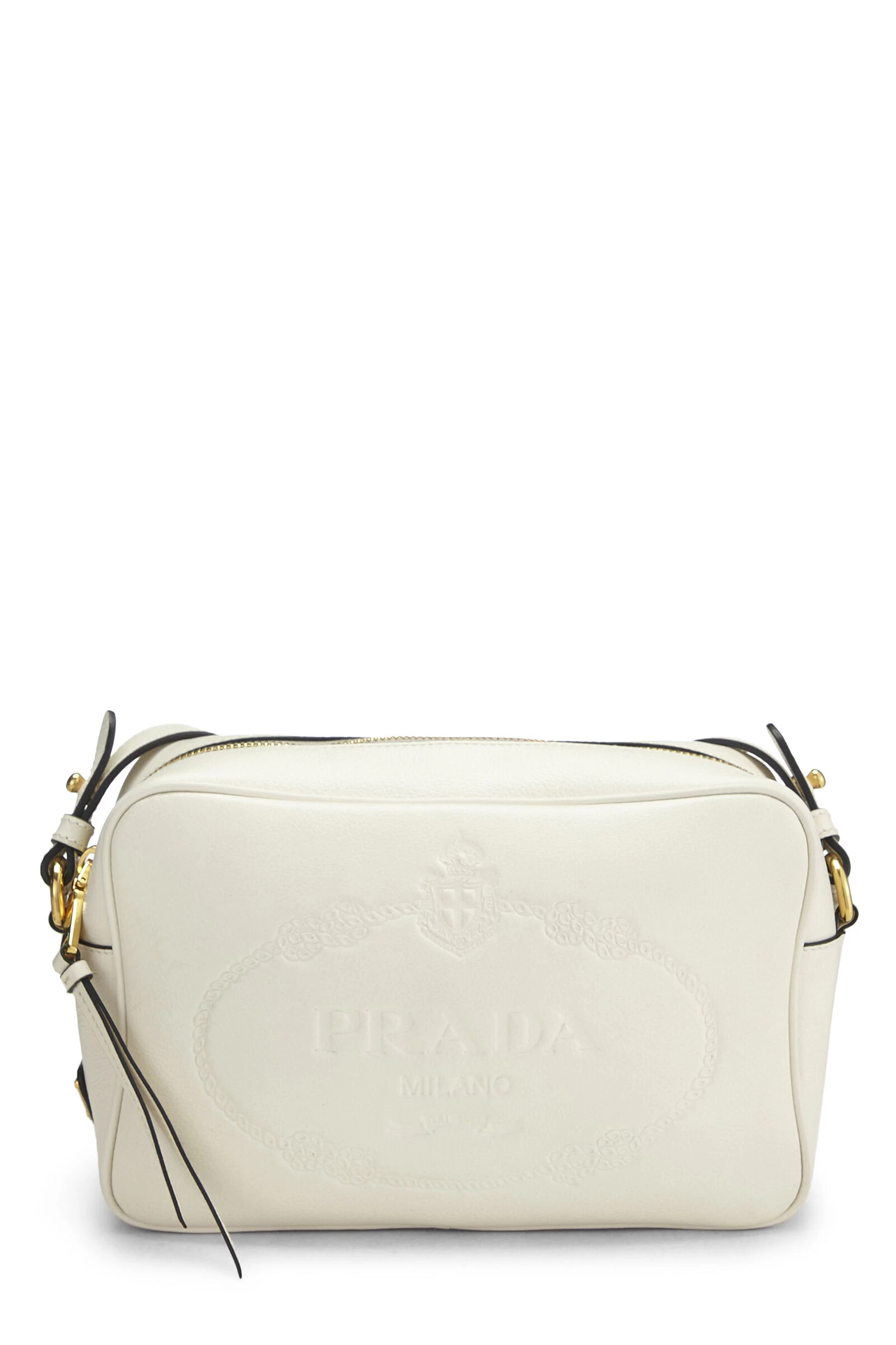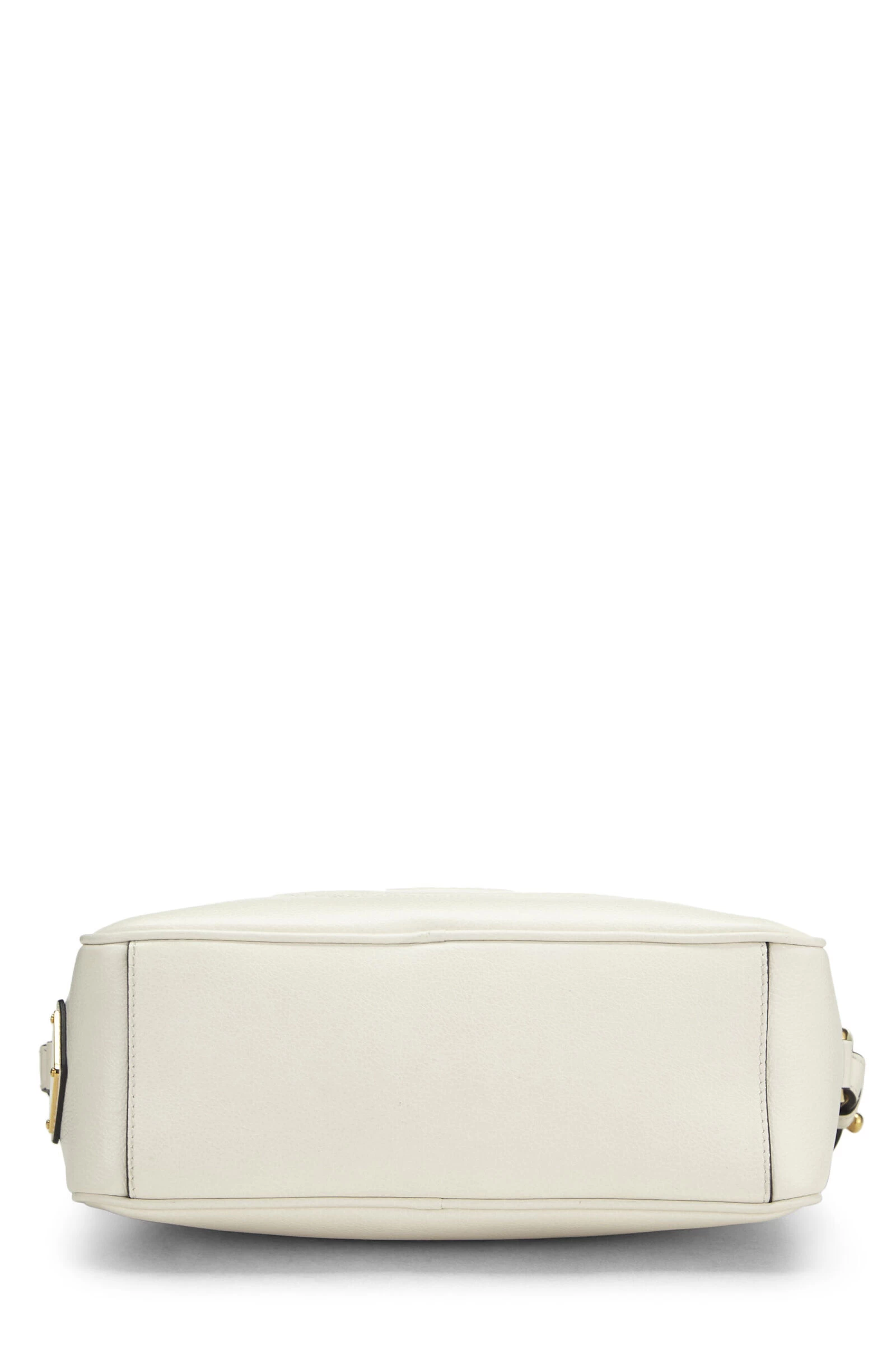 Classic Camera bag rendered in white calfskin with logo debossing to front exterior and finished with gold-tone hardware and tassel attachment.