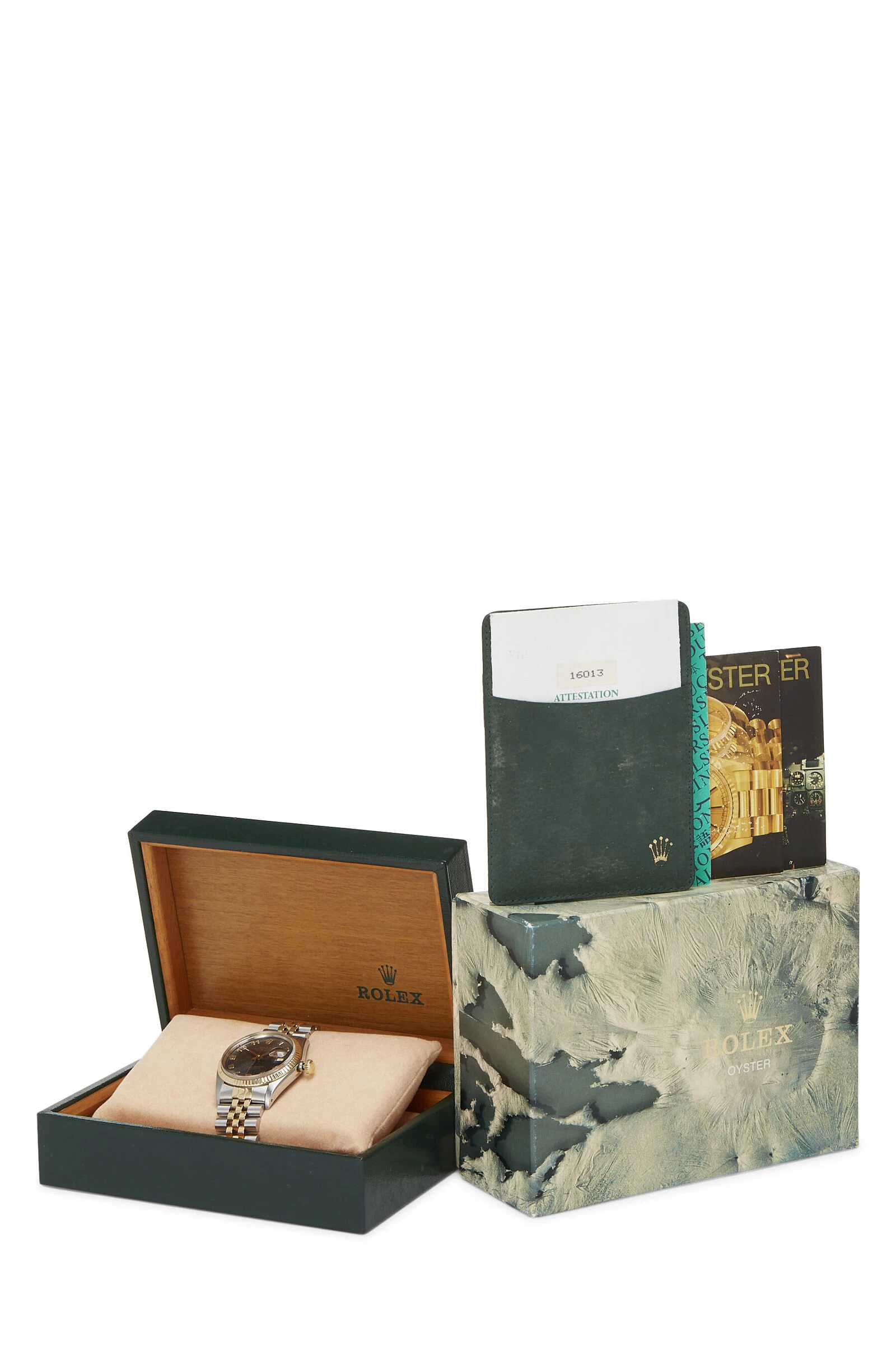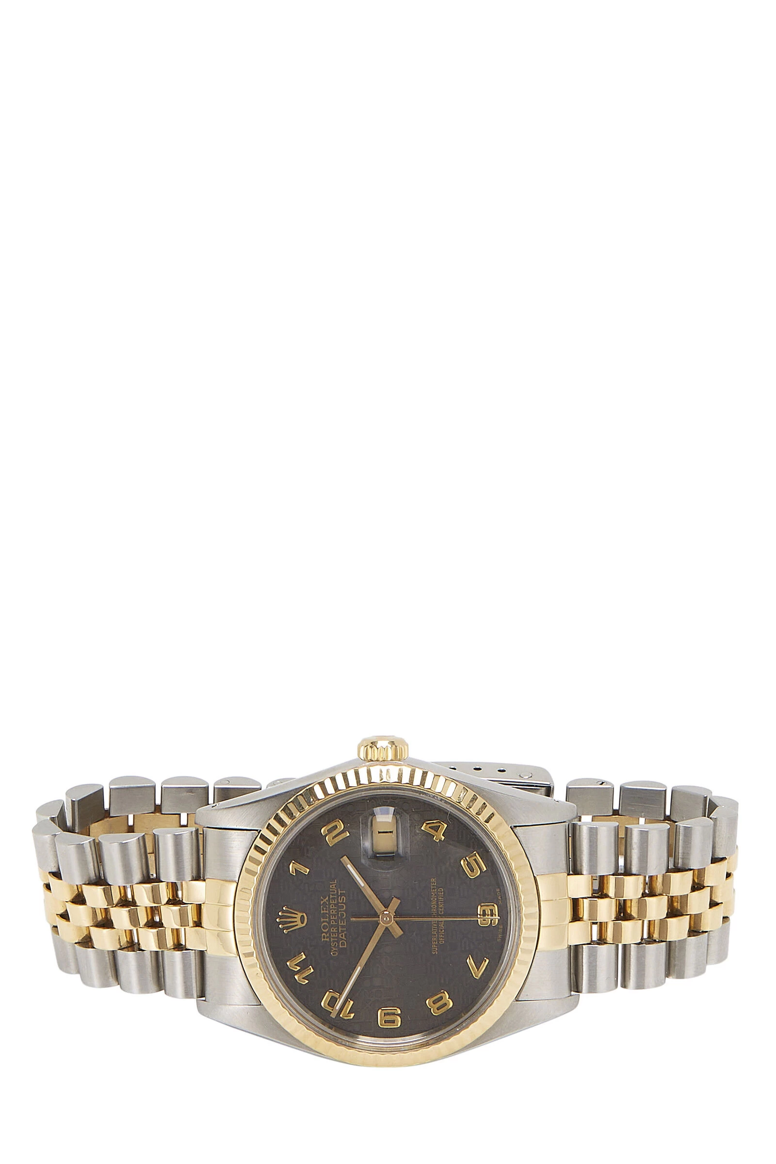 With impeccable craftsmanship and classic aesthetics, the Rolex Datejust watch is a timeless investment. First debuted in 1945, this version of the Datejust watch features automatic movement, a 36mm Oyster case with an 18k yellow gold fluted bezel, a grey dial with Arabic hour markers, scratch-resistant genuine sapphire crystal and a magnified Cyclops date window, finished with a stainless steel & 18k yellow gold Jubilee bracelet and Oyster clasp. Includes papers and branded box. Serial number 957XXXX.