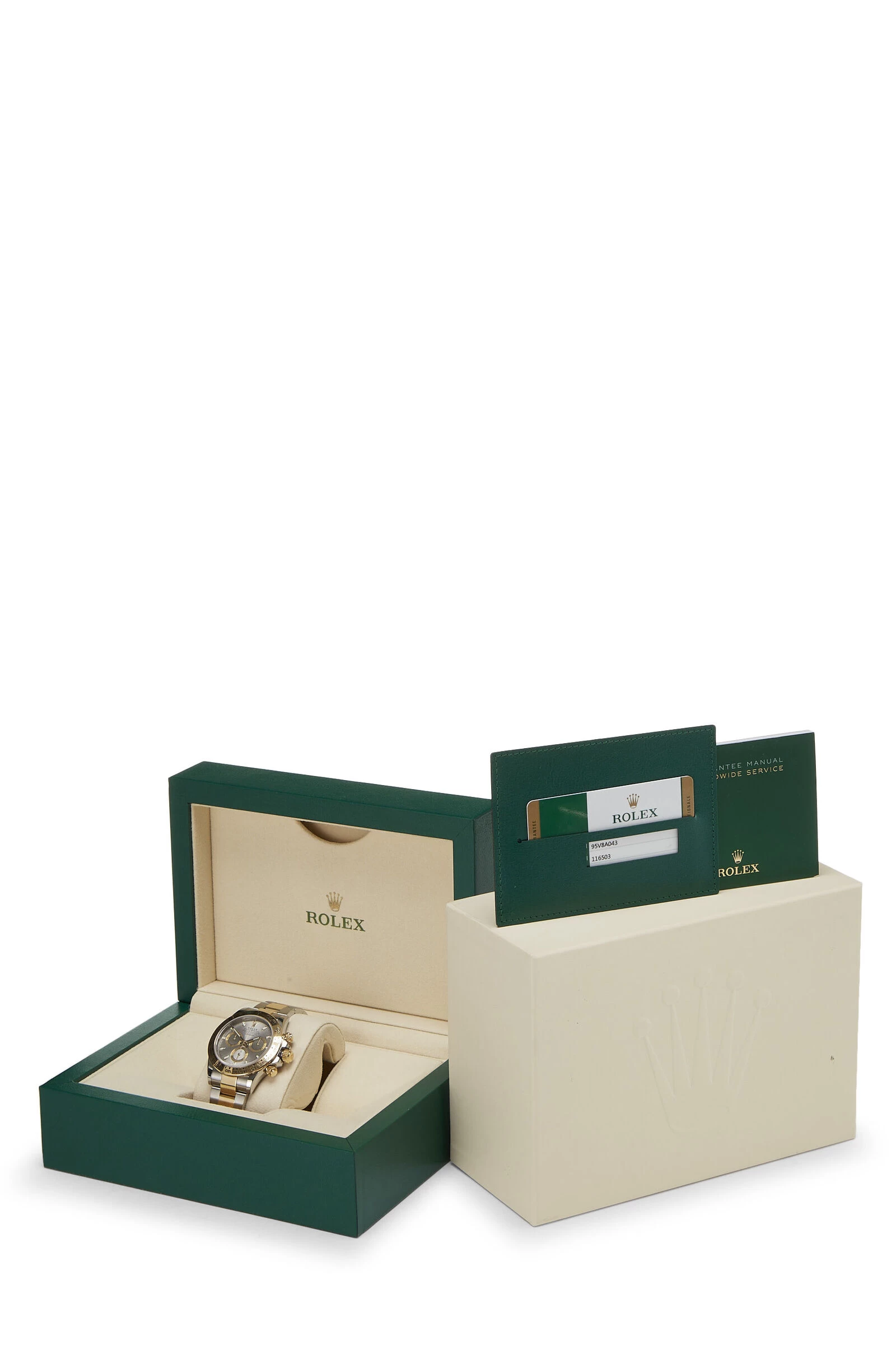 This Daytona Cosmograph watch features automatic 4130 movement, a stainless steel 40mm case with an 18k yellow gold engraved tachymeter bezel, scratch-resistant genuine sapphire crystal and inner reflector ring, a grey Chromalight display with seconds hand at 6 o’clock, 30 minute counter at 3 o’clock and 12 hour counter at 9 o’clock, finished with a stainless steel and 18k yellow gold Oyster bracelet and folding Oysterlock clasp. Includes branded box. Serial number 95VXXXXX.