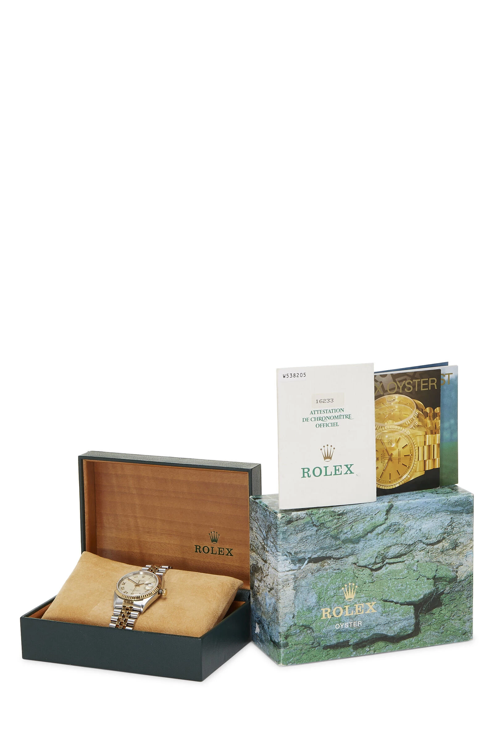 With impeccable craftsmanship and classic aesthetics, the Rolex Datejust watch is a timeless investment. First debuted in 1945, the Datejust watch features automatic 3135 movement, 36mm stainless steel Oyster case with an 18k yellow gold fluted bezel, scratch-resistant genuine sapphire crystal and a magnified Cyclops date window, a rare champagne Pyramid dial with 18k yellow gold Roman Numeral hour markers, finished with a stainless steel & 18k yellow gold Jubilee bracelet and Oyster clasp. Includes papers and branded box. Serial number: W52xxxx
