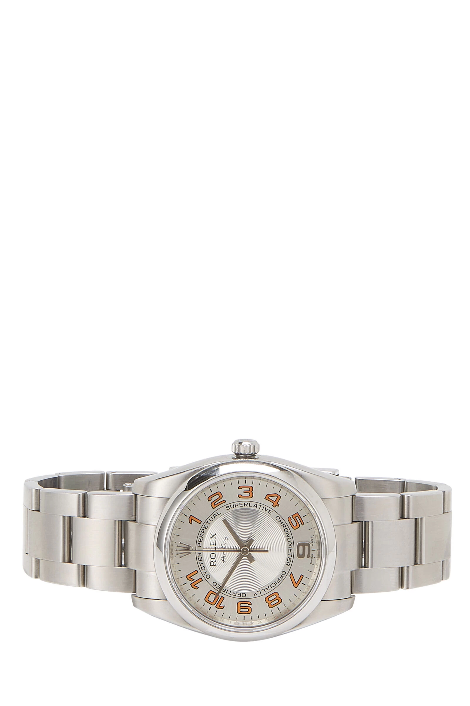 This Concentric Air-King Oyster Perpetual watch features automatic movement, stainless steel 34mm Oyster case with stainless steel smooth bezel and scratch-resistant sapphire crystal, a silver-tone dial with orange Arabic hour markers, and finished with a stainless steel Oyster bracelet and a folding Oysterclasp. Includes branded box and papers. Serial number M24xxxx
