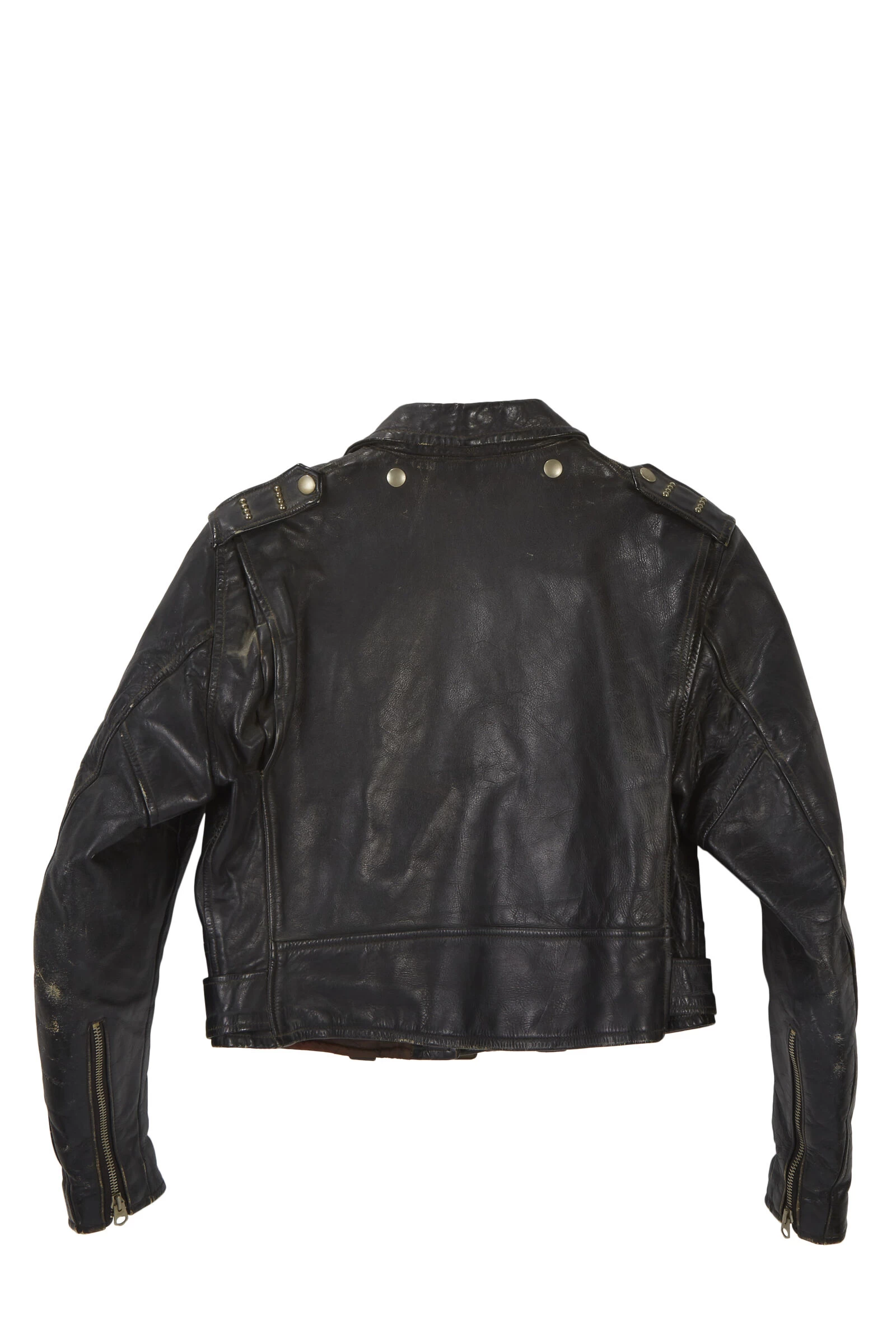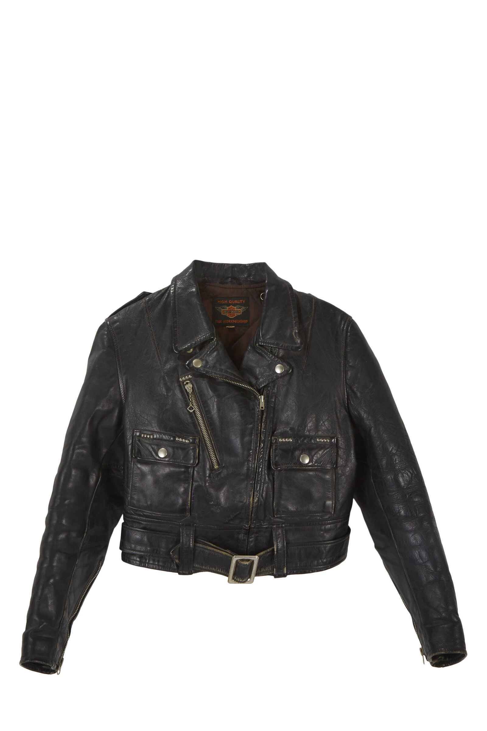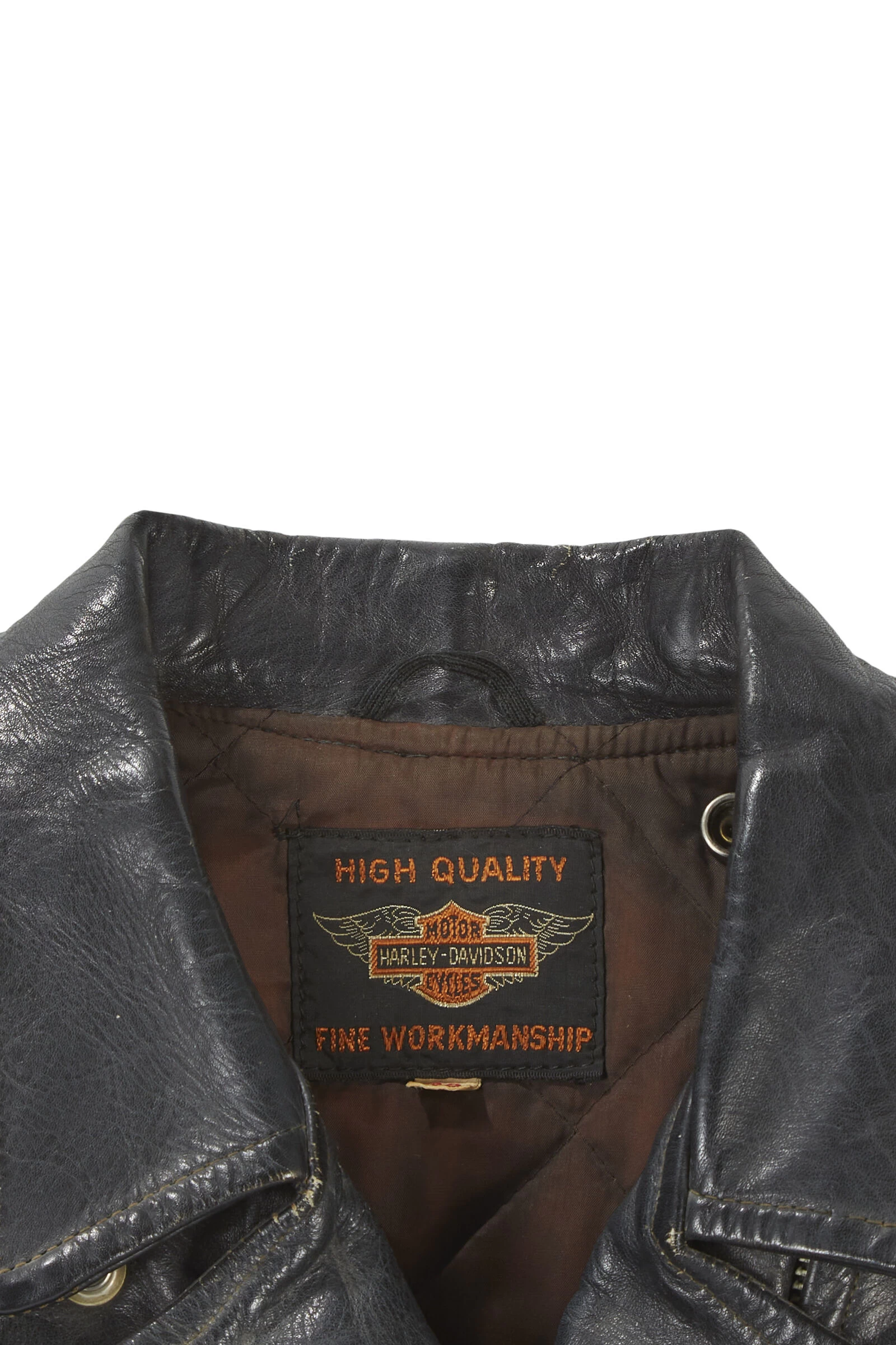 A vintage and highly collectible piece, this 1950s Harley Davidson jacket is crafted in black textured leather, featuring classic asymmetrical zip, notched lapels, and belted waist. The shoulders are adorned with studded epaulets and the front features three pockets with the same adornments.