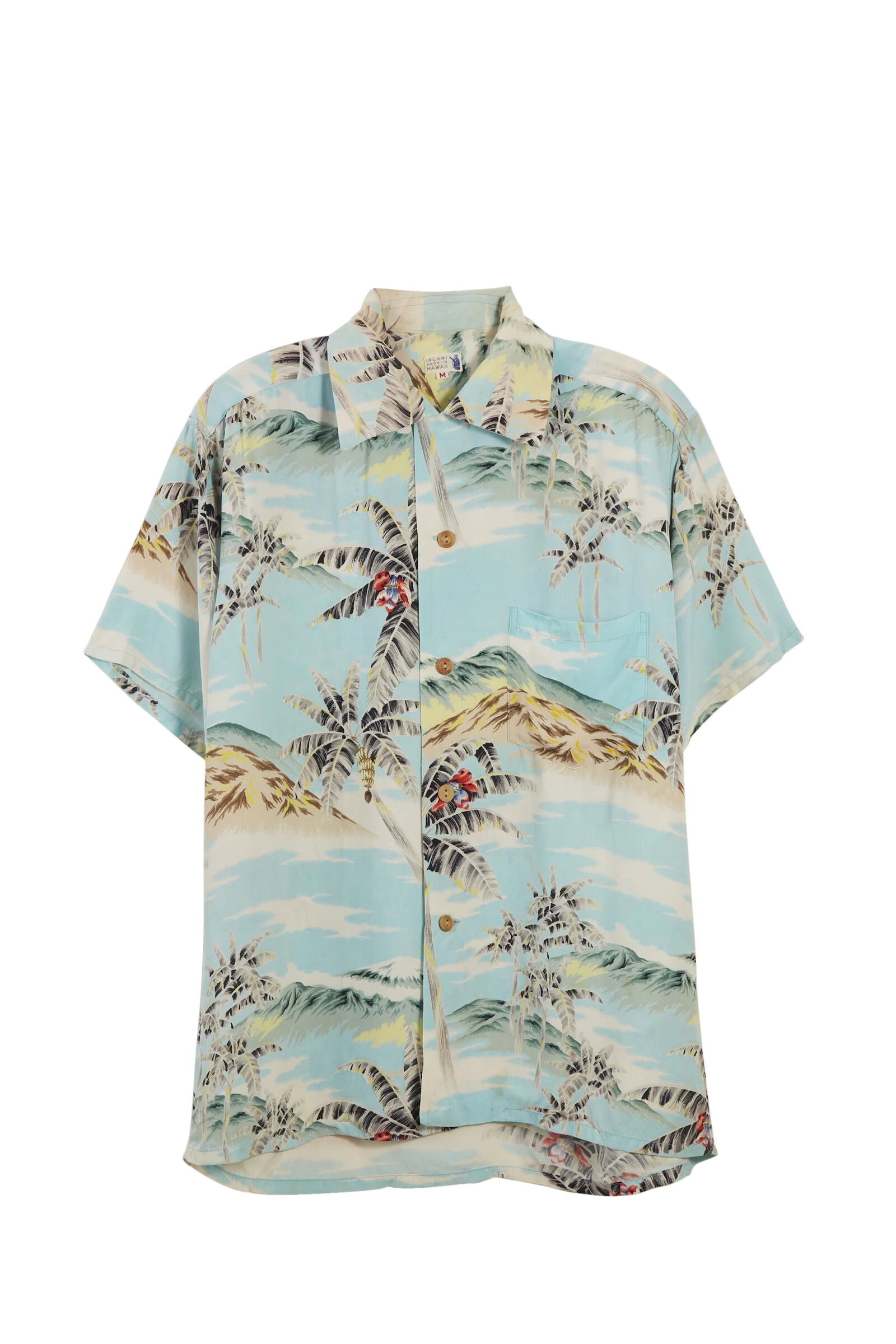 A Iolani original design, this classic Hawaiian shirt features a scenic beach pattern with coconut husk buttons.