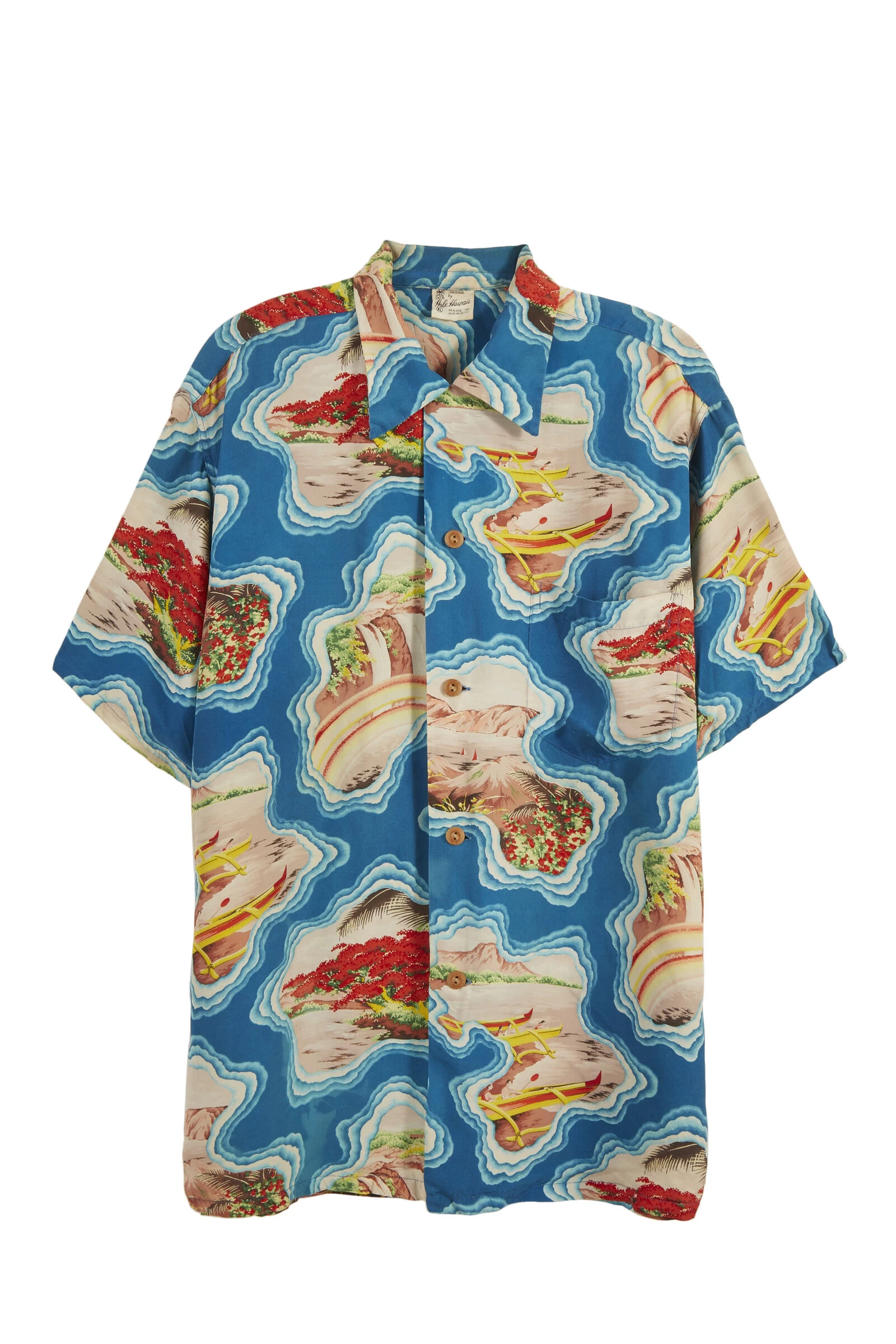 Hale Hawaii original shirt with a Hawaiian Island inspired pattern and coconut husk buttons.