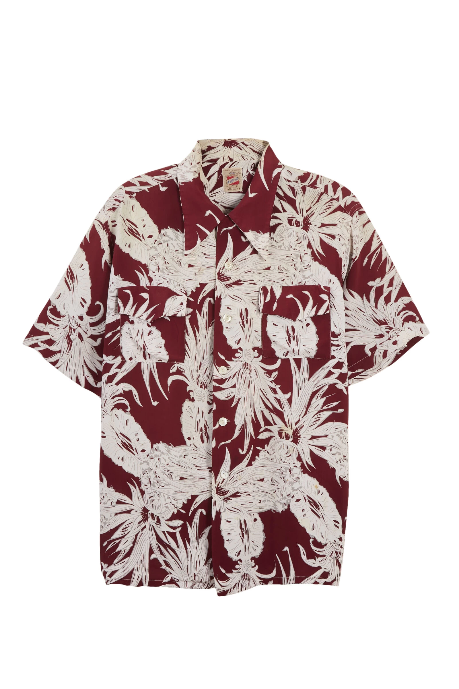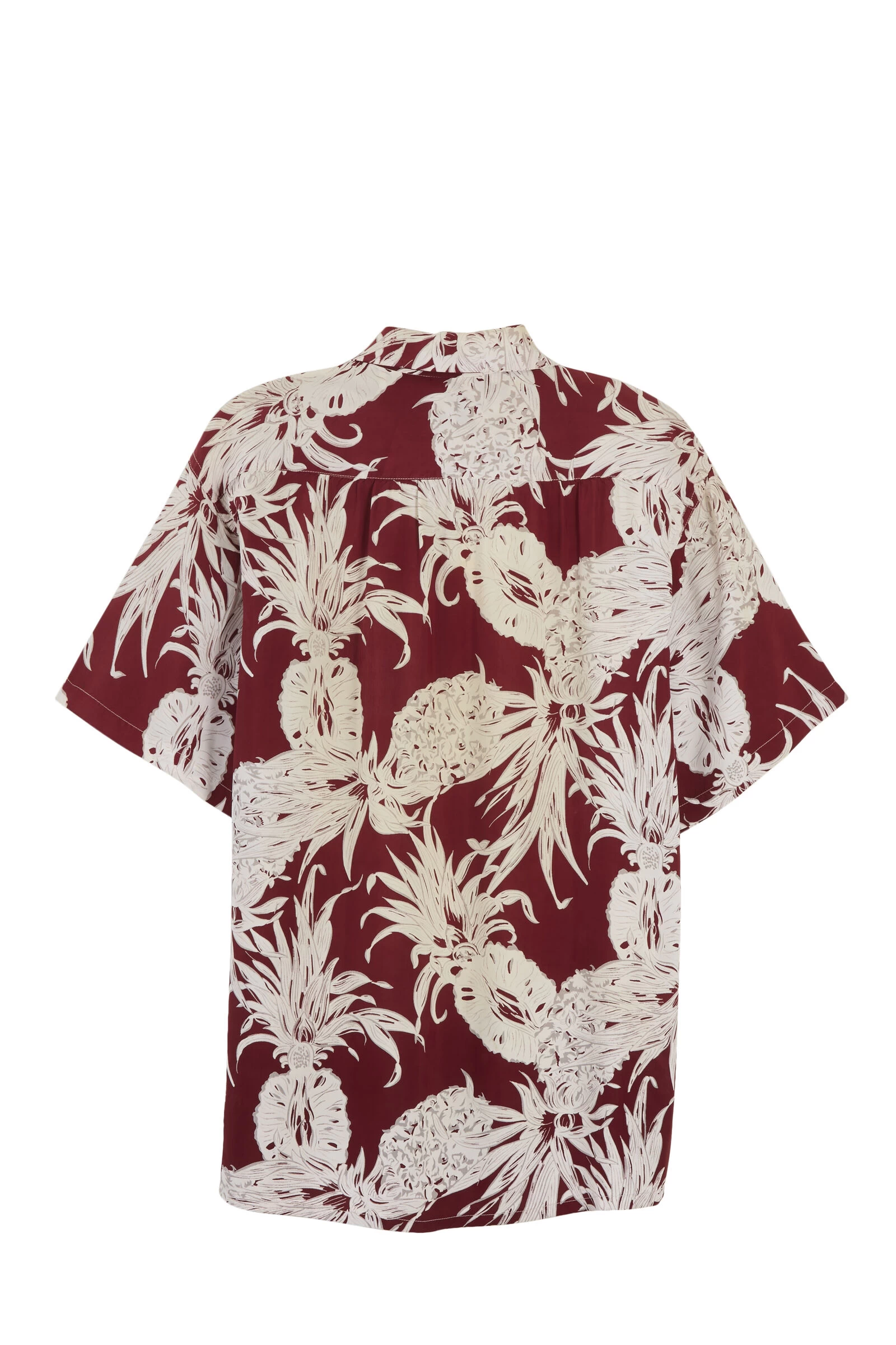Ashfield original Hawaiian shirt in burgundy with a white floral pattern throughout and dual flap patch pockets on the front.