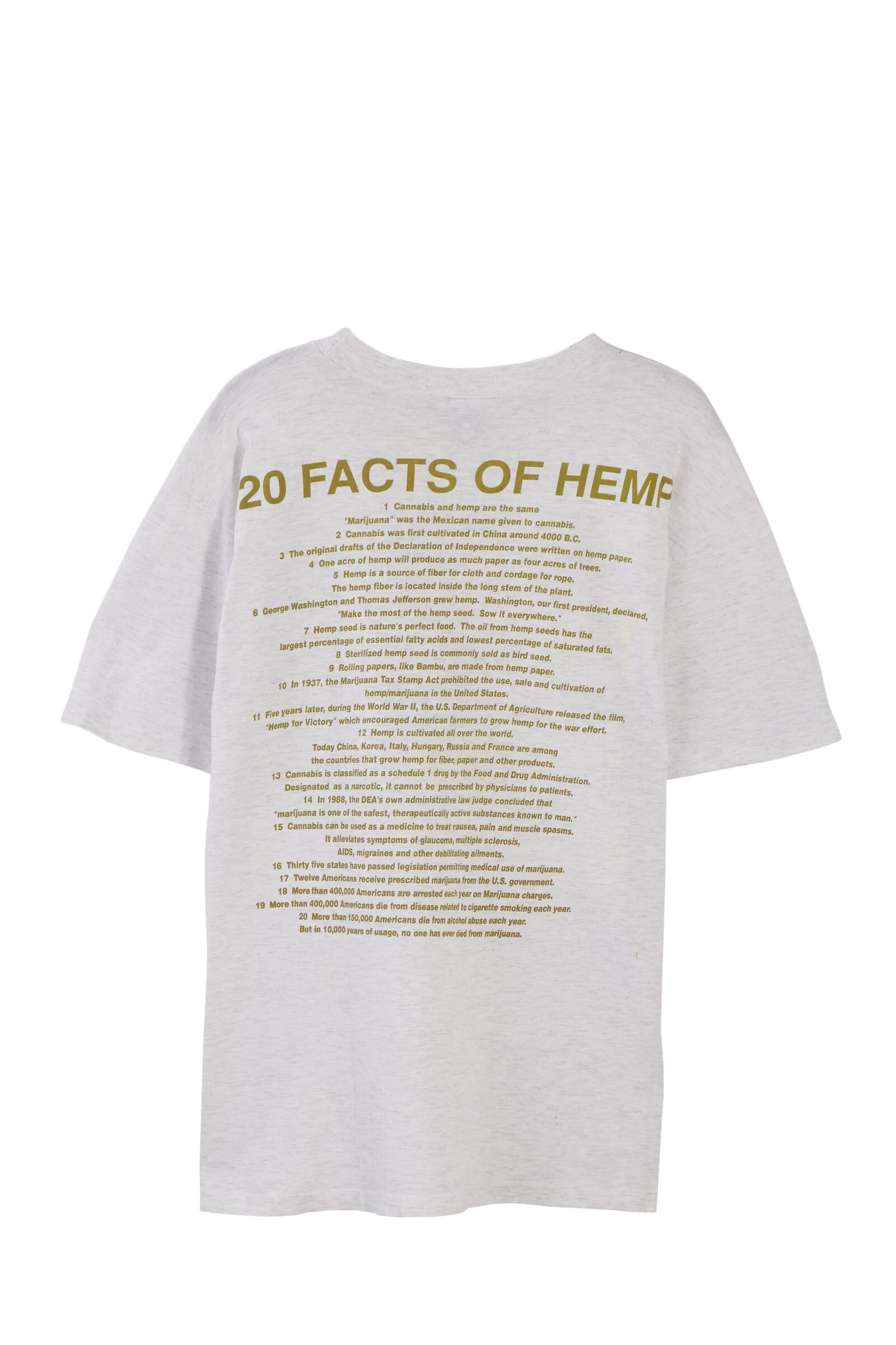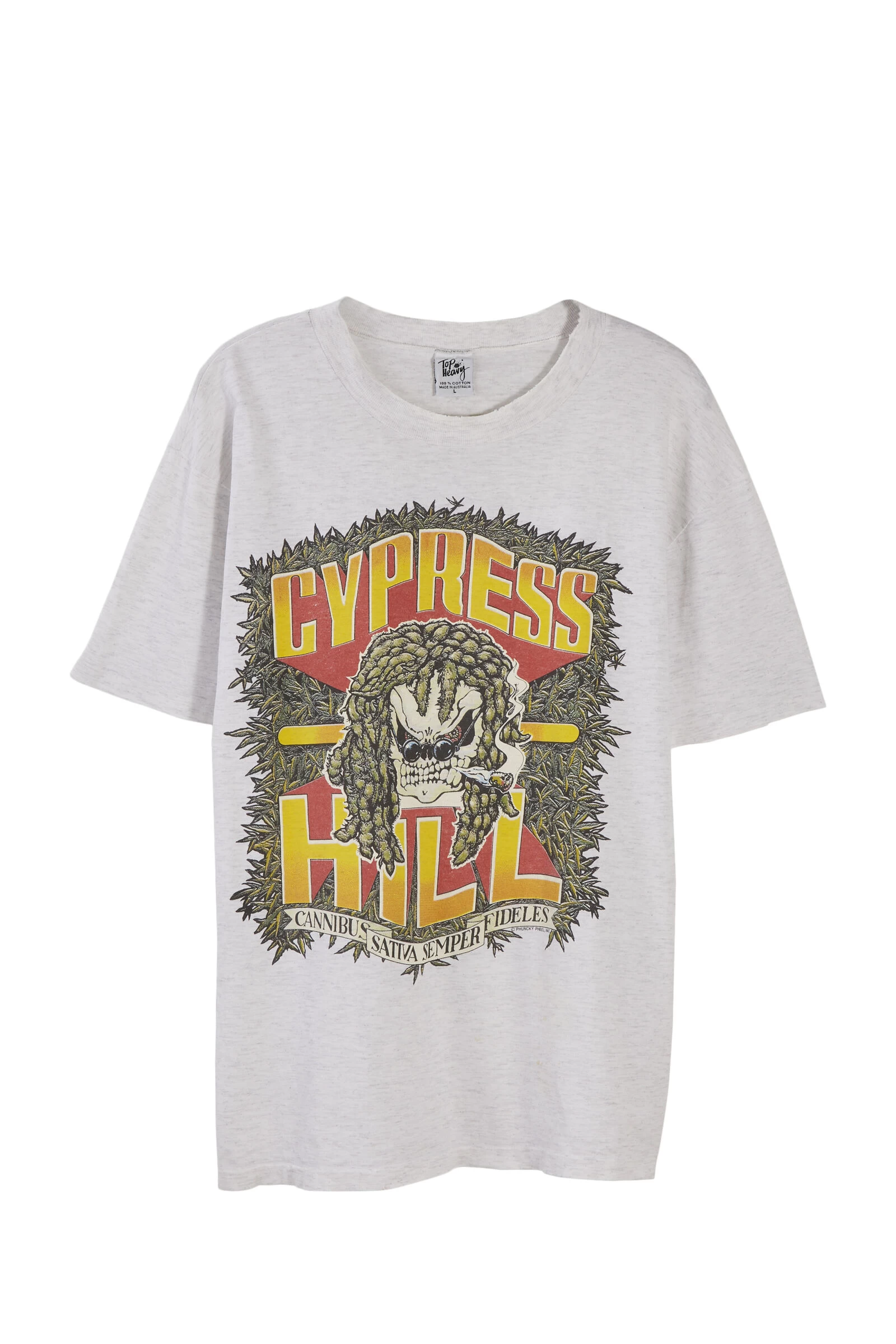 1992 Cypress Hill vintage tee featuring the group name on the front and multiple images and references to marijuana, including a list of facts on the reverse side.