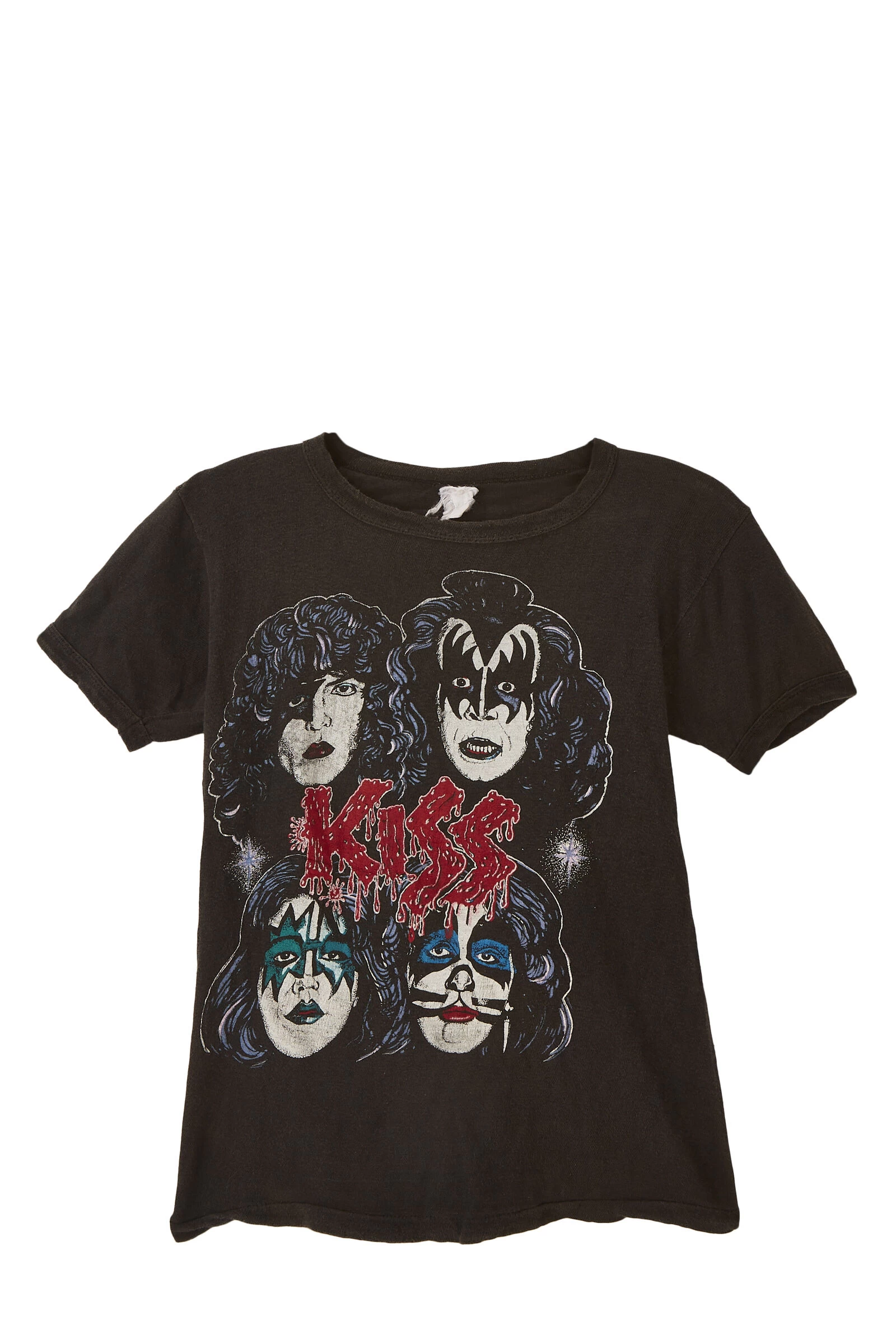 1980s Kiss tour graphic tee heralding ‘The Return of Kiss’ during their Dynasty Tour. The graphic tee features the four members of the band on the front of the shirt in their iconic makeup and the Kiss band name in dripping blood. The reverse side features the members in superhero regalia along with the statement, ‘The Return of Kiss.’