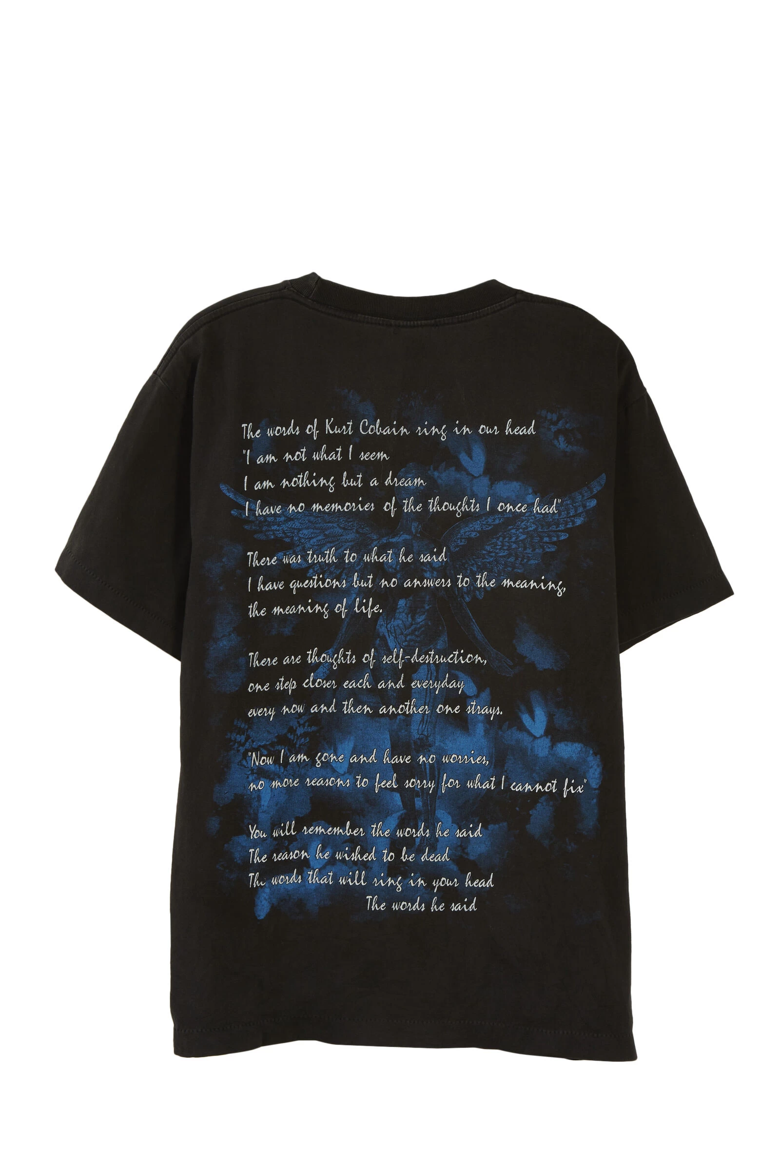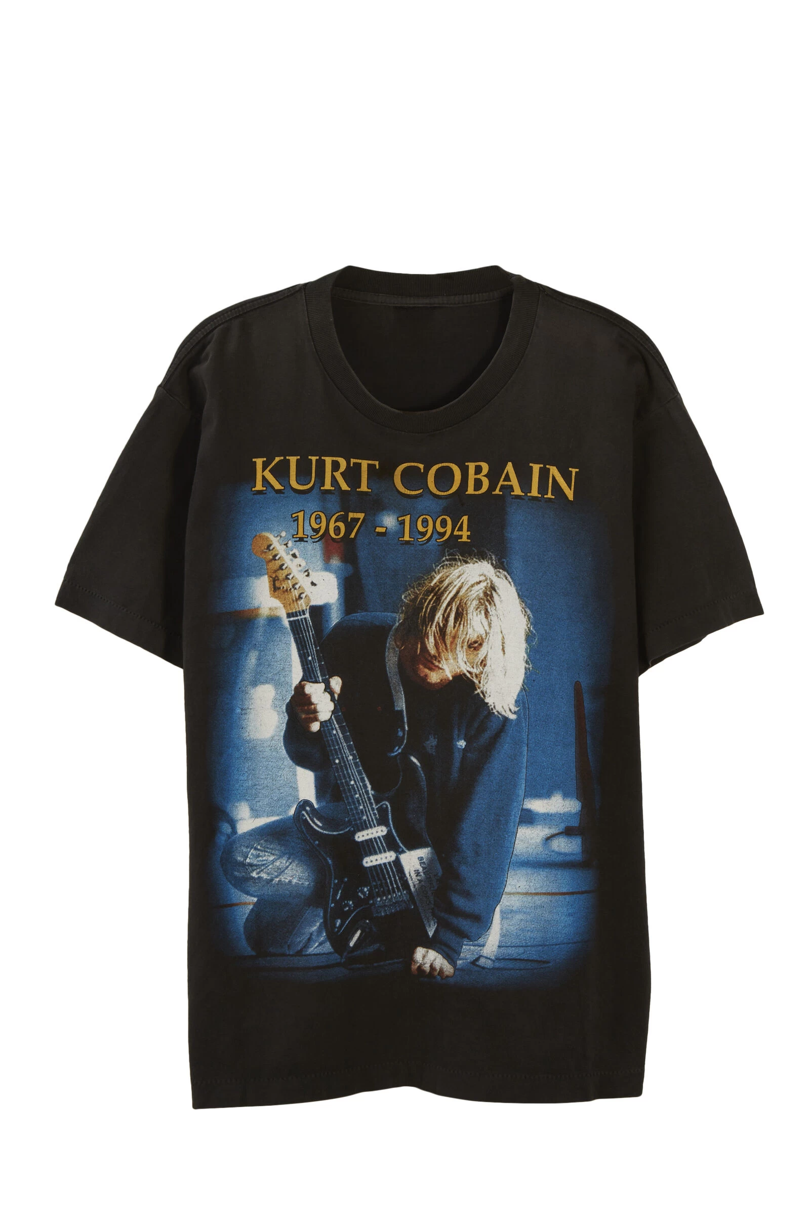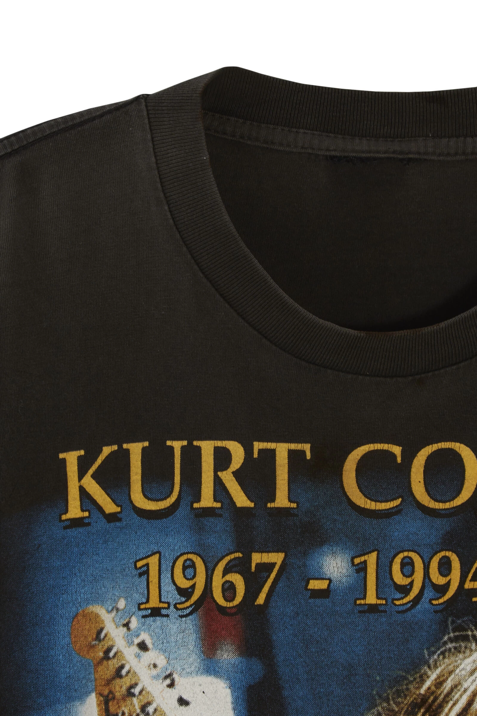 1994 black Kurt Cobain graphic tee. This vintage tee features a image of Kurt Cobain a former member of the group Nirvana, his name, the year he was born, the year he died, along with a graphic image and a poem dedicated to the late singers.